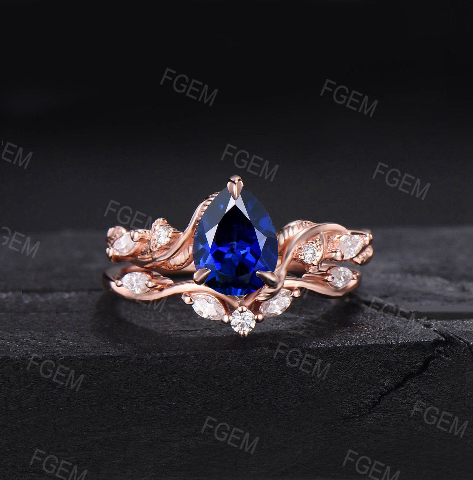 1.25ct Nature Inspired Blue Sapphire Diamond Engagement Ring Set Twist Band Moissanite Wedding Ring Leaf Vine Branch Blue Sapphire Bridal Set