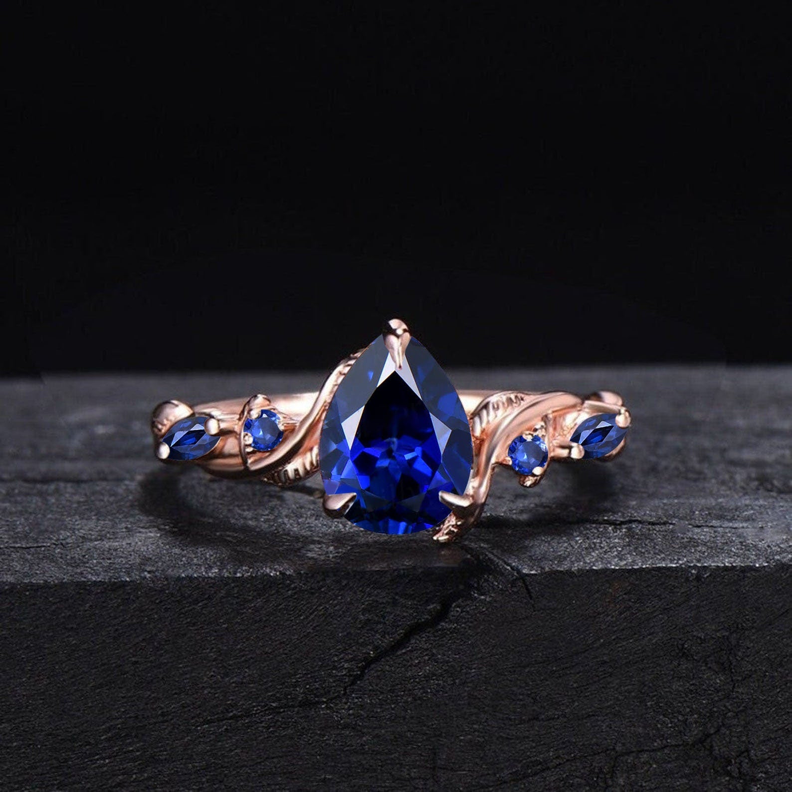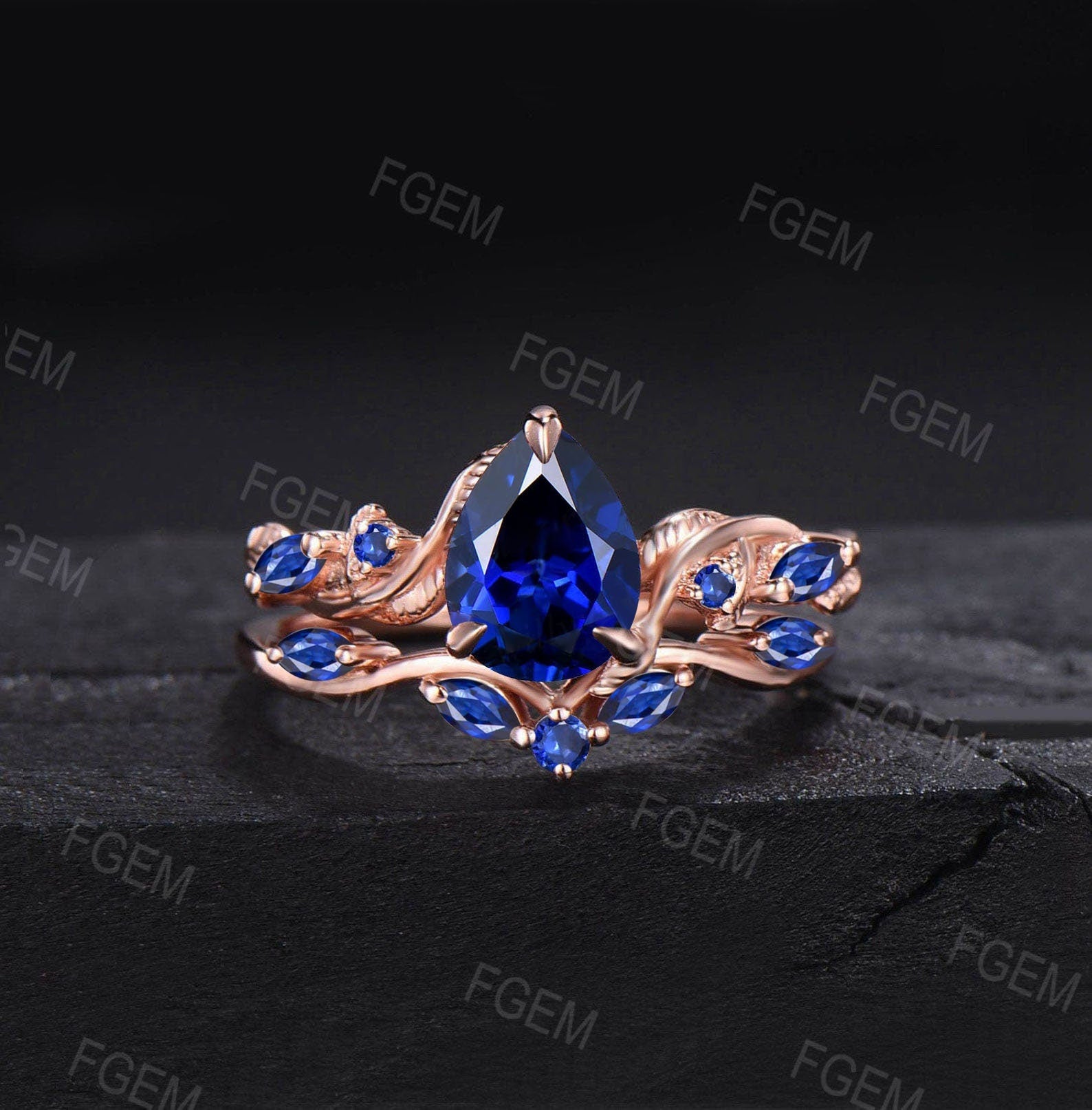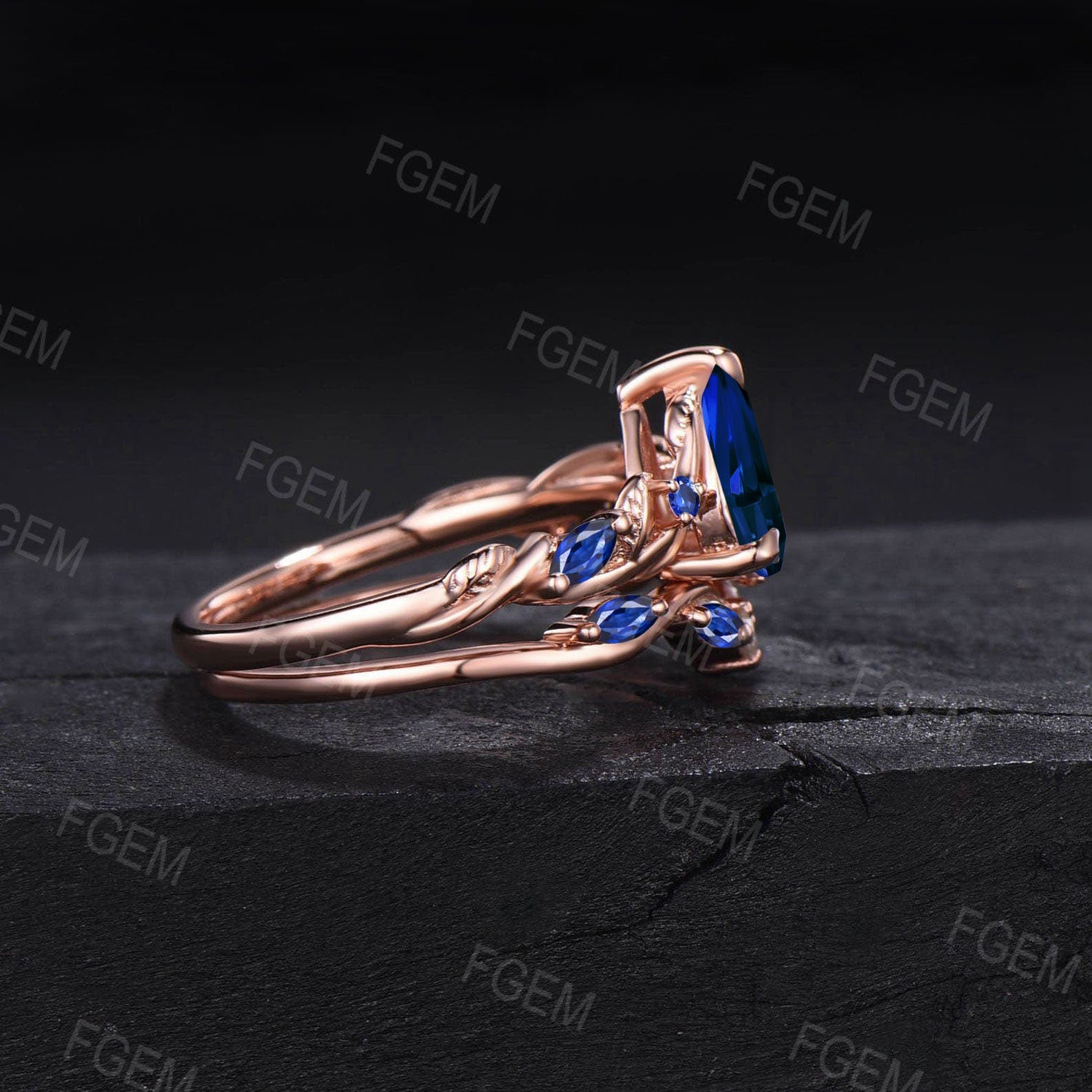 1.25ct Pear Nature Inspired Blue Sapphire Engagement Ring Twist Band September Birthstone Wedding Ring Set Leaf Vine Ring Branch Bridal Set