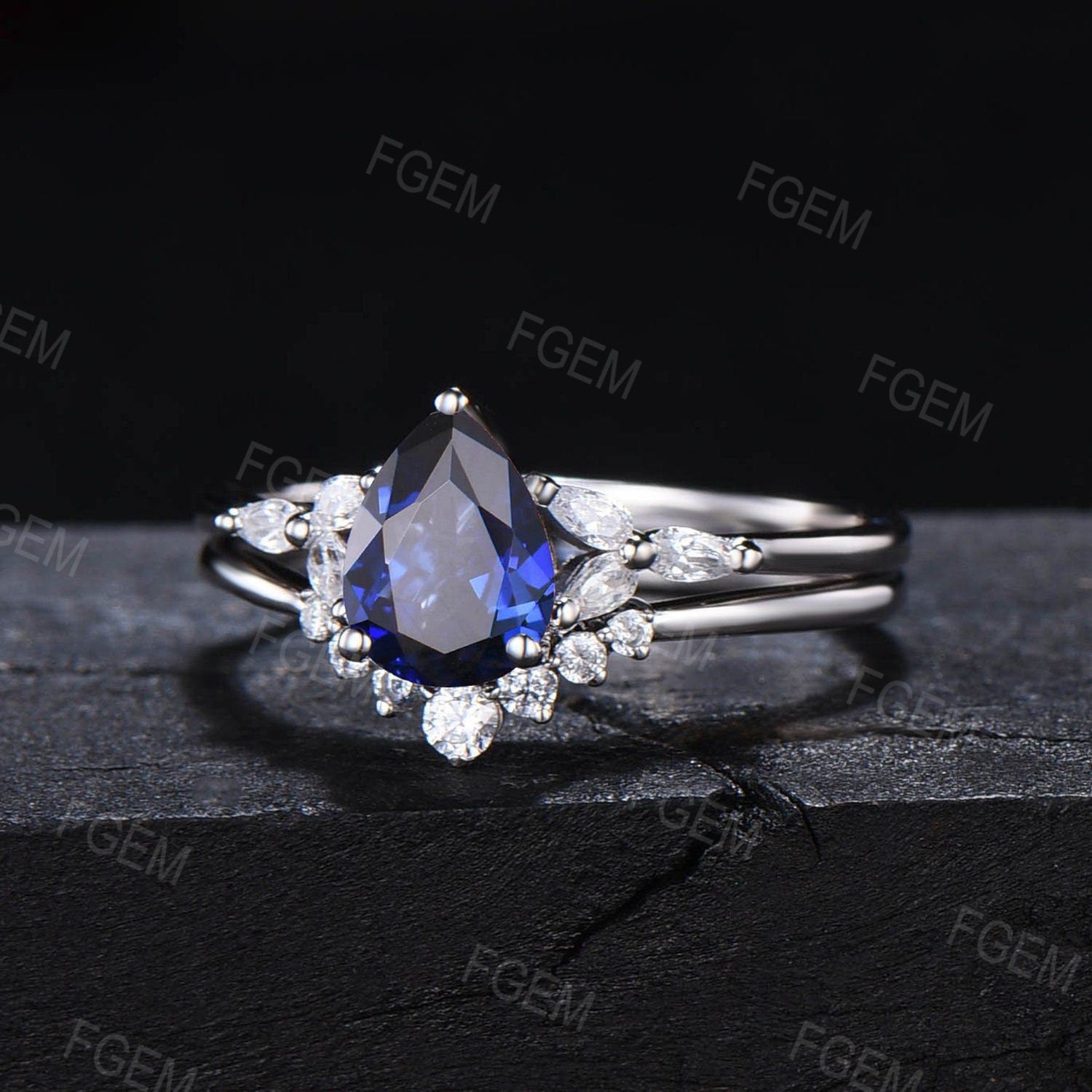 1.25ct Pear Shaped Blue Sapphire Ring for Ladies in Sterling Silver Royal Blue Sapphire Bridal Ring Set September Birthstone Jewelry Gifts