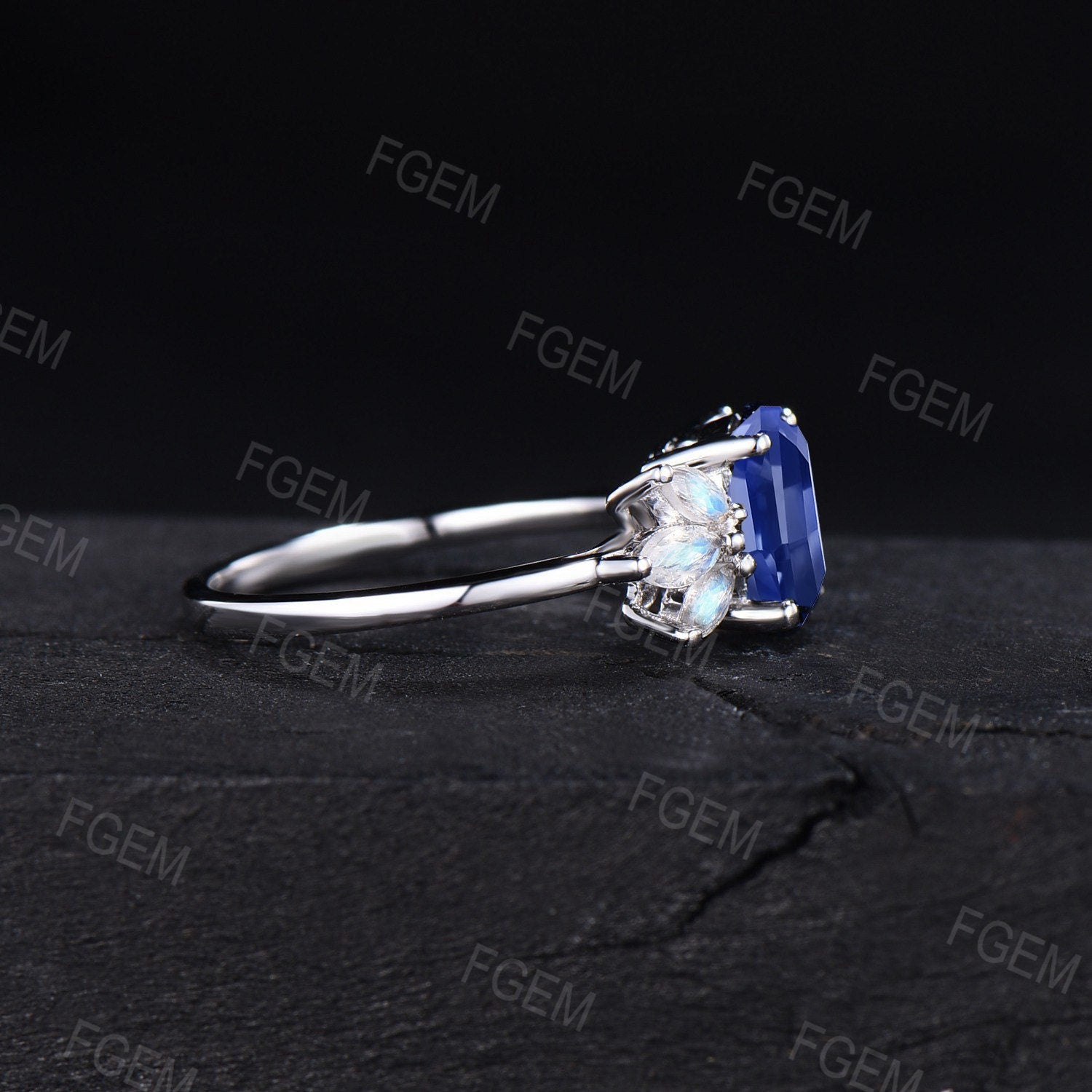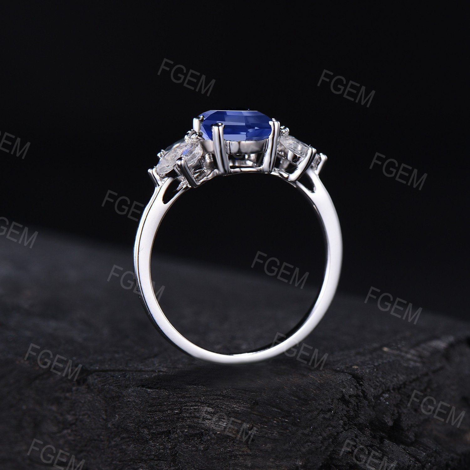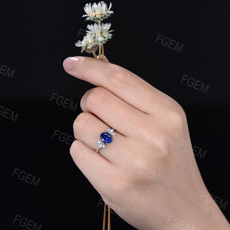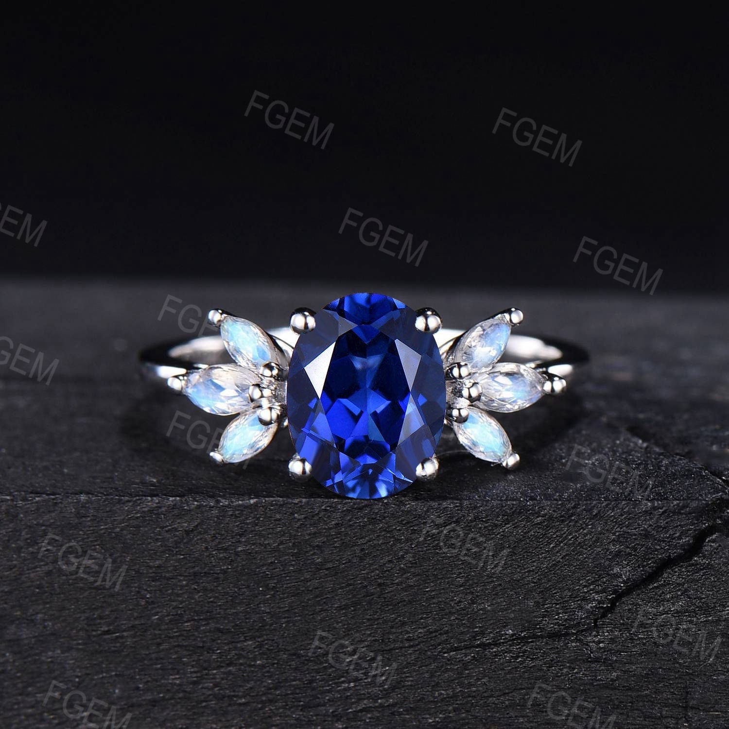 1.5ct Oval Blue Sapphire Ring White Gold Platinum Marquise Moonstone Ring Blue Gemstone Cluster Engagement Ring September Birthstone Gifts