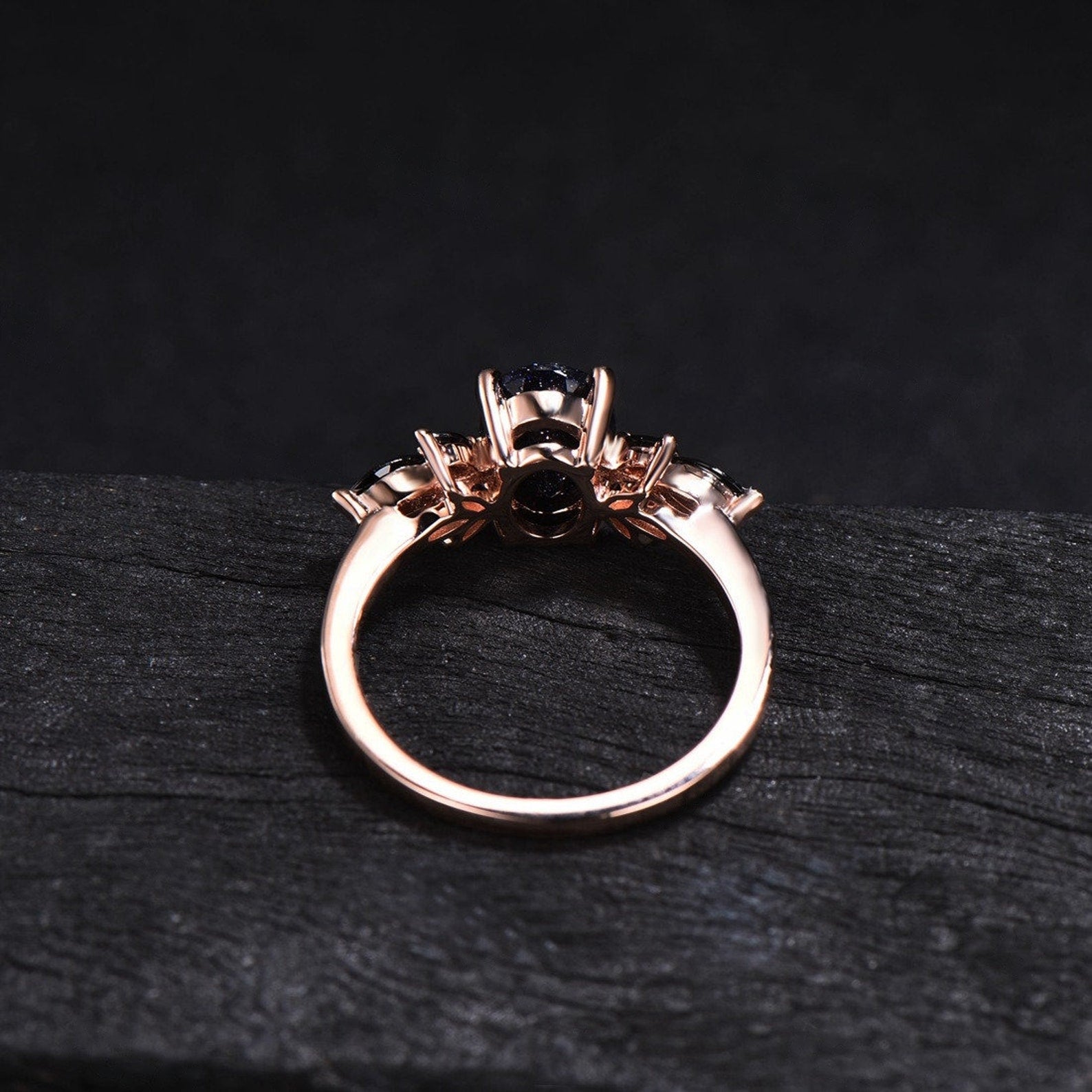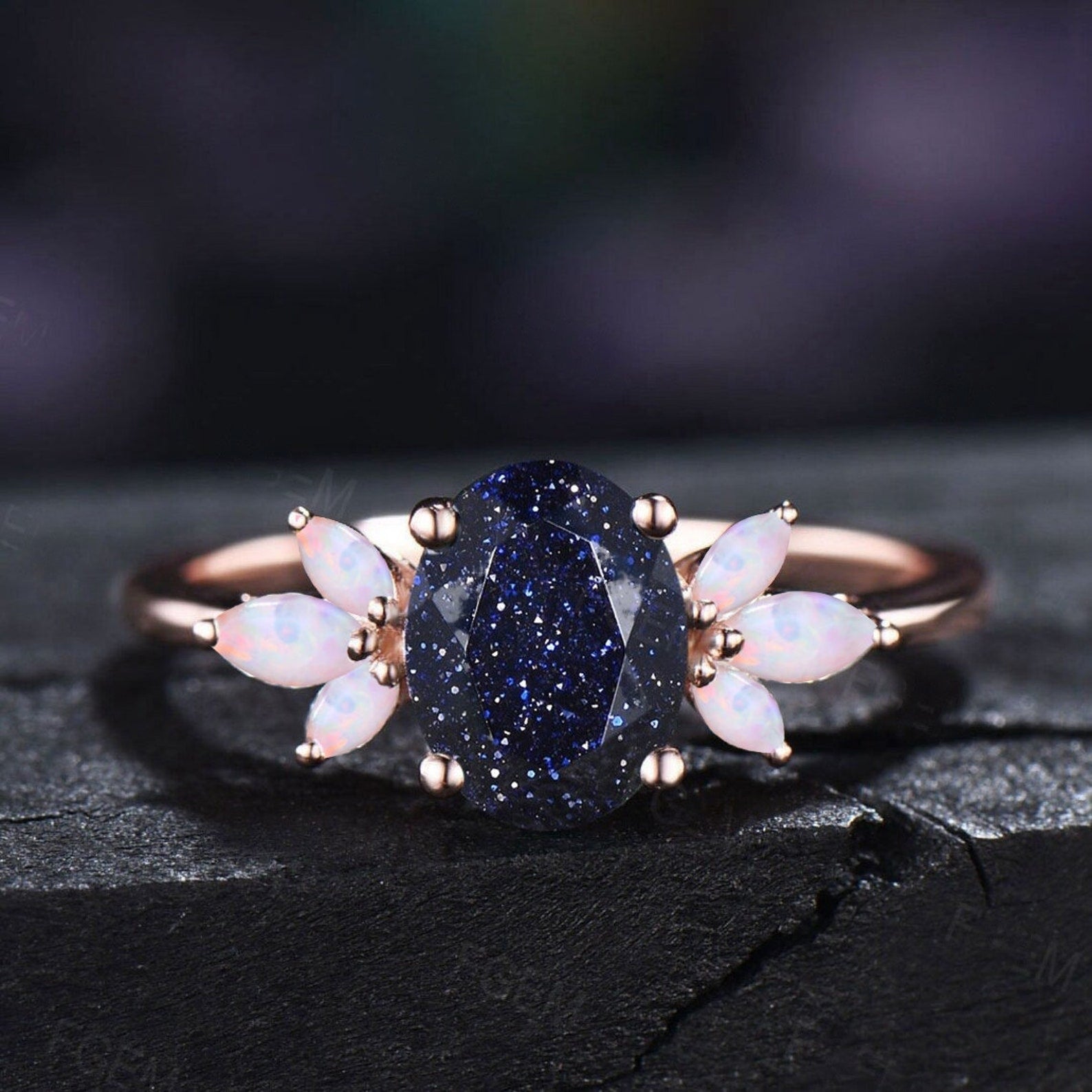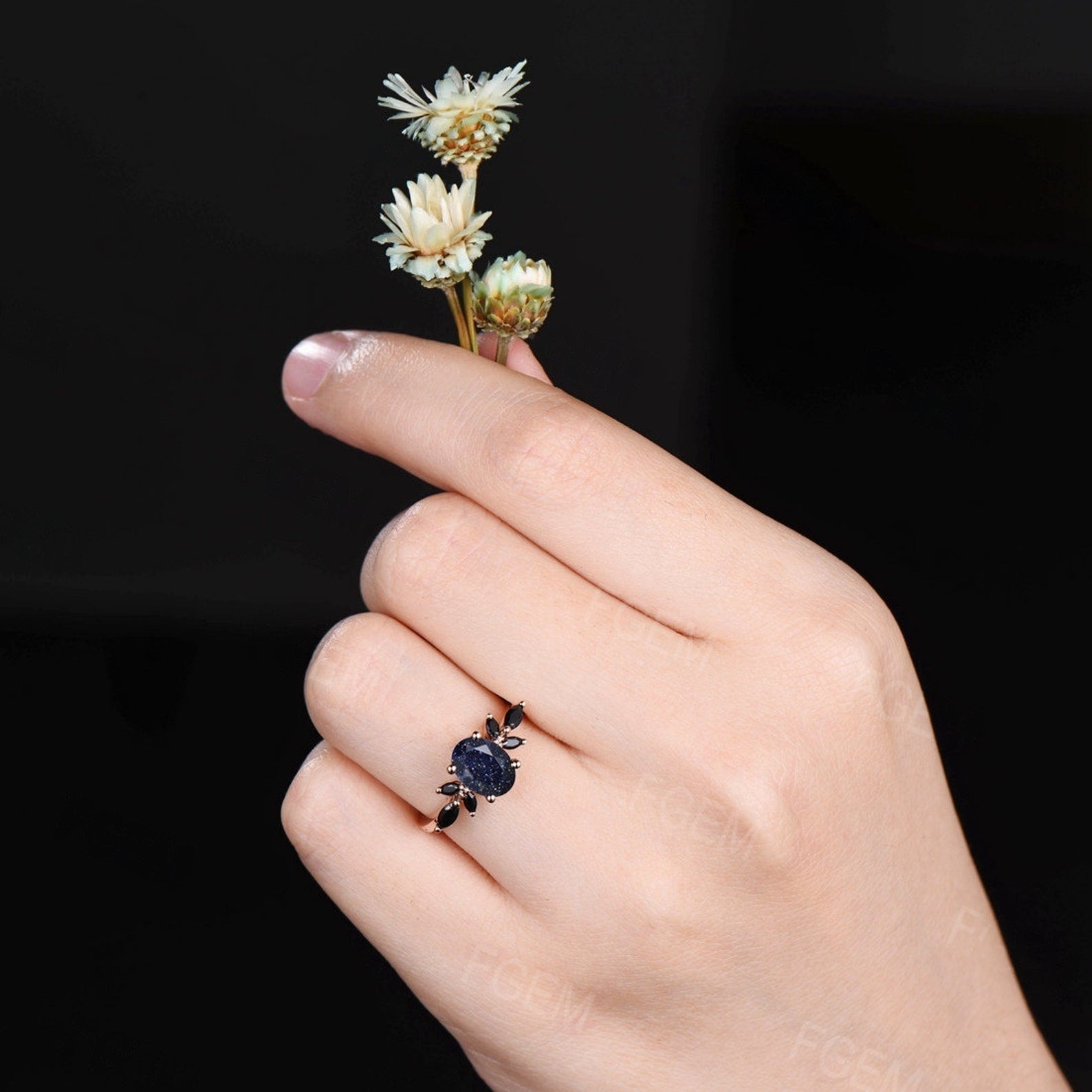 1.5ct Oval Cut Blue Sandstone Cluster Engagement Rings Galaxy Starry Sky Ring Black Gemstone Ring Unique Handmade Proposal Gifts for Women
