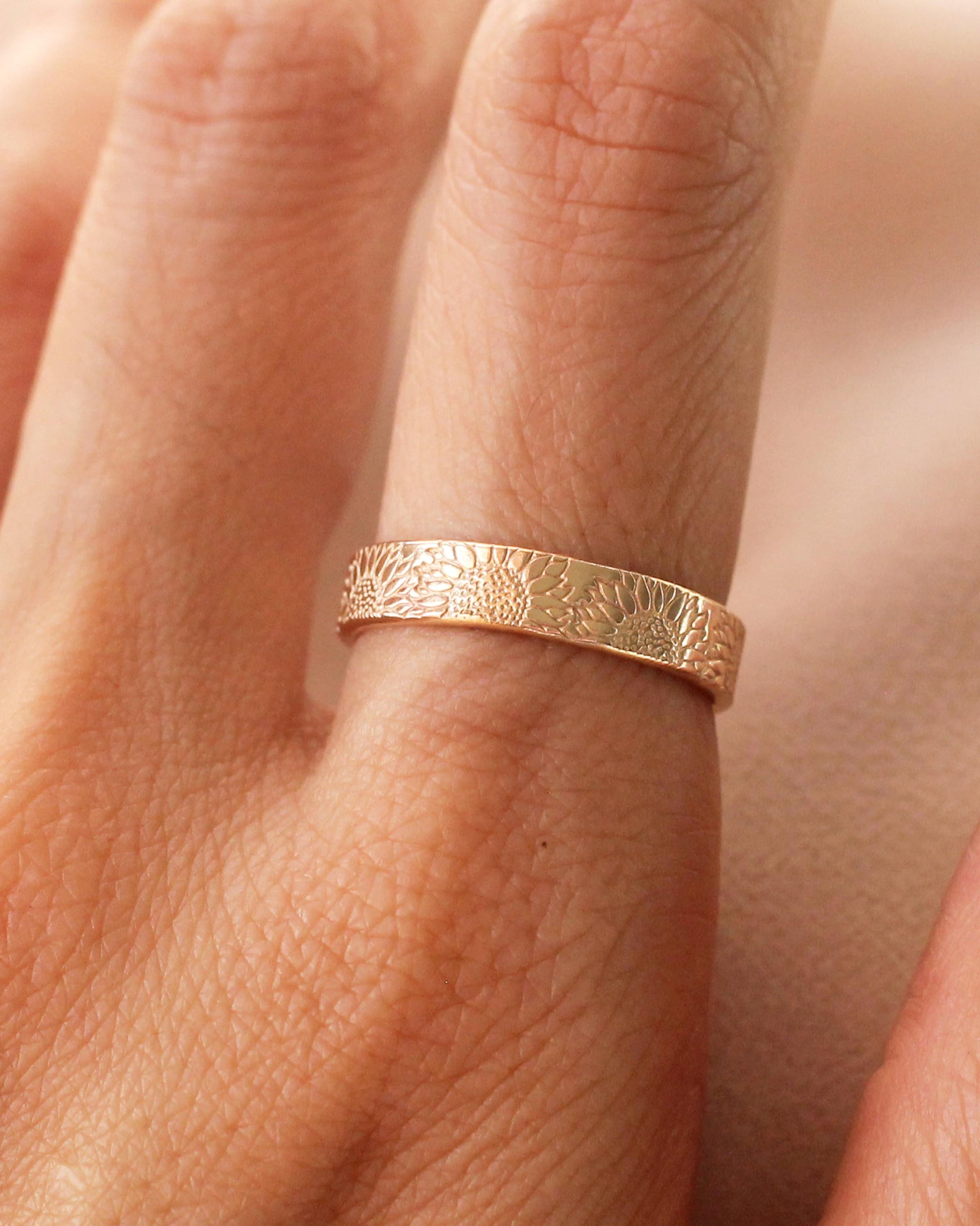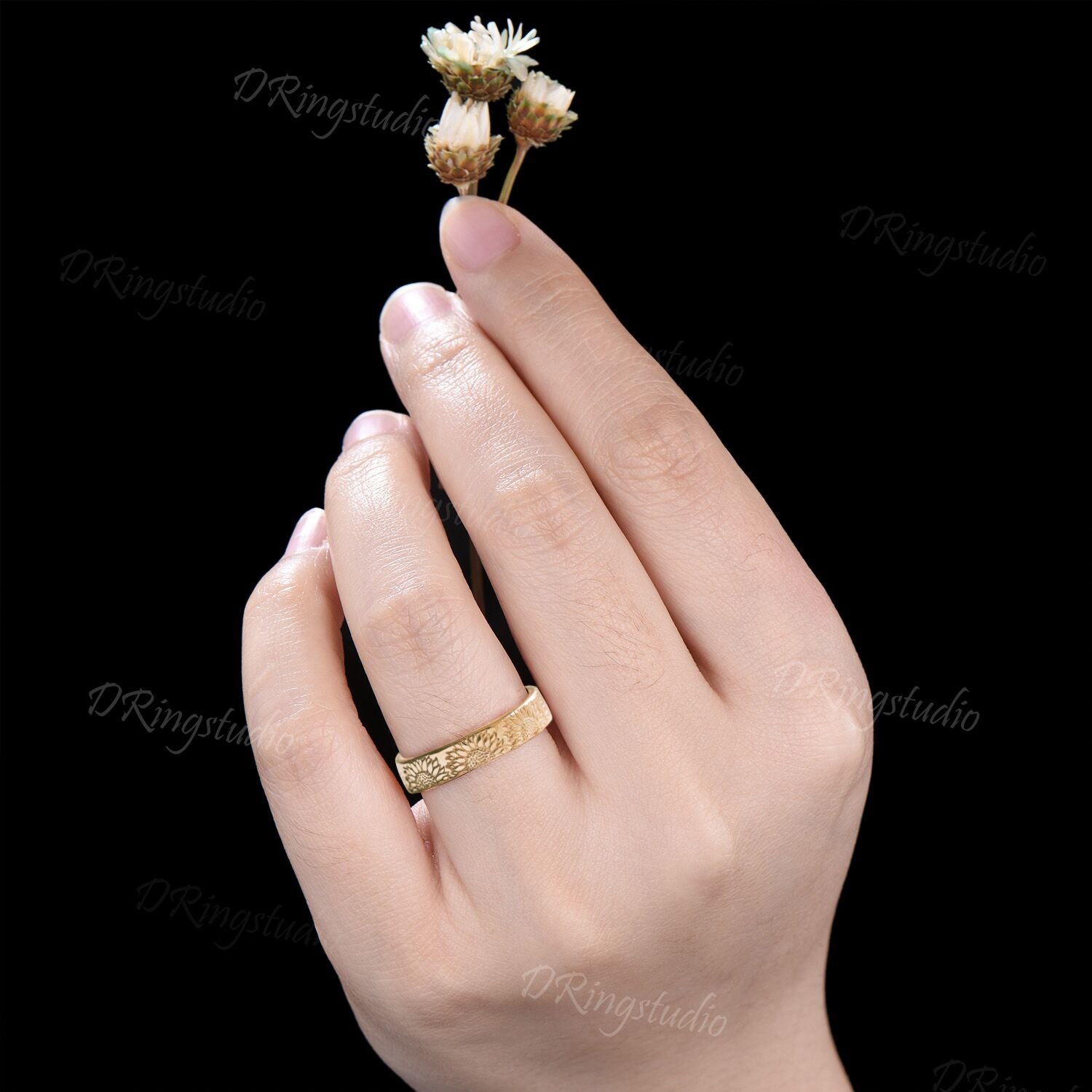 10K Gold Sunflower Ring Pattern Engrave Wedding Ring 4mm/5mm/6mm Mens Promise Bridal Ring Birth Flower Ring Plain Band Ring Floral Jewelry