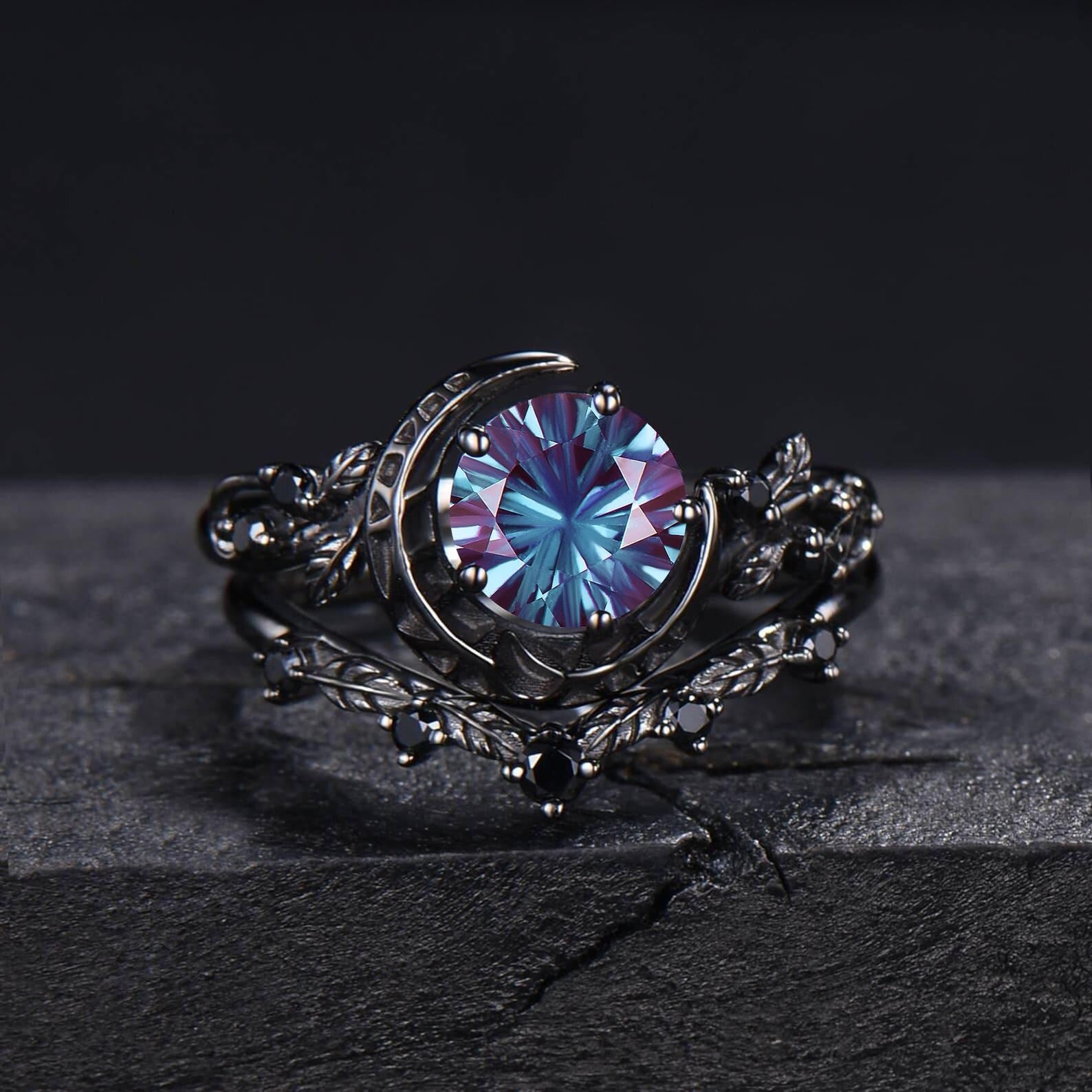 1ct Fireworks Cut Color-Change Alexandrite Black Moon Bridal Ring Set Black Gold leaf Vine Black Spinel Round Engagement Ring Gift for Women