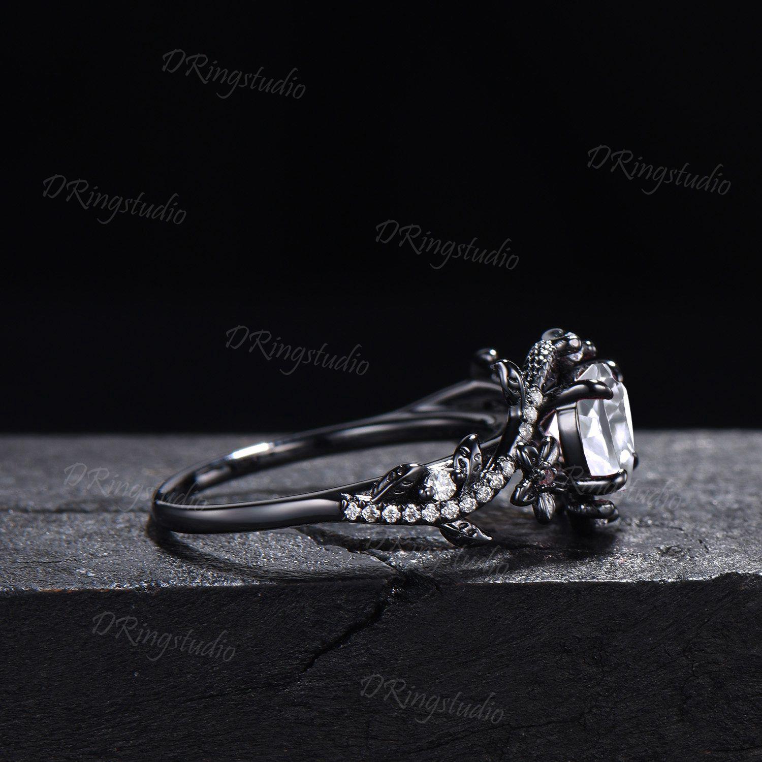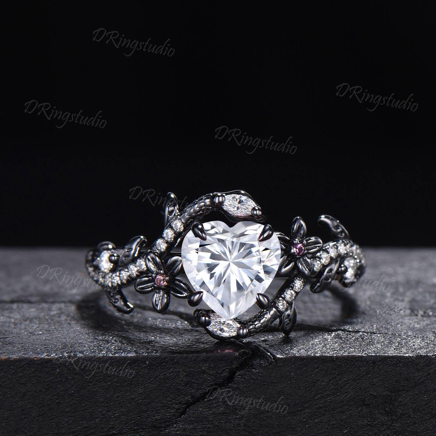 1CT Heart Cut Moissanite Engagement Ring Black Gold Double Snake Ring Cluster Moissanite Diamond Ring Black Flower Wedding Ring Women Gift