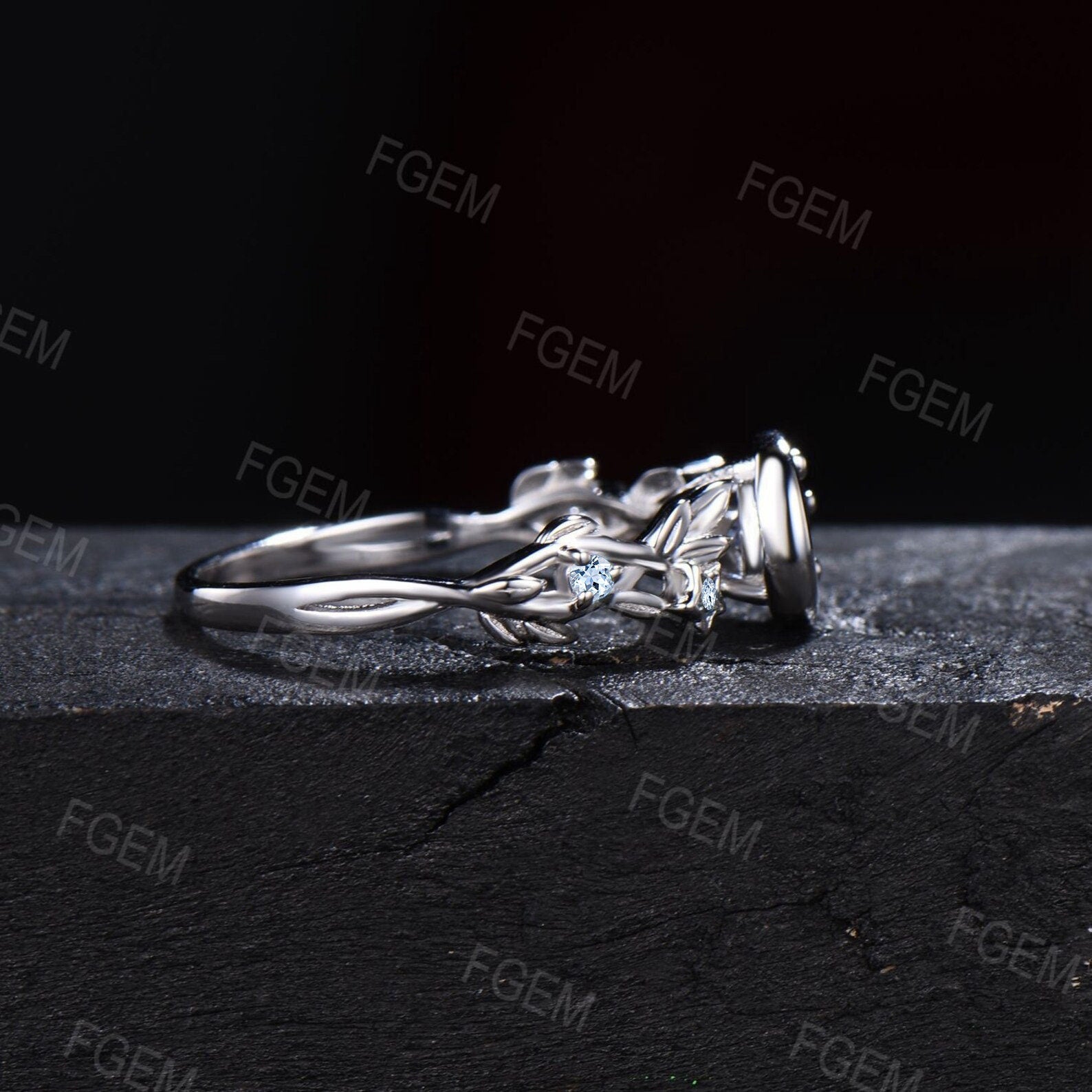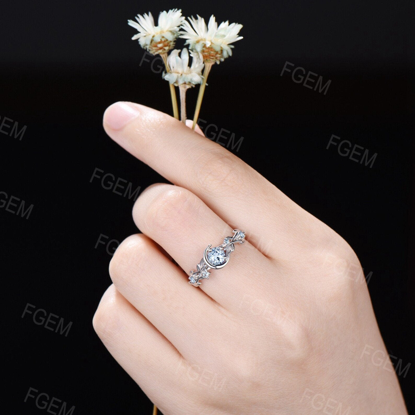 5mm Round Natural Light Blue Aquamarine Engagement Ring Moon Star Wedding Ring White Gold Nature Inspired Leaf Vine Blue Aquamarine Ring Promise Gift