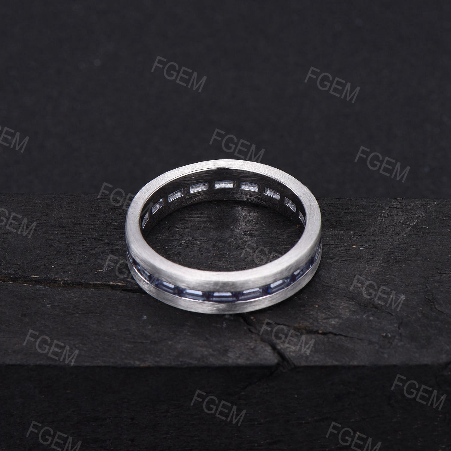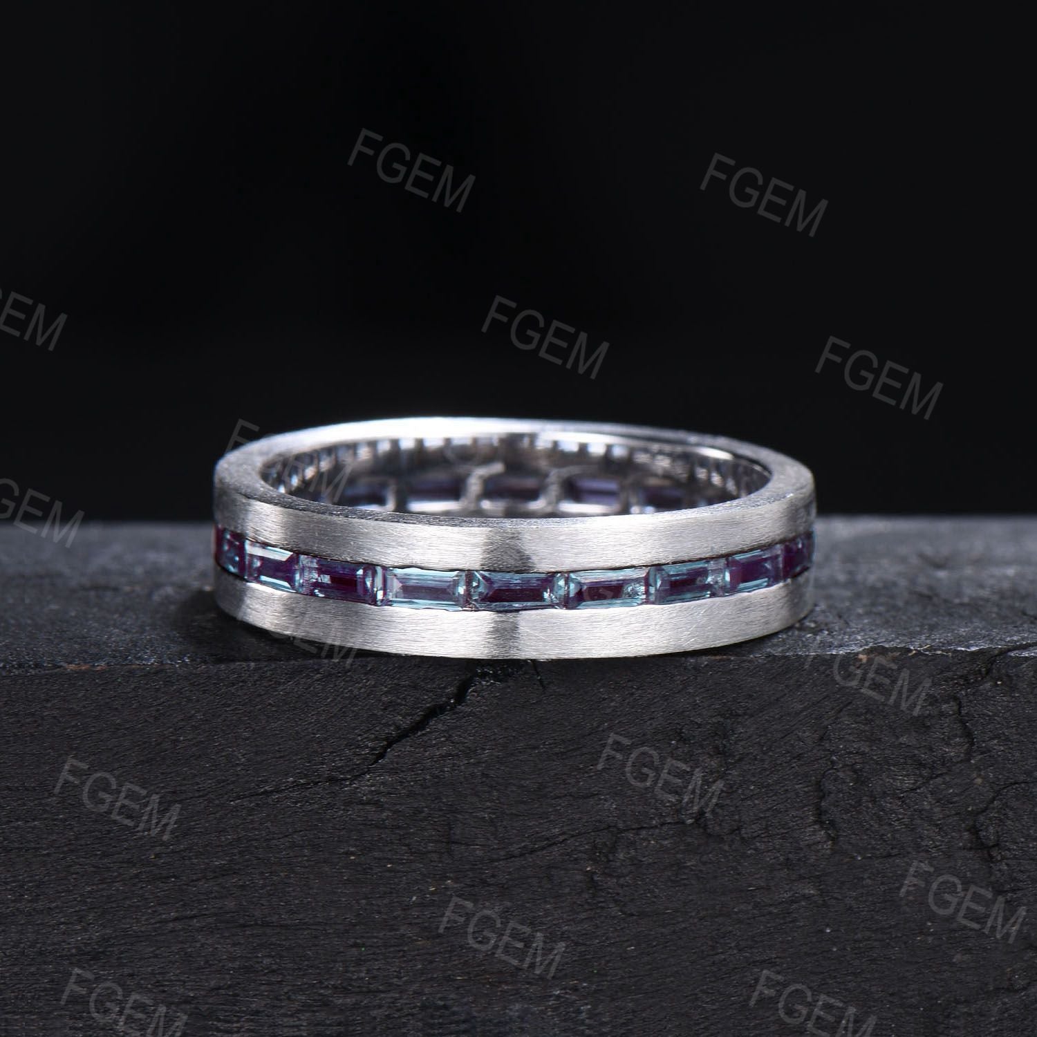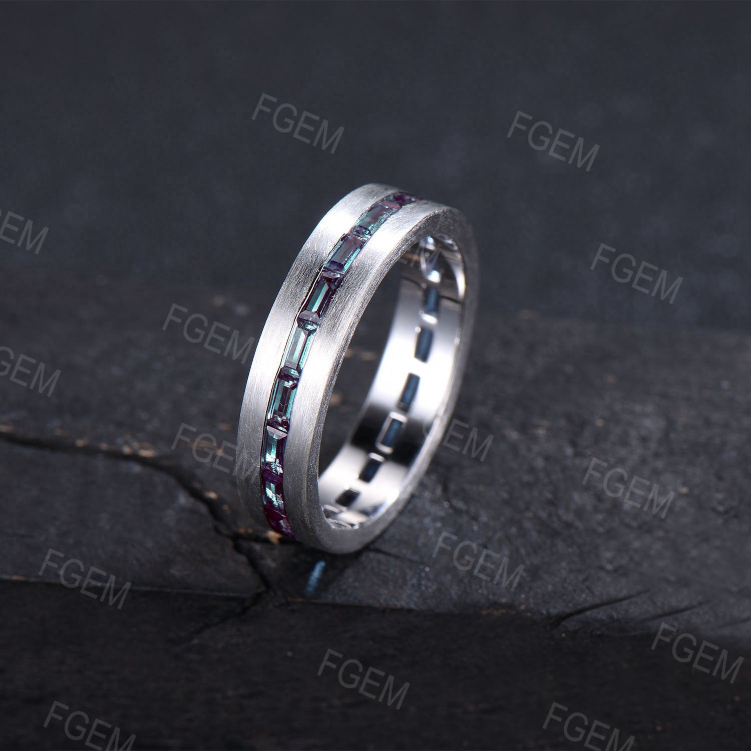 6mm Mens Baguette Alexandrite Wedding Ring 14K Rose/Black Gold Color-Change Alexandrite Matte Brushed Band Pave Set Full Eternity Band Men