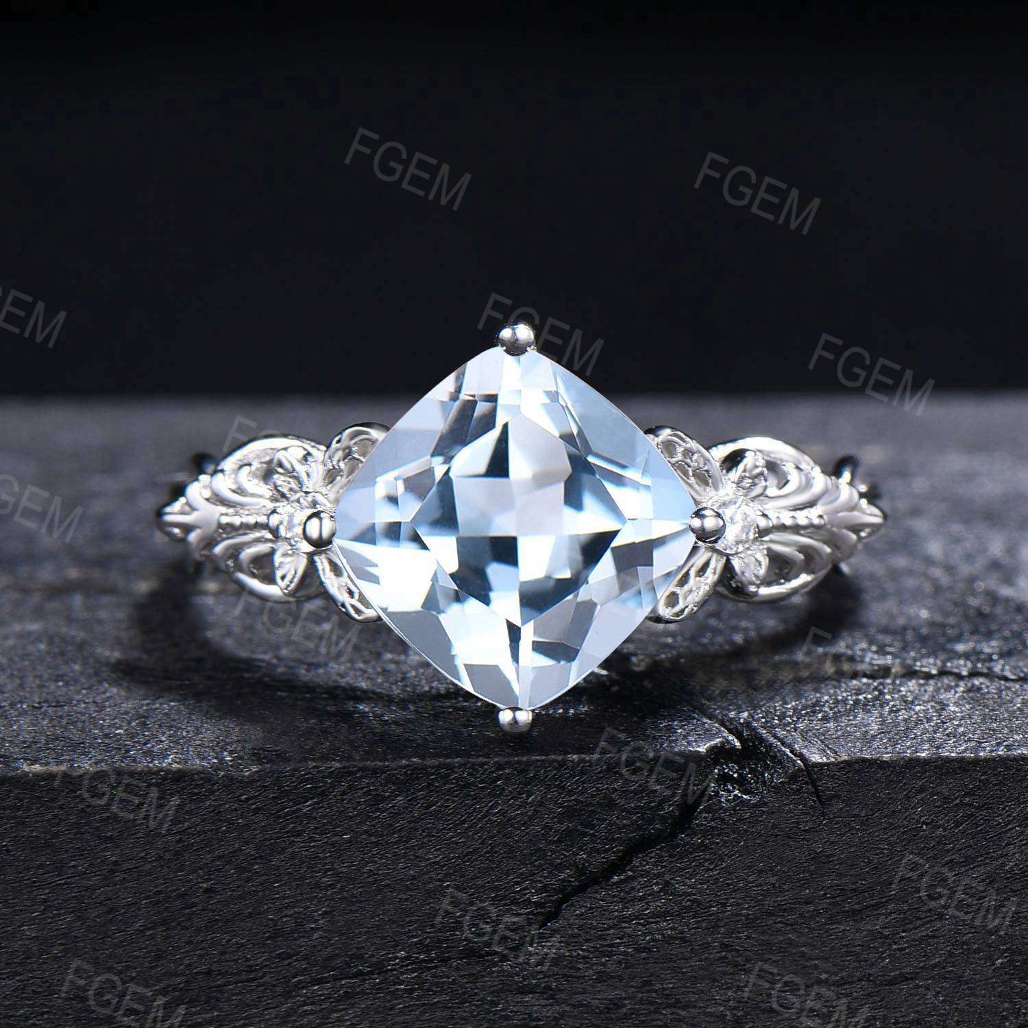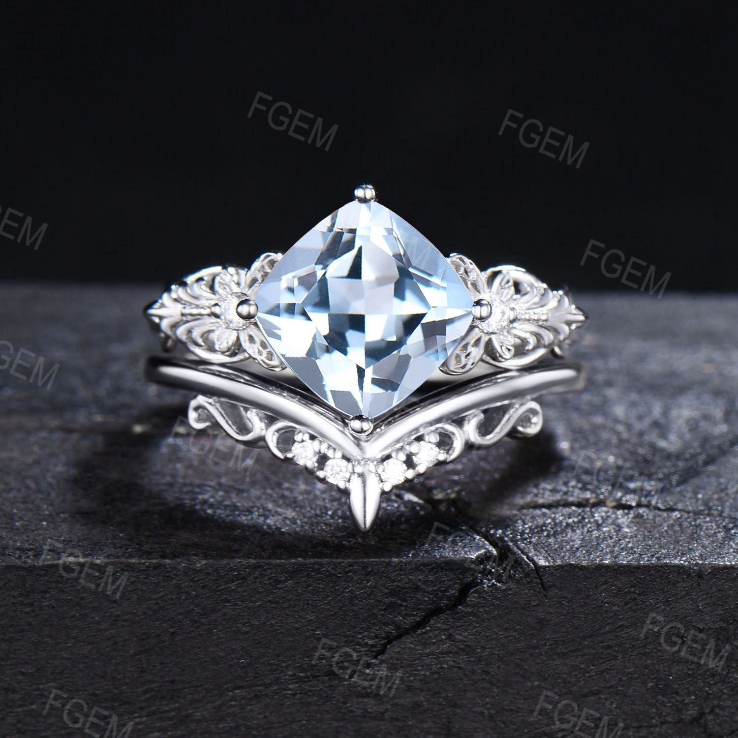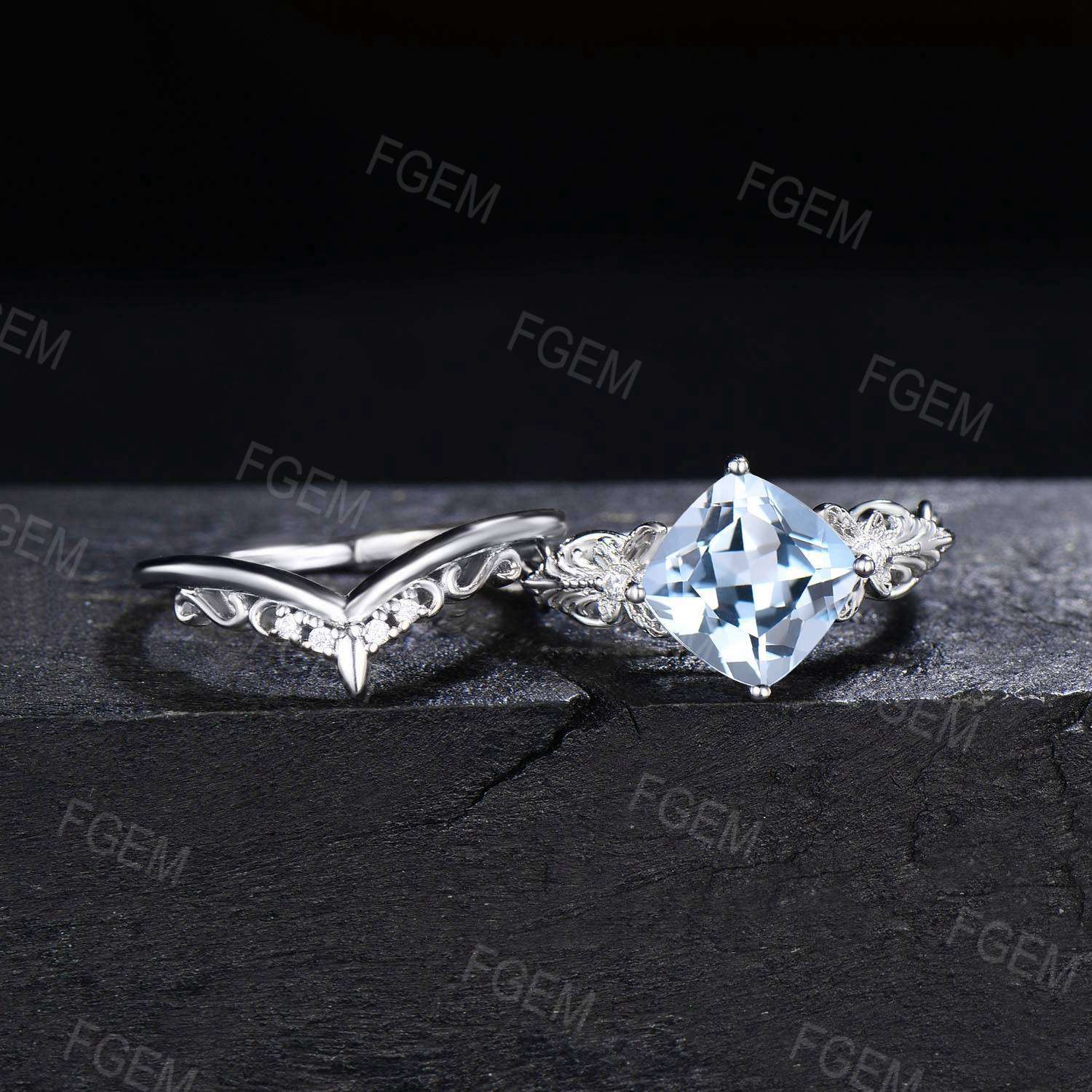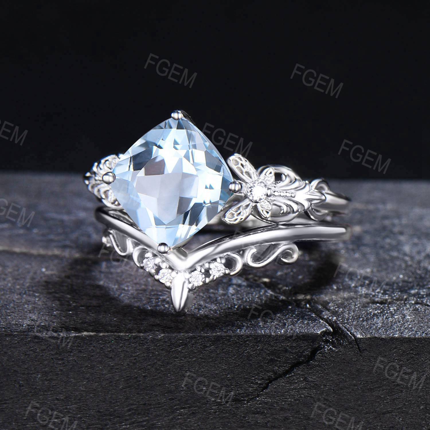 Art Deco Cushion Cut Natural Aquamarine Engagement Ring Set 14k White Gold Moissanite Diamond Promise Ring March Birthstone Butterfly Ring