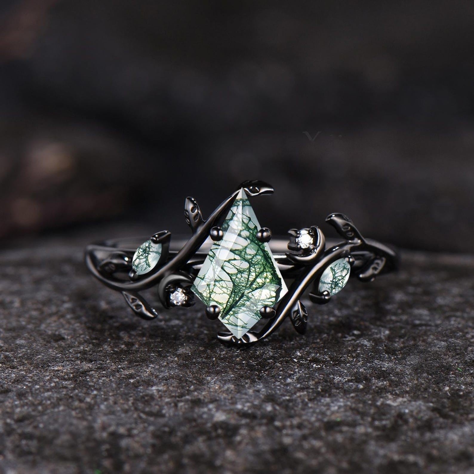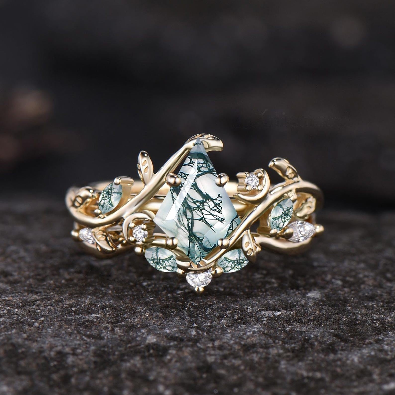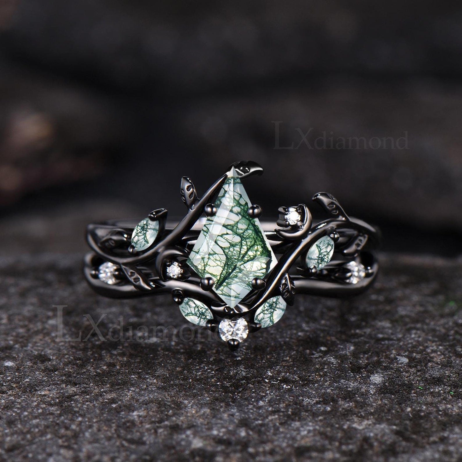 Art Deco Kite Cut Natural Green Moss Agate Engagement Ring Set Unique 14k Black Gold Leaf Vine Twig Branch Nature Inspired Ring Moon Ring