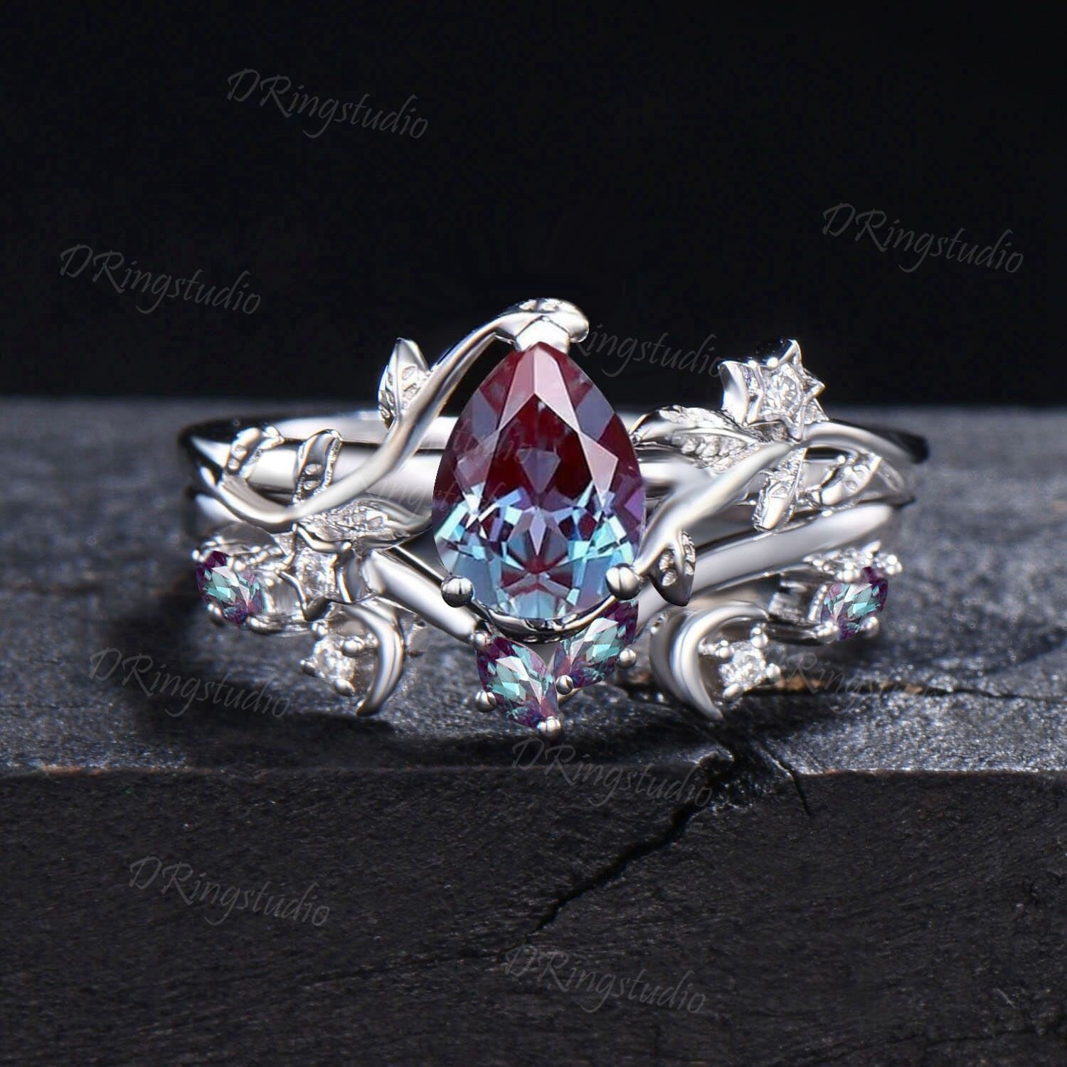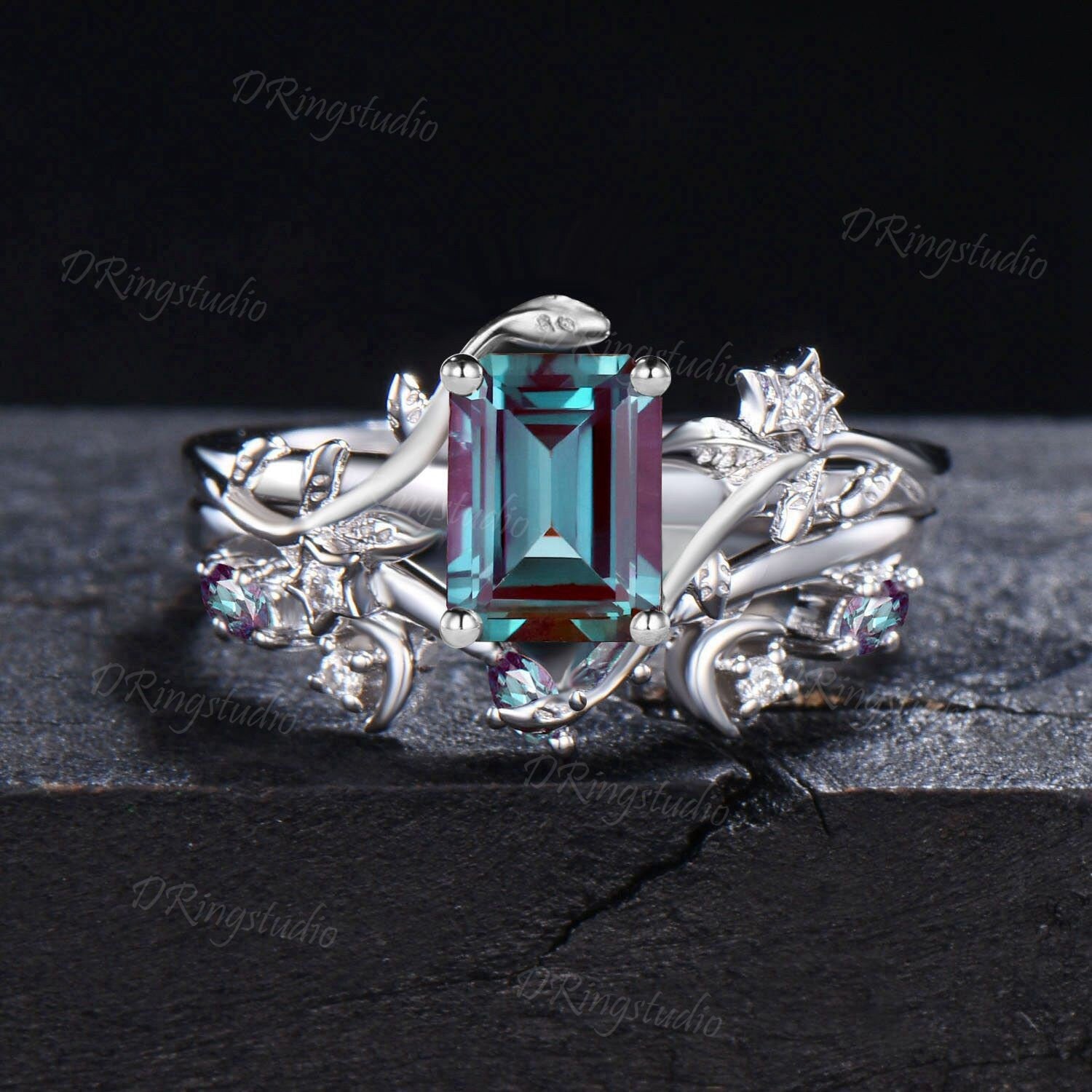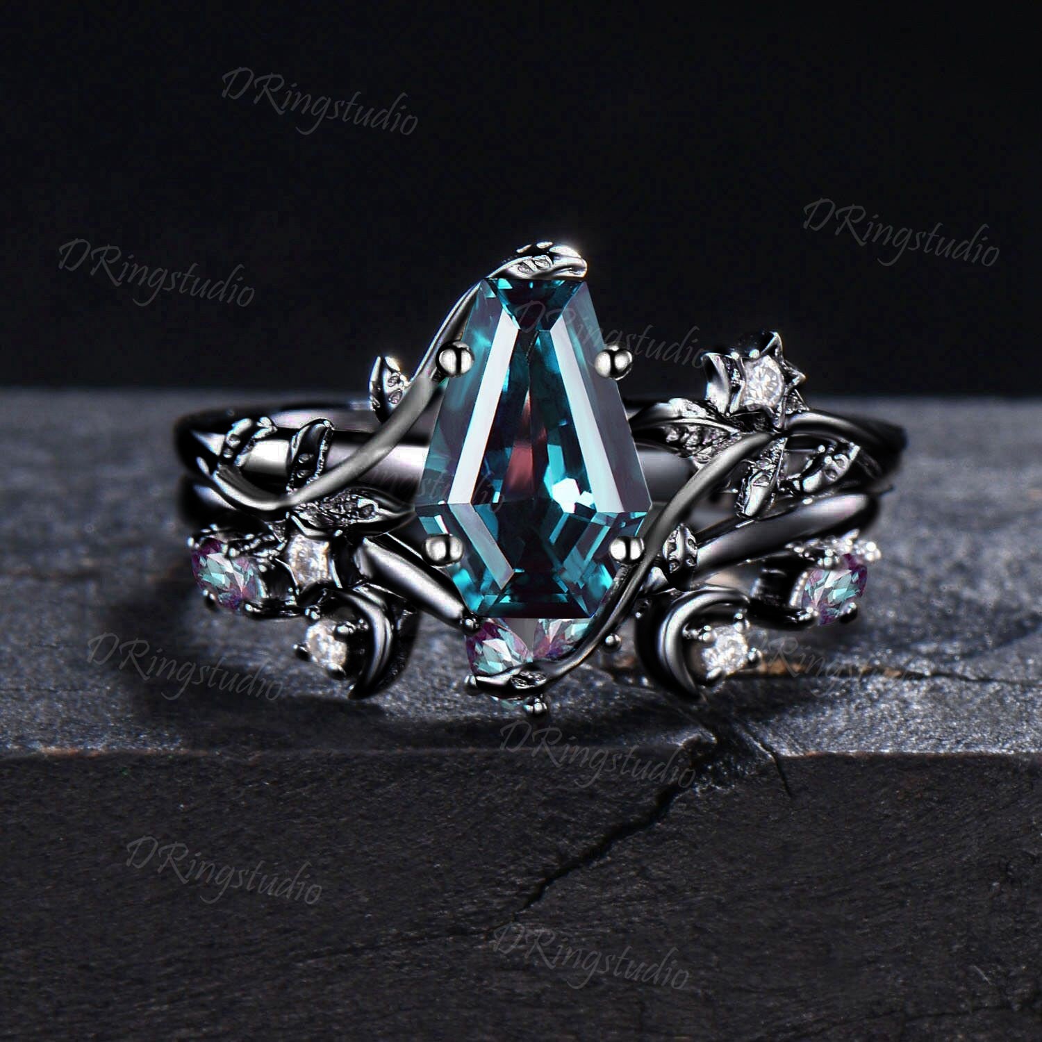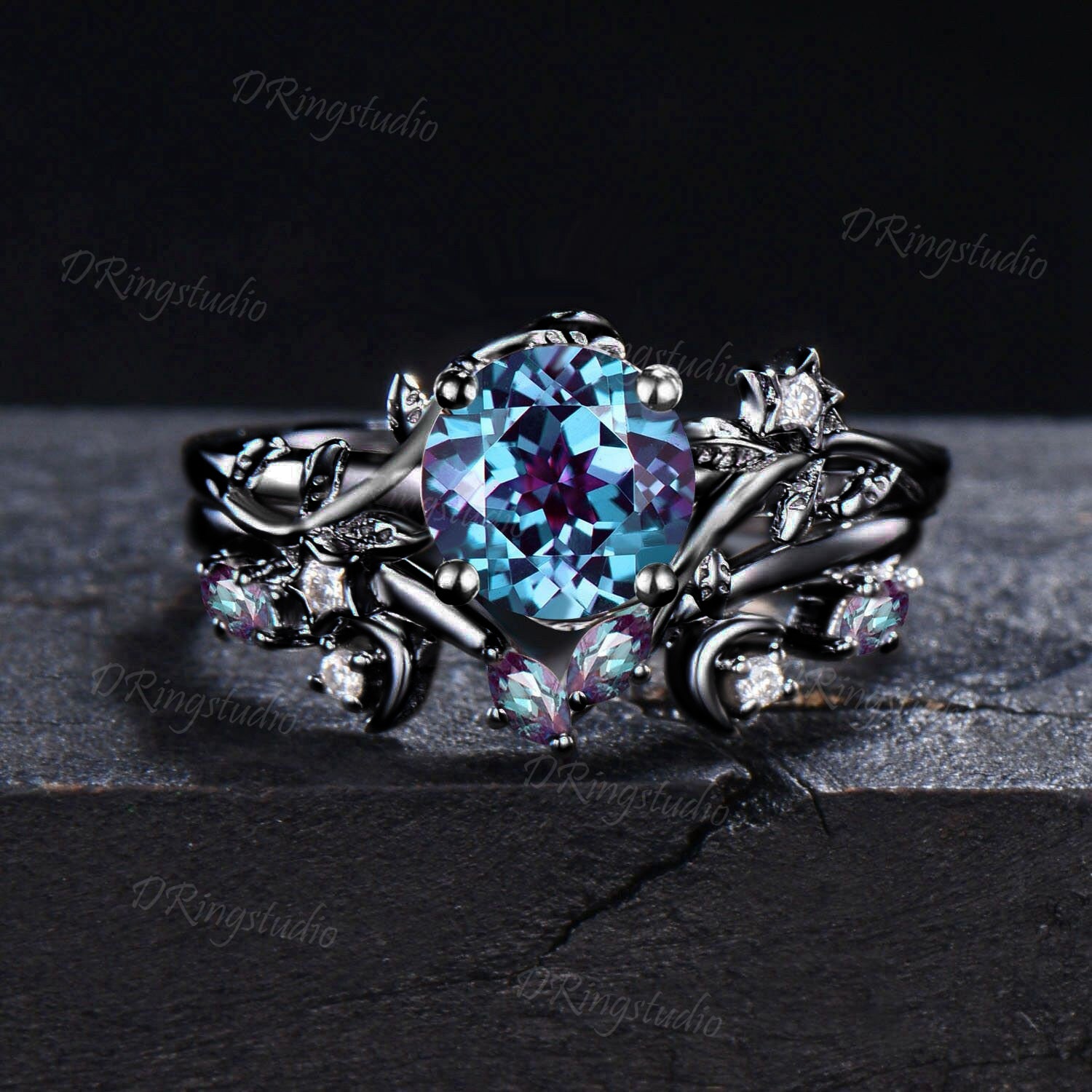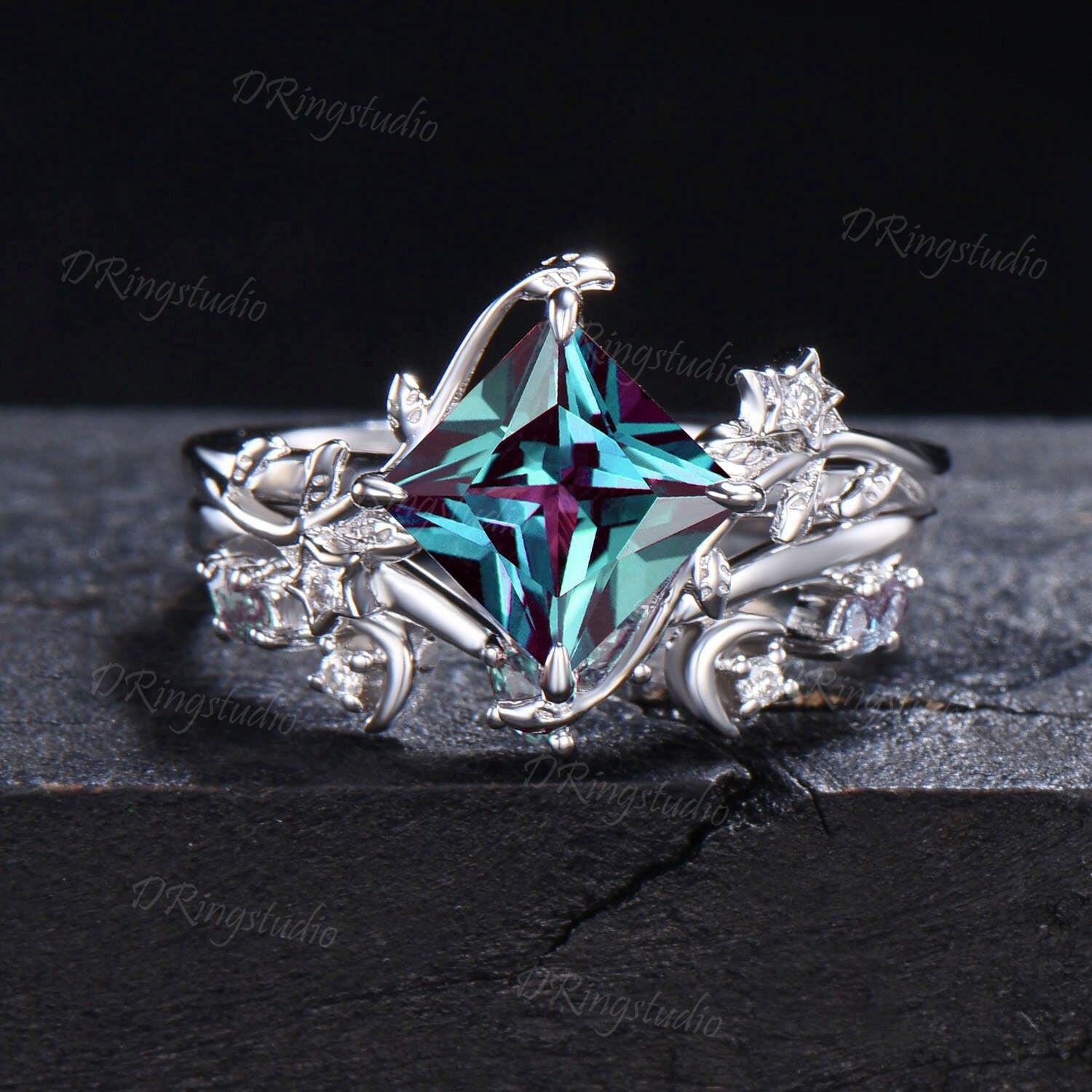 Princess Cut Alexandrite Engagement Ring Set Nature Inspired Black Gold Ring Moon Leaf Moissanite Wedding Ring Set