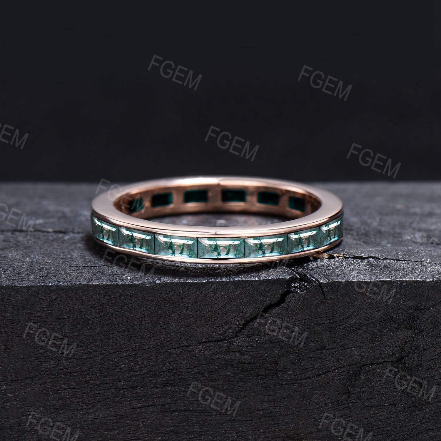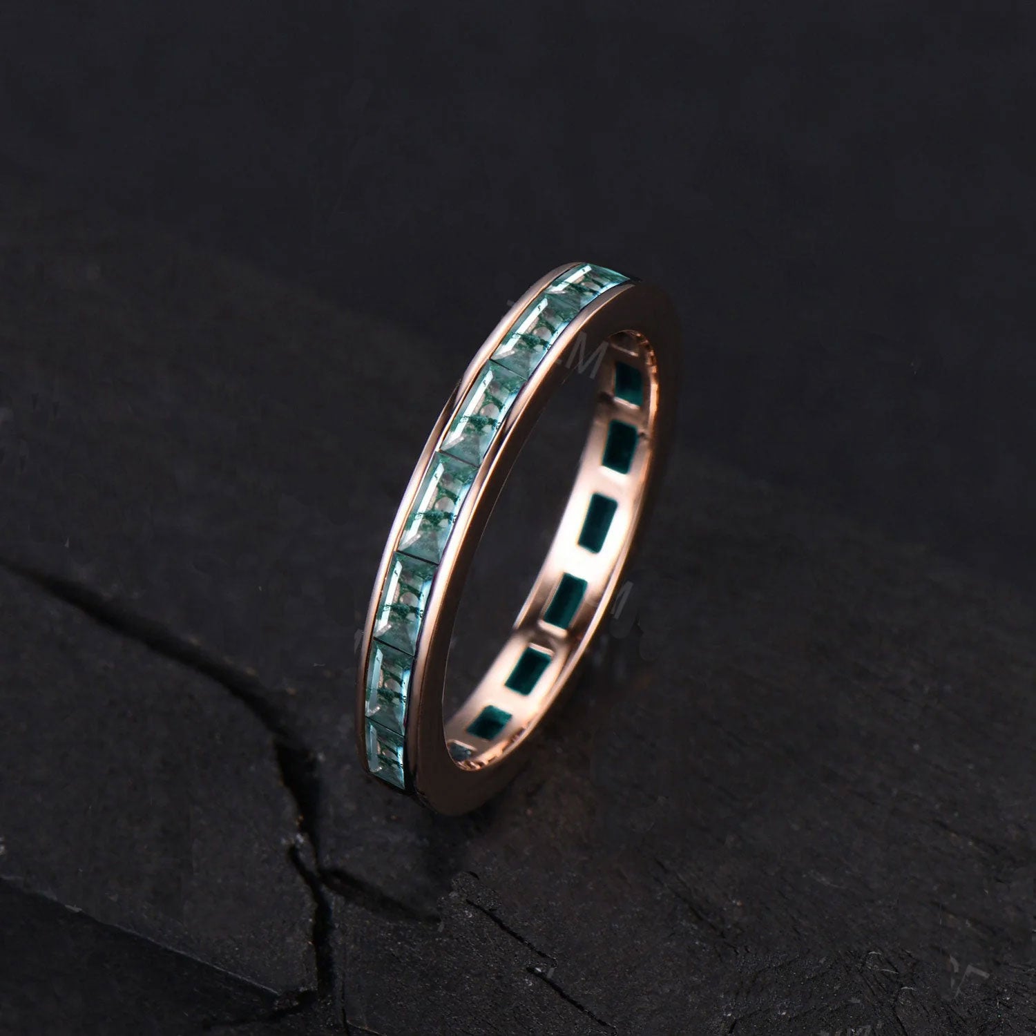 Baguette Cut Natural Moss Agate Wedding Band for Men/Women Vintage 10K/14K/18K Rose Gold Channel Setting Matching Band Mens Moss Agate Ring