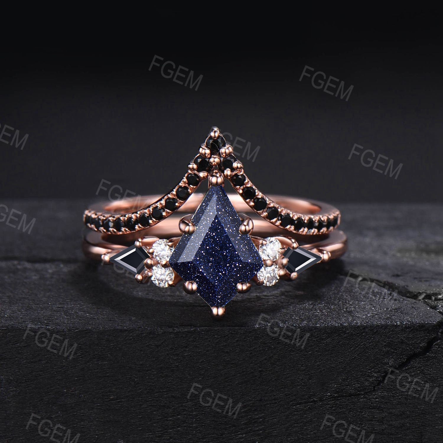 Black Bridal Set 3pcs Kite Cut Starry Sky Blue Sandstone Engagement Rings Vintage Antique Art Deco Black Spinel Celtic Knot Wedding Ring Set