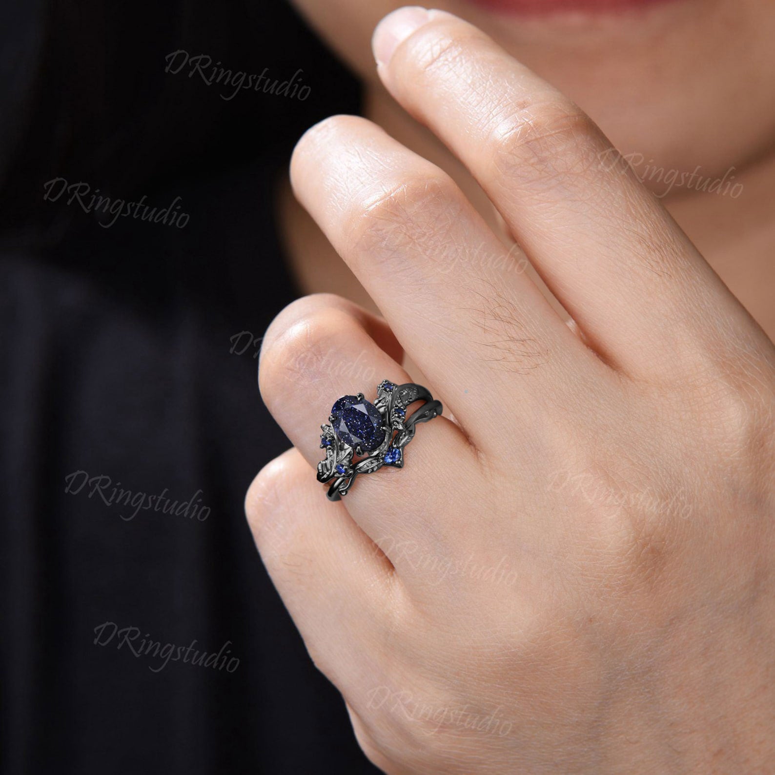 Black Gold Engagement Ring 1.5CT Oval Nature Inspired Starry Sky Galaxy Blue Sandstone Wedding Ring Set Cluster Blue Sapphire Bridal Sets