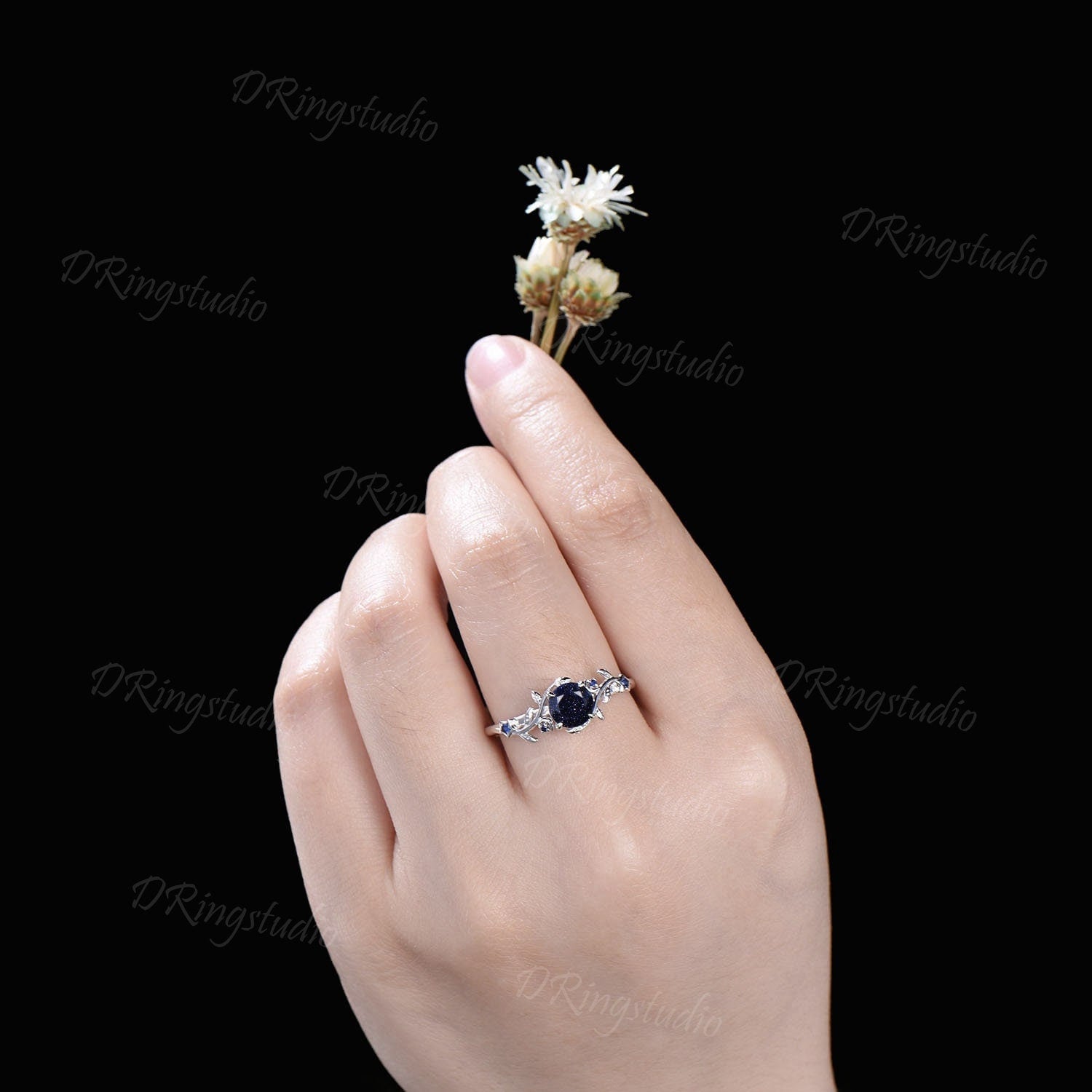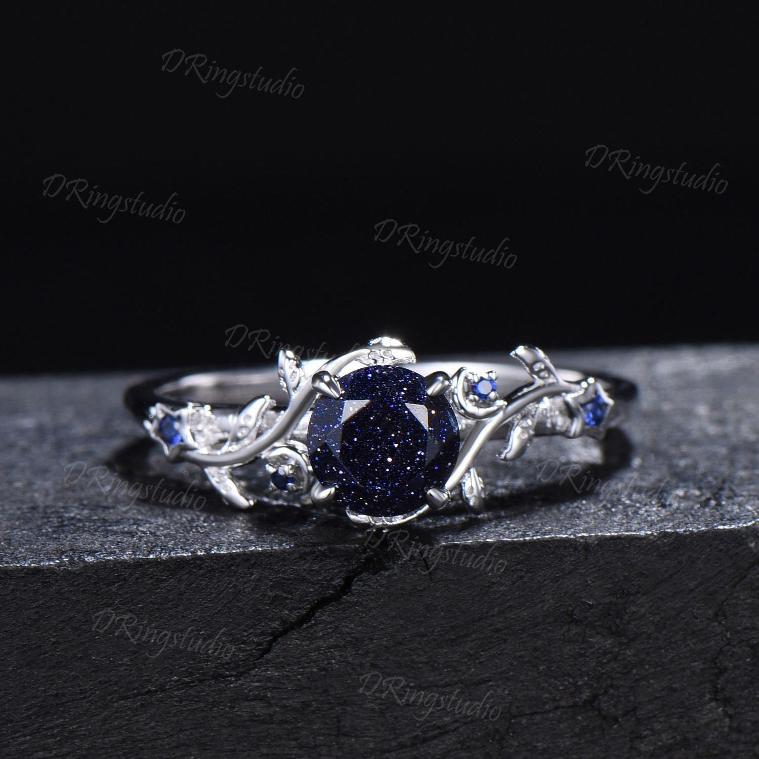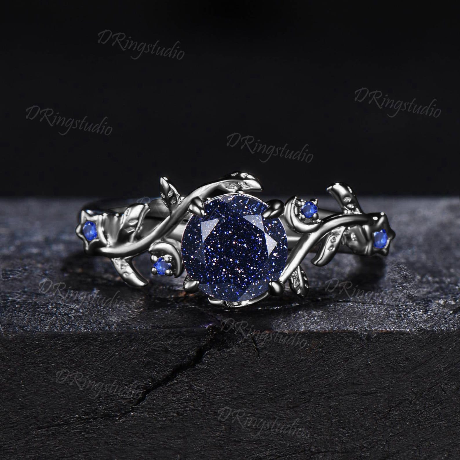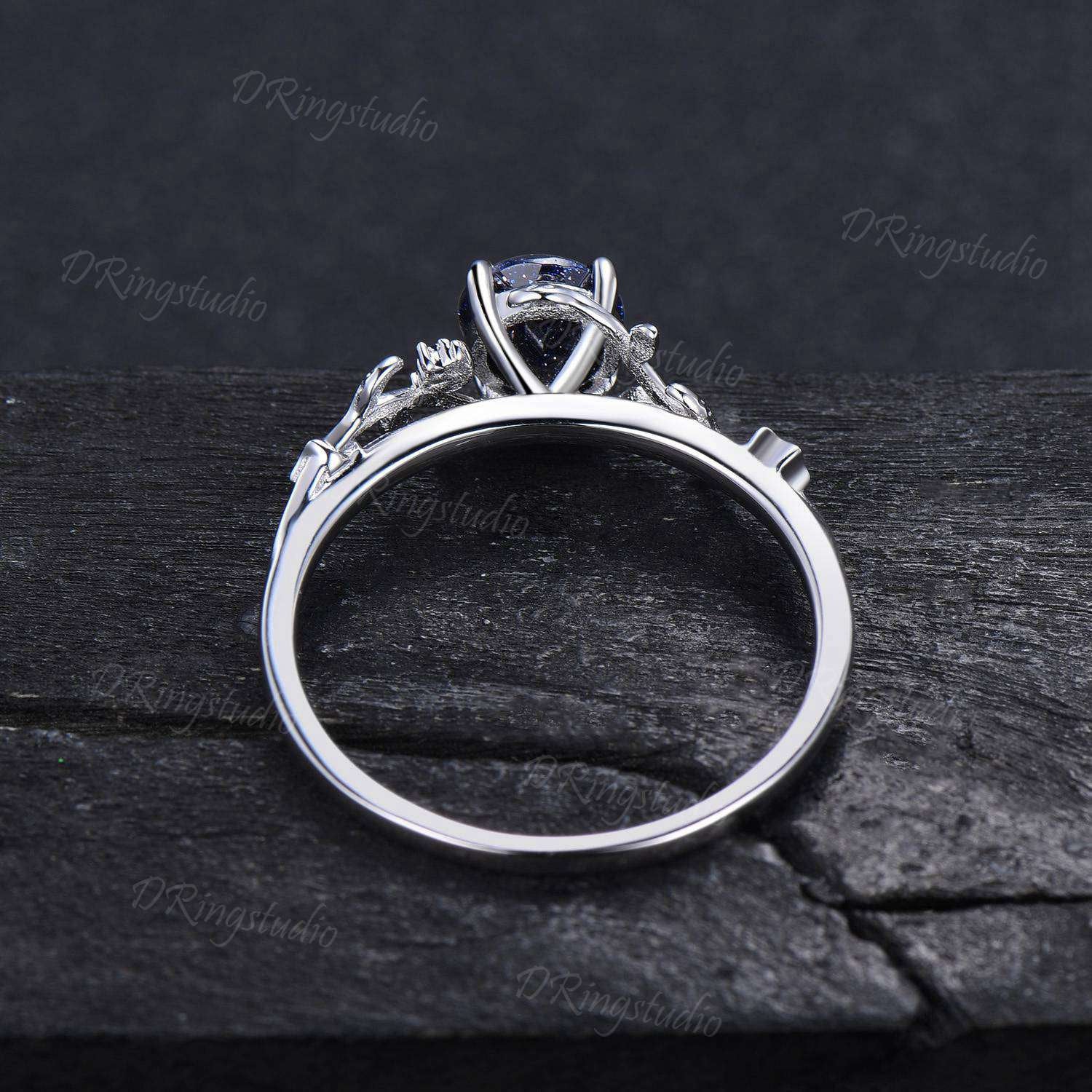 Black Gold Starry Sky Blue Sandstone Ring Branch Leaf Round Blue Goldstone Engagement Ring Moon Star Sapphire Ring Black Promise Ring Gifts