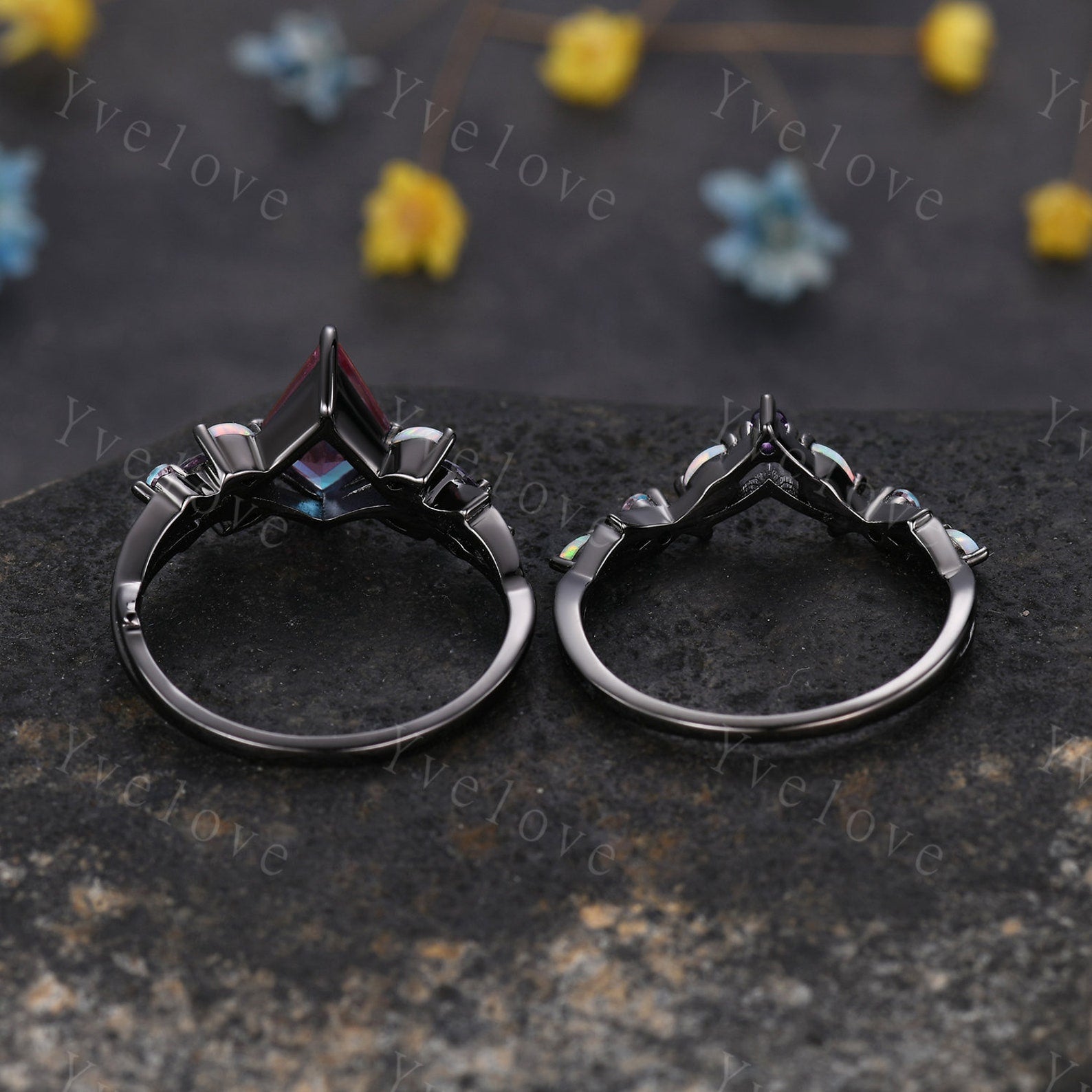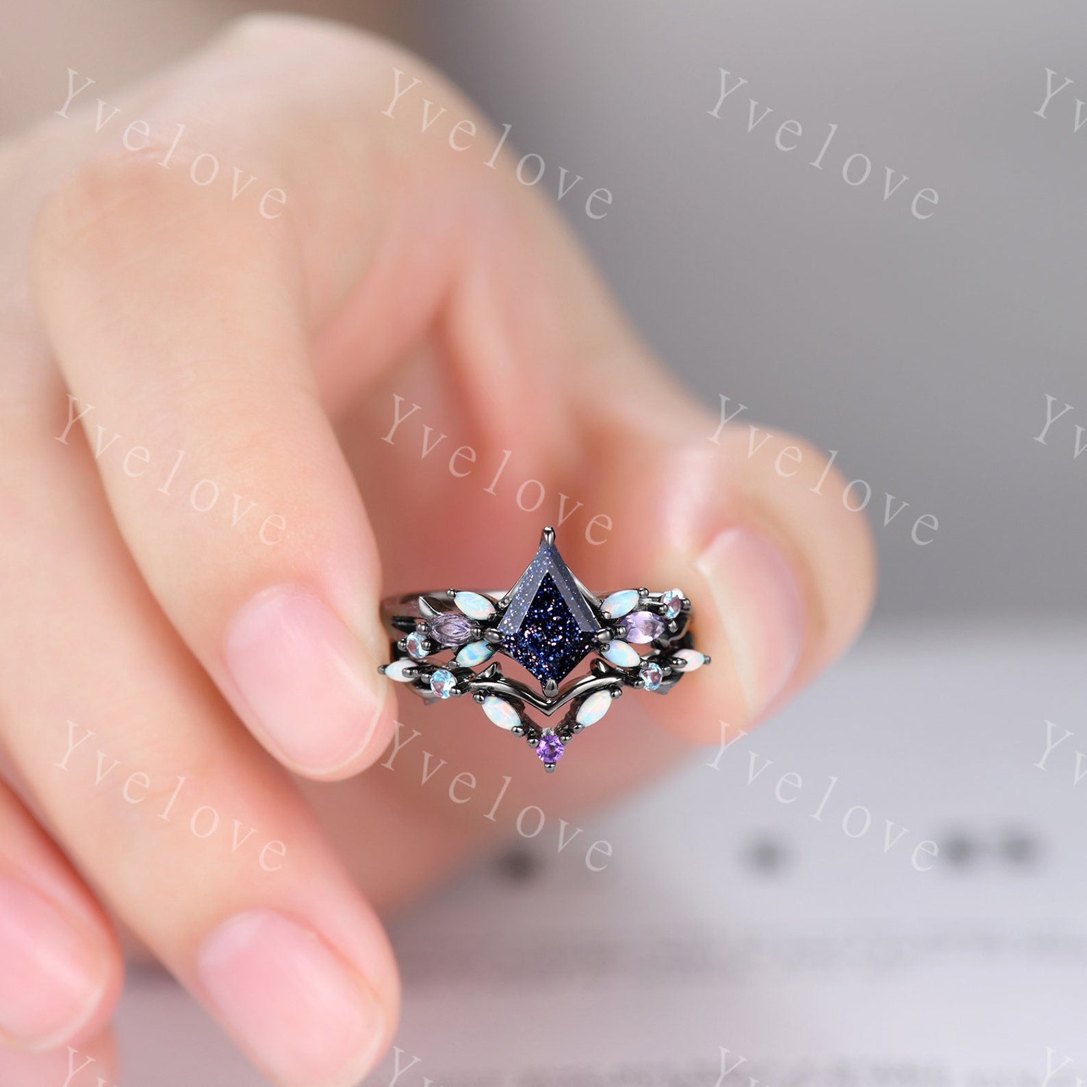 Vintage Kite Sandstone Engagement Ring Set,Black Gold,Vines Amethyst Opal Ring,Women Bridal Set,Unique Twig Anniversary Promise Ring Gift
