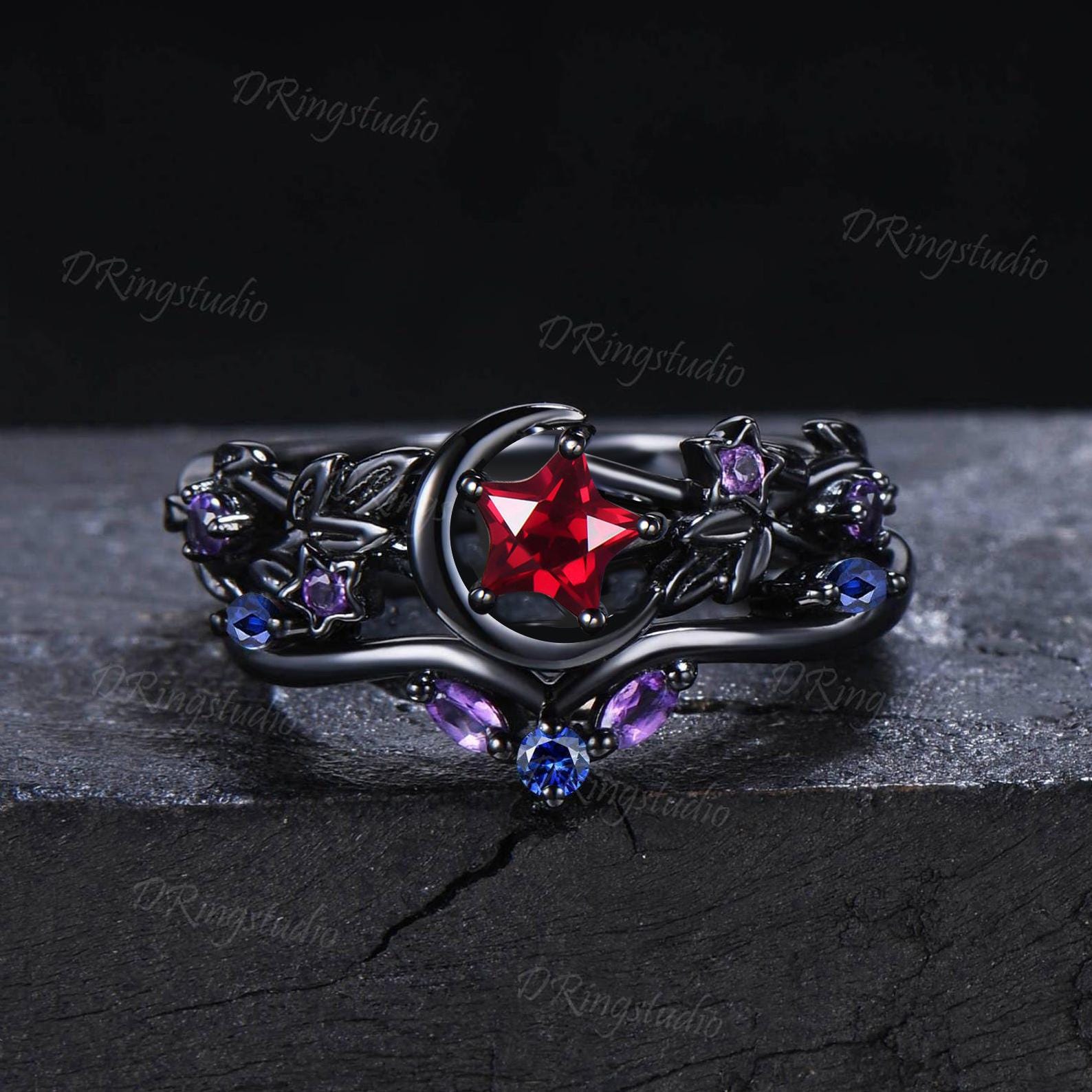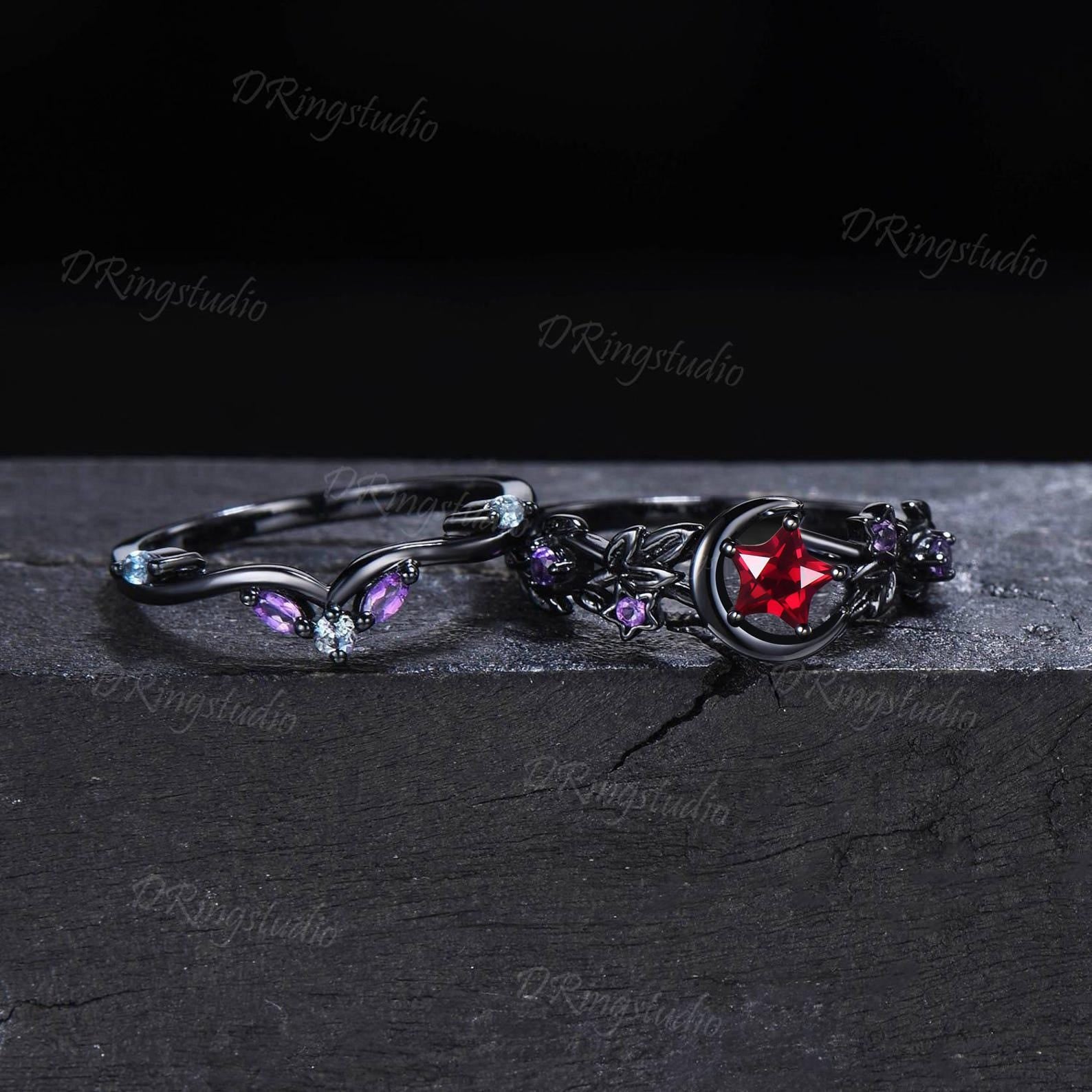 Crescent Moon Star Shape Ruby Engagement Ring Moon Leaf Amethyst Black Gold Star Ruby Promise Ring July Birthstone Bridal Set Proposal Gift