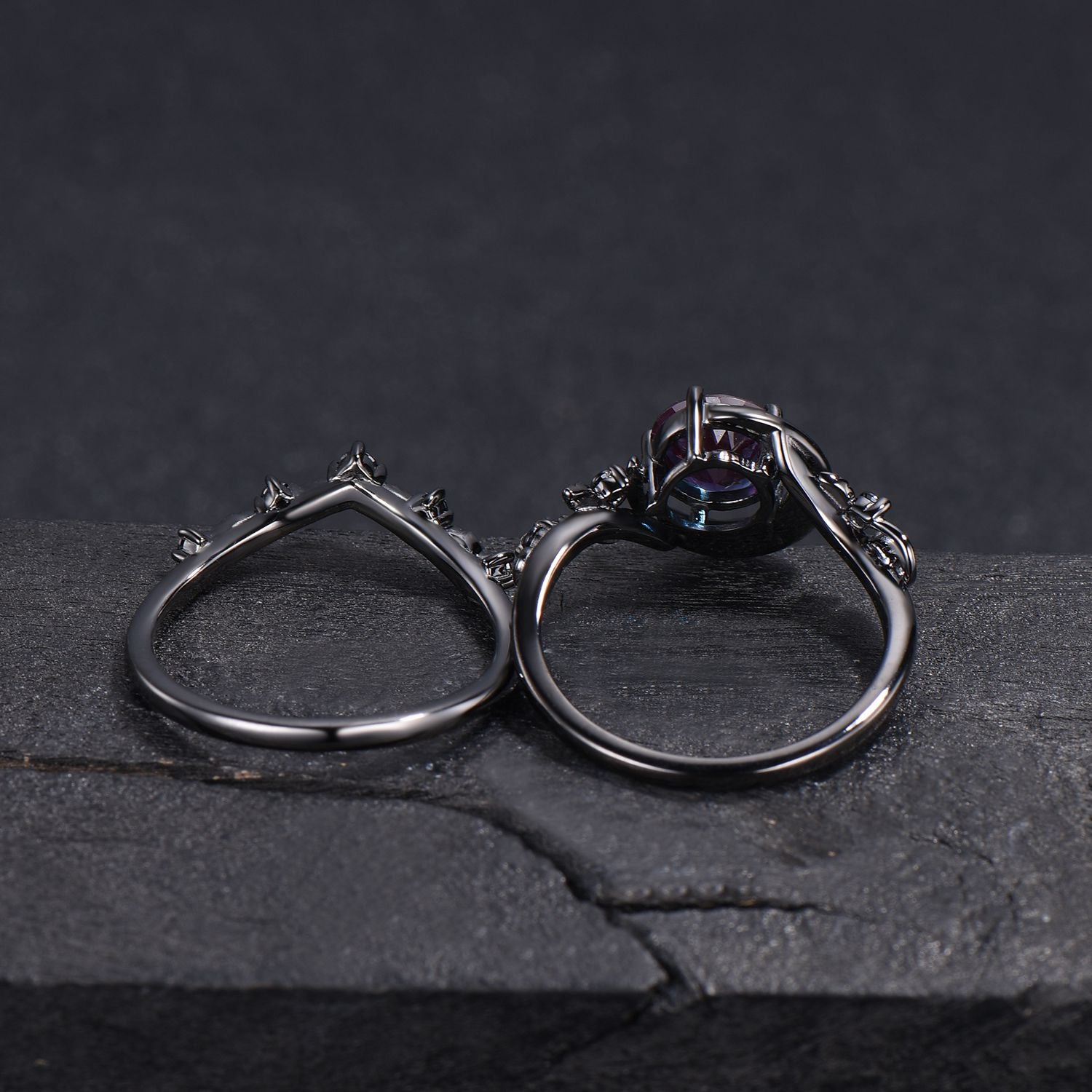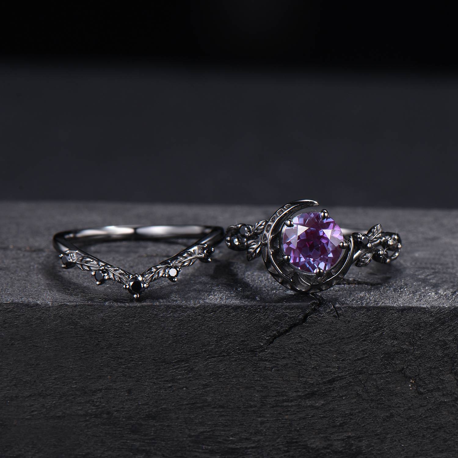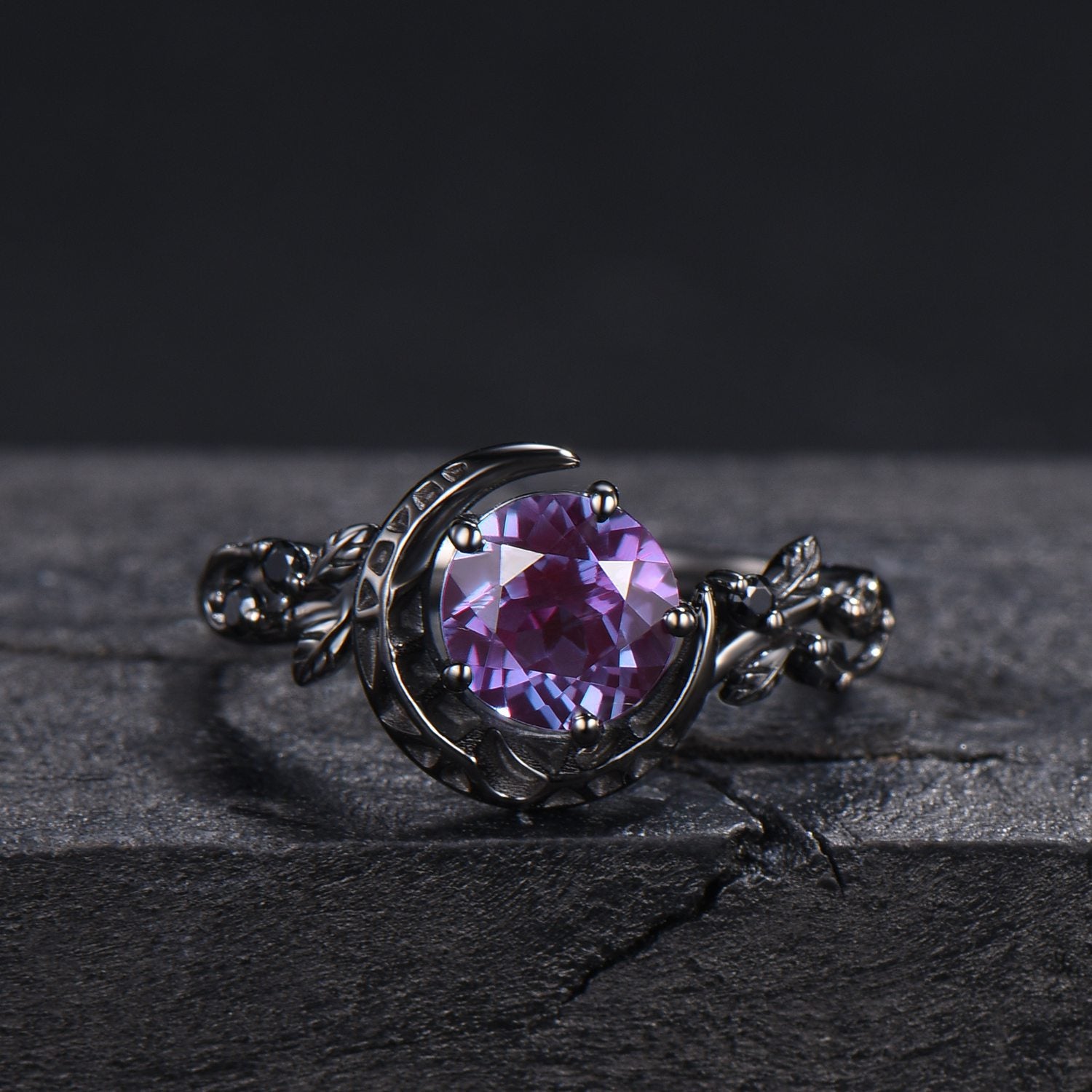 Gothic Black Galaxy Moon Alexandrite Engagement Ring Black Gold Nature Inspired Leaves Ring 1ct Round Alexandrite Wedding Ring Proposal Gift