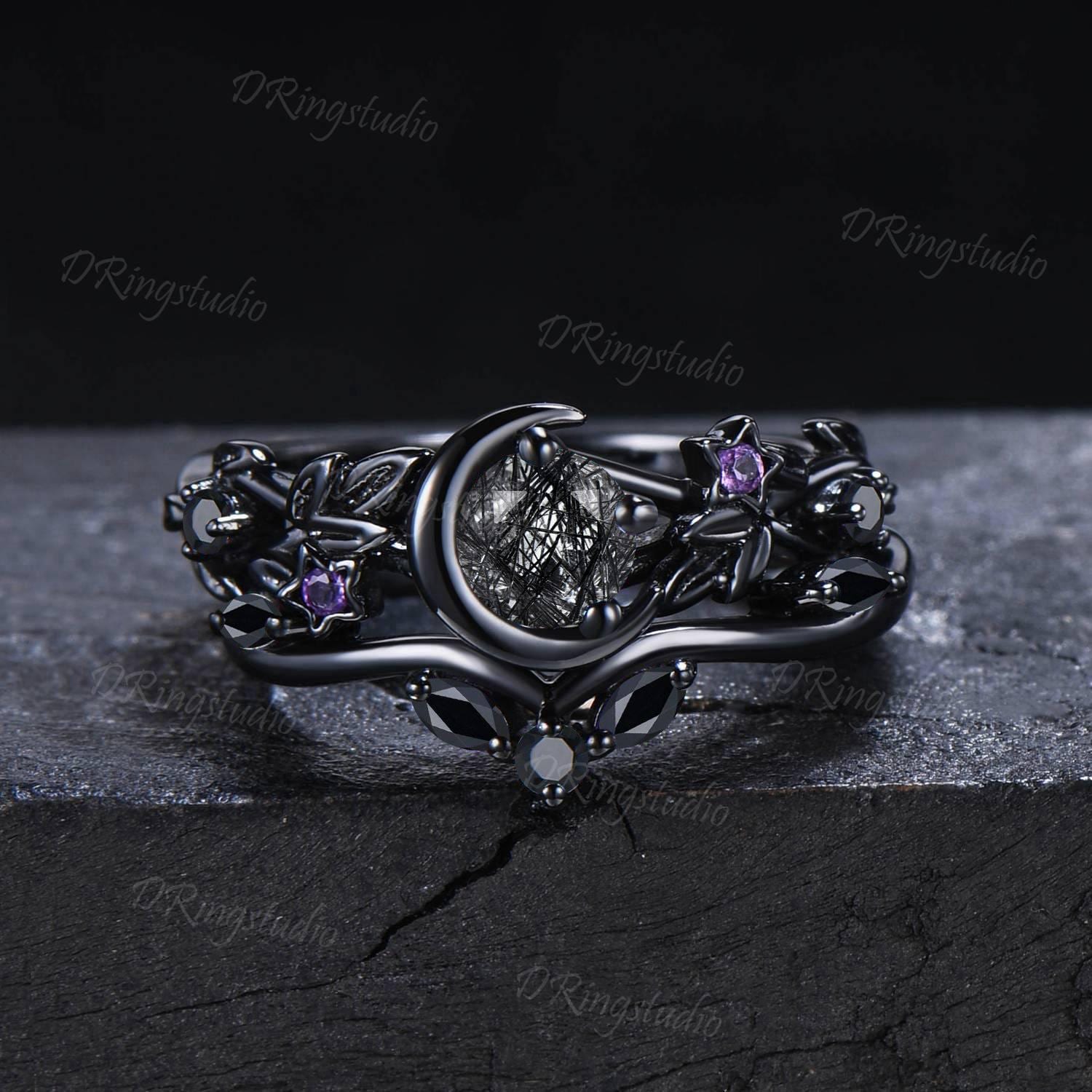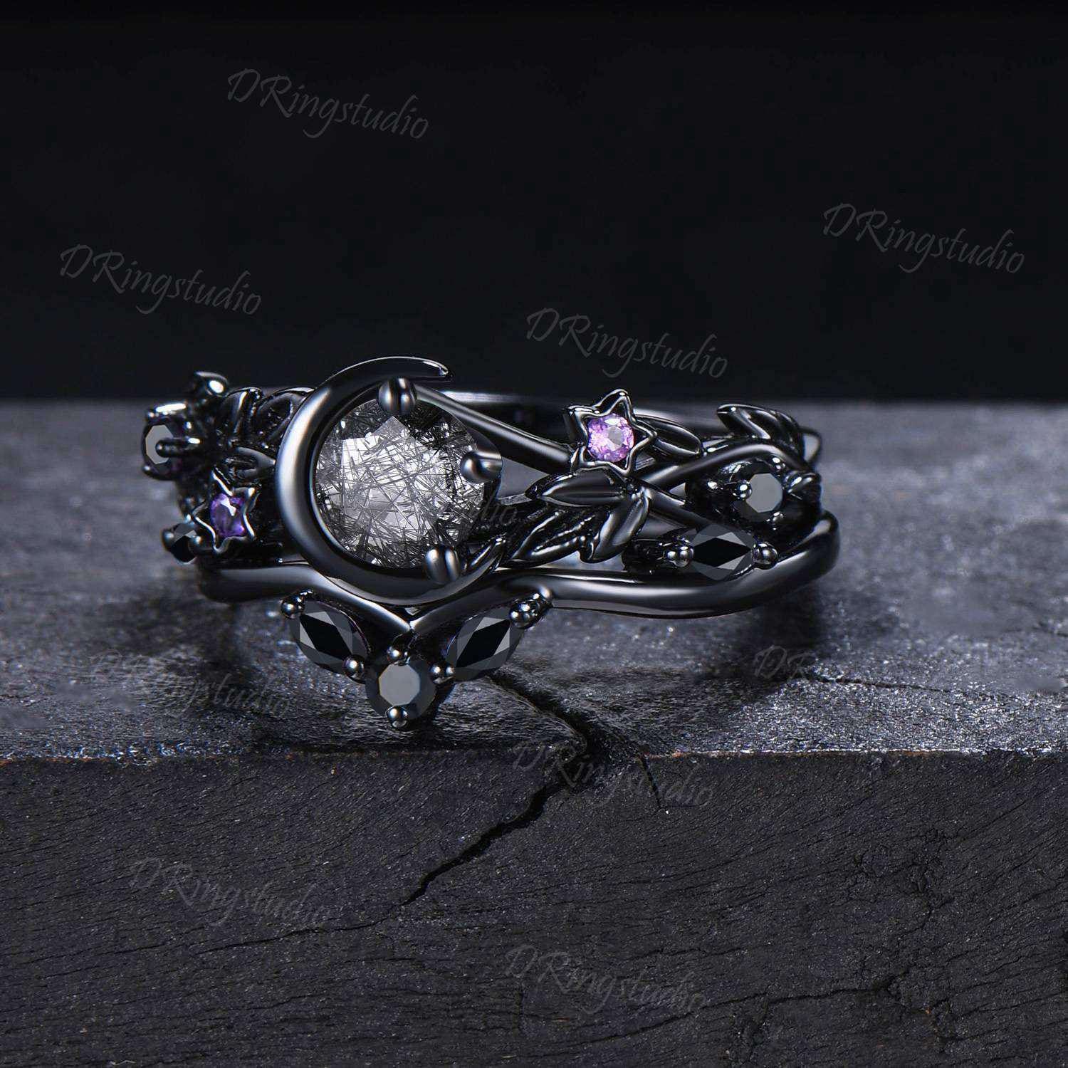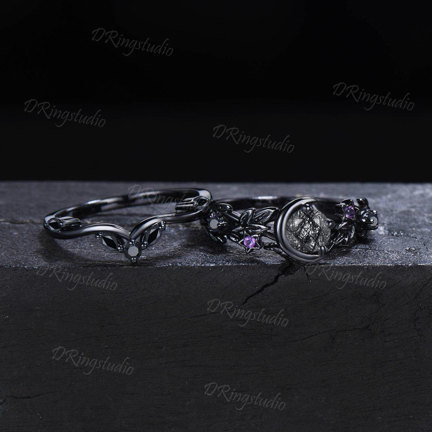 Gothic Black Rutilated Quartz Engagement Ring Black Gold Moon Star Wedding Ring Nature Inspired Leaf Vine Black Spinel Ring Set Promise Gift