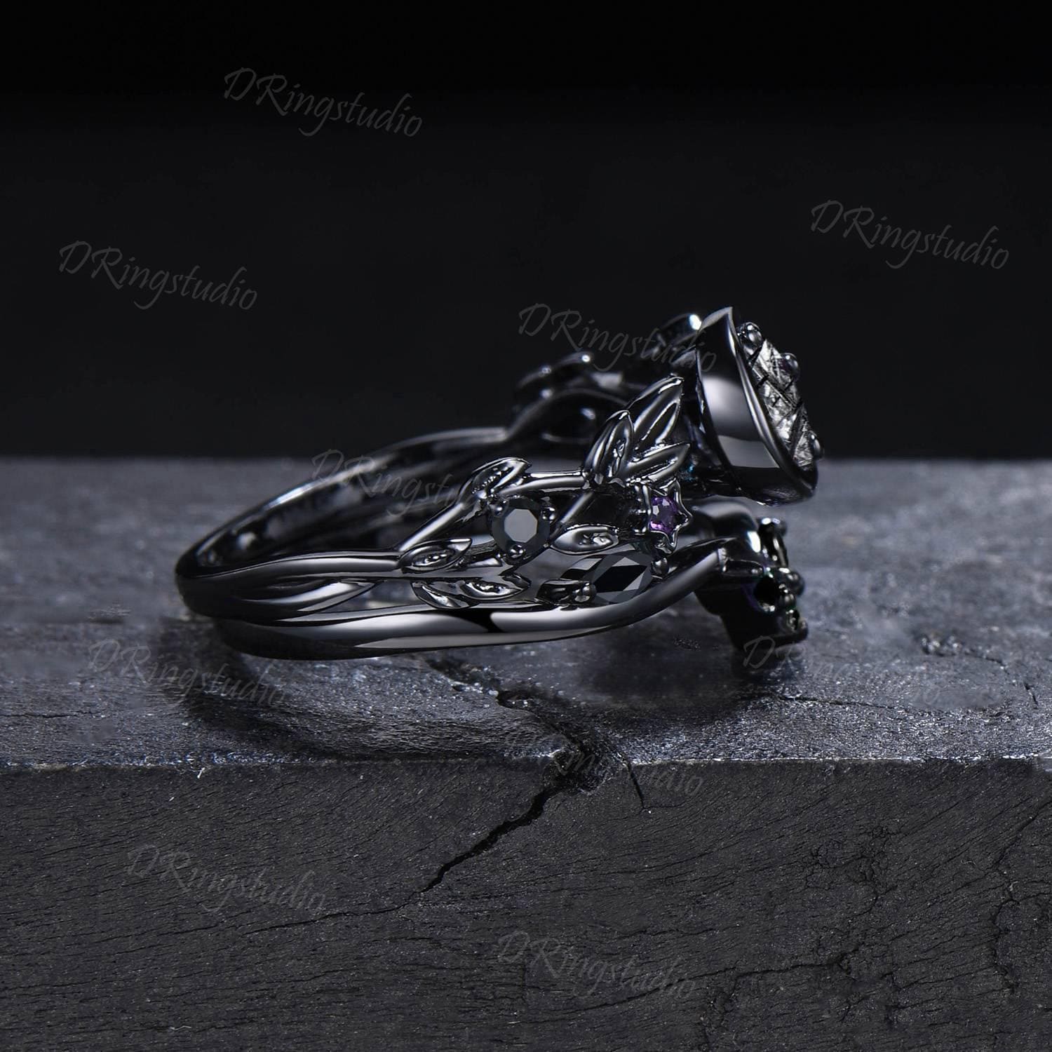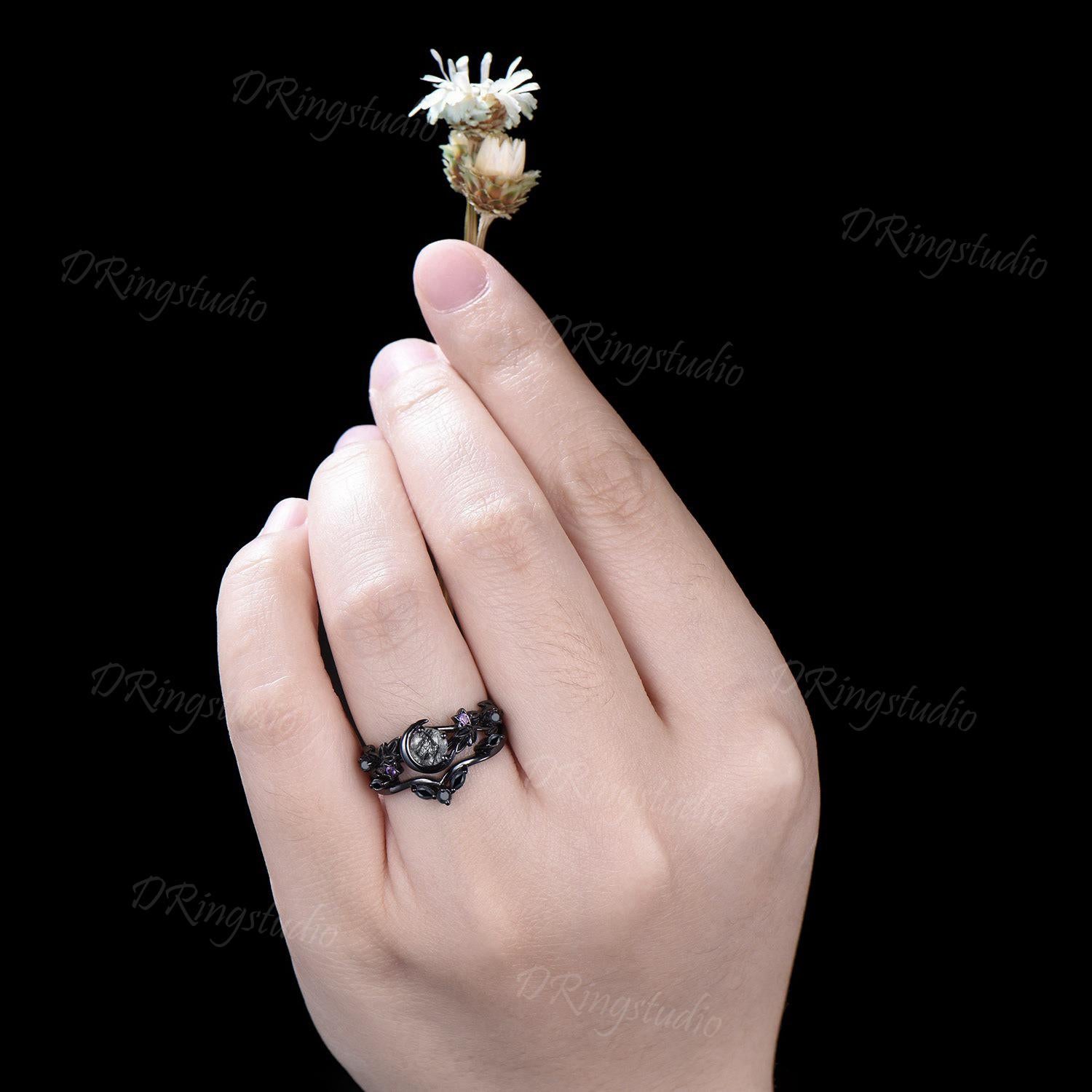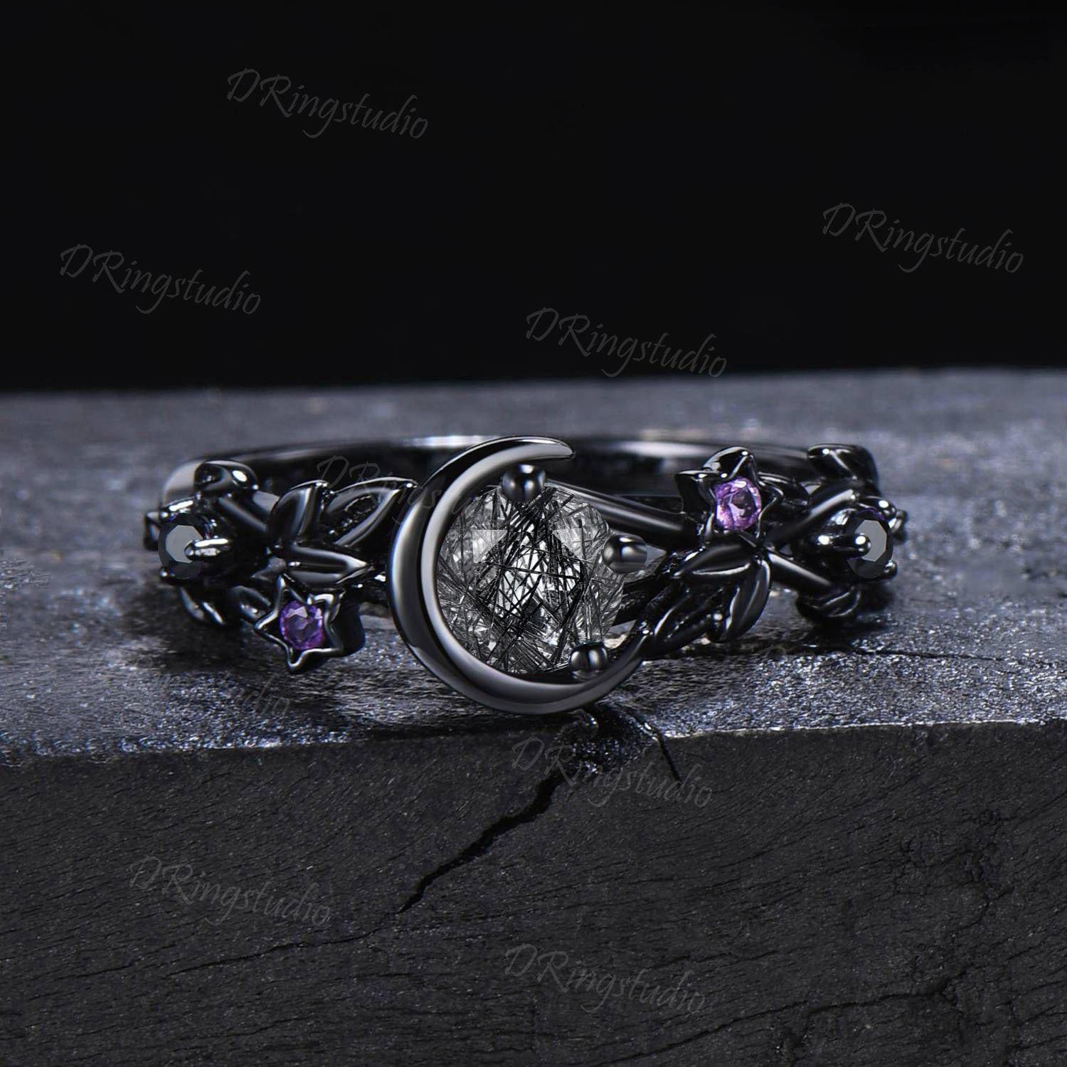 Gothic Black Rutilated Quartz Engagement Ring Black Gold Moon Star Wedding Ring Nature Inspired Leaf Vine Black Spinel Ring Set Promise Gift