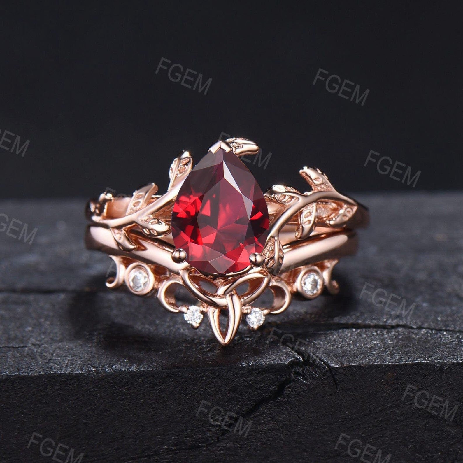July Birthstone Wedding Ring 1.25ct Pear Red Ruby Ring Set Ruby Gemstone Jewelry Nature Ruby Celtic Bridal Ring Set Anniversary Gift Women