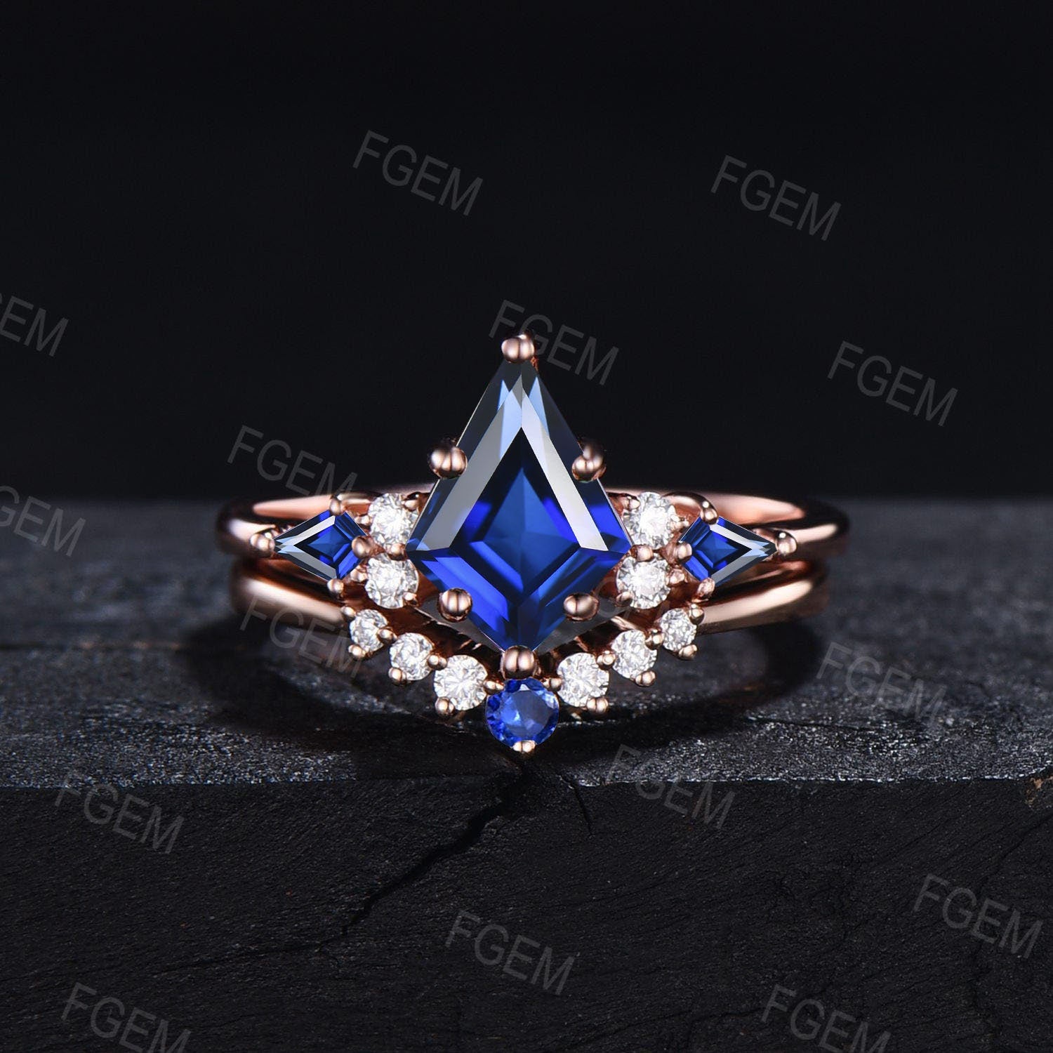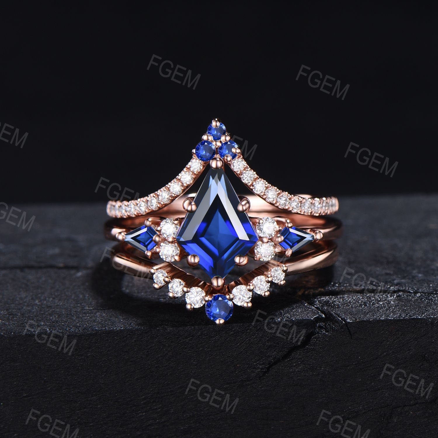 Kite Cut Blue Sapphire Moissanite Engagement Ring Set Vintage Kite Bridal Set September Birthstone Wedding Ring Blue Gemstone Ring for Women