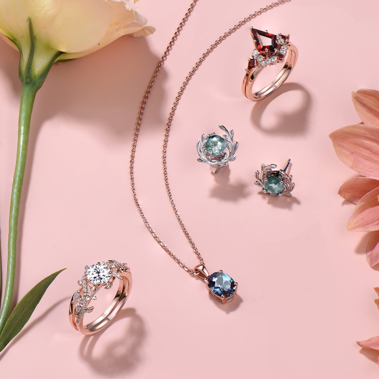 - Side stone : moissanite and red garnet