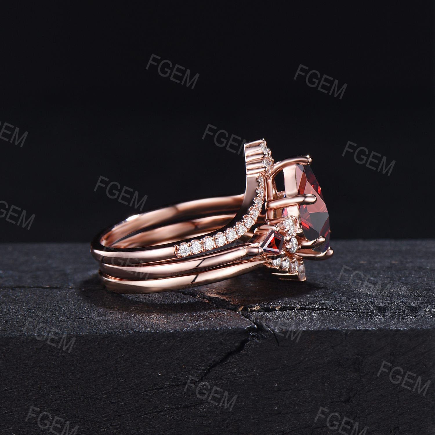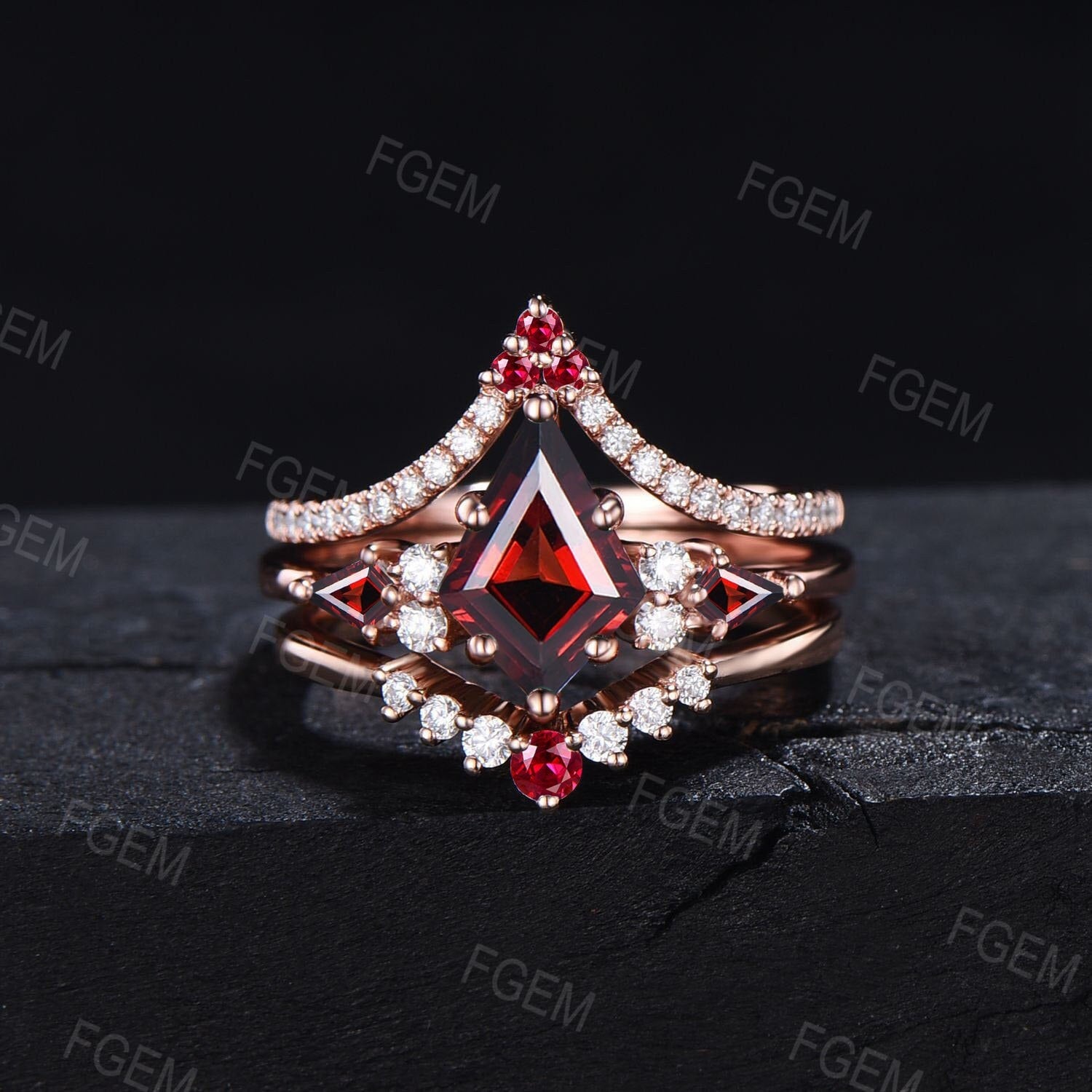 Kite Cut Natural Garnet Moissanite Engagement Ring Set Red Gemstone Ring 10K Rose Gold January Birthstone Wedding Ring Vintage Promise Ring