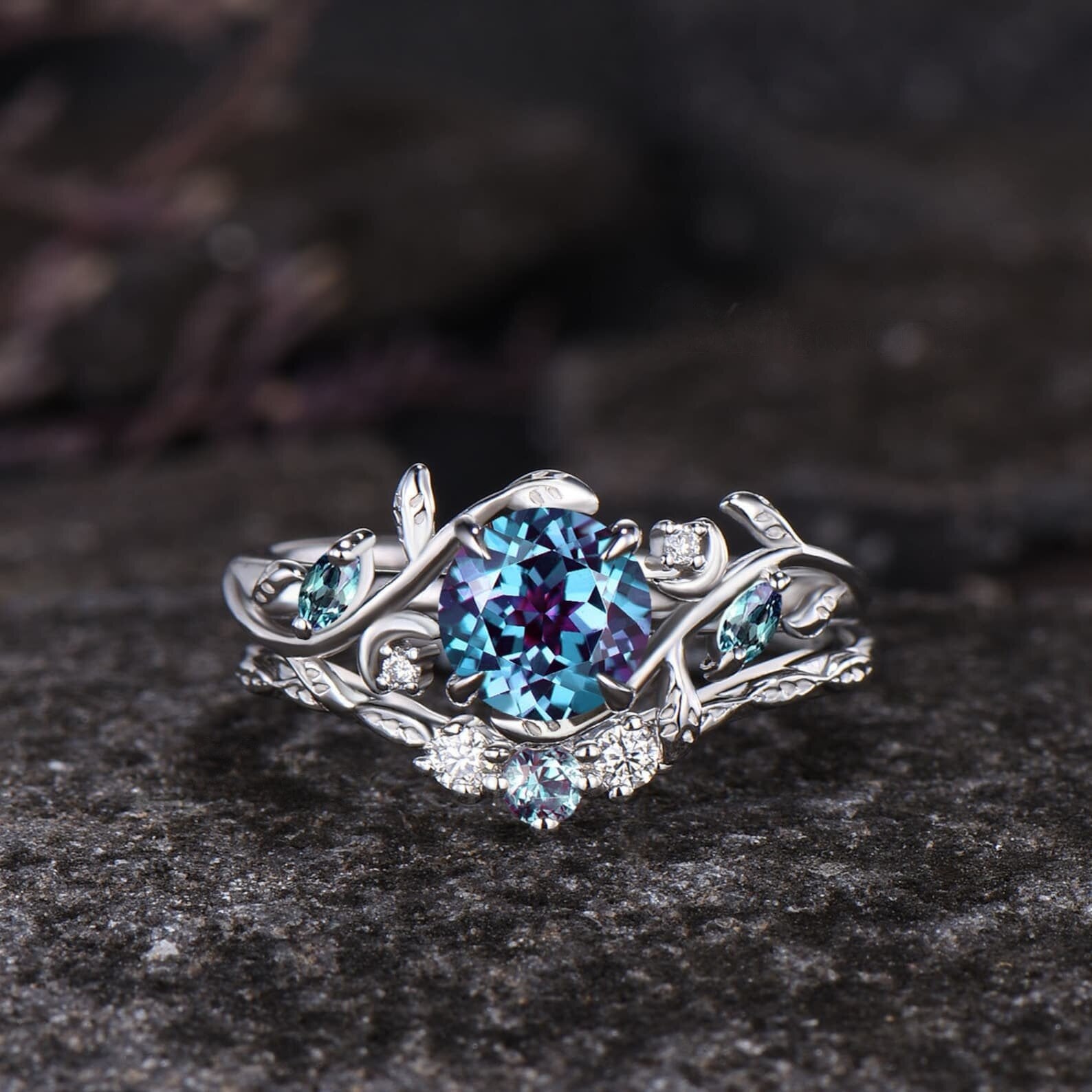 Leaf Nature Inspired Ring Unique Round Cut June Birthstone Alexandrite Engagement Ring Set Moissanite Moon Three Stone 2pcs Bridal Ring Set