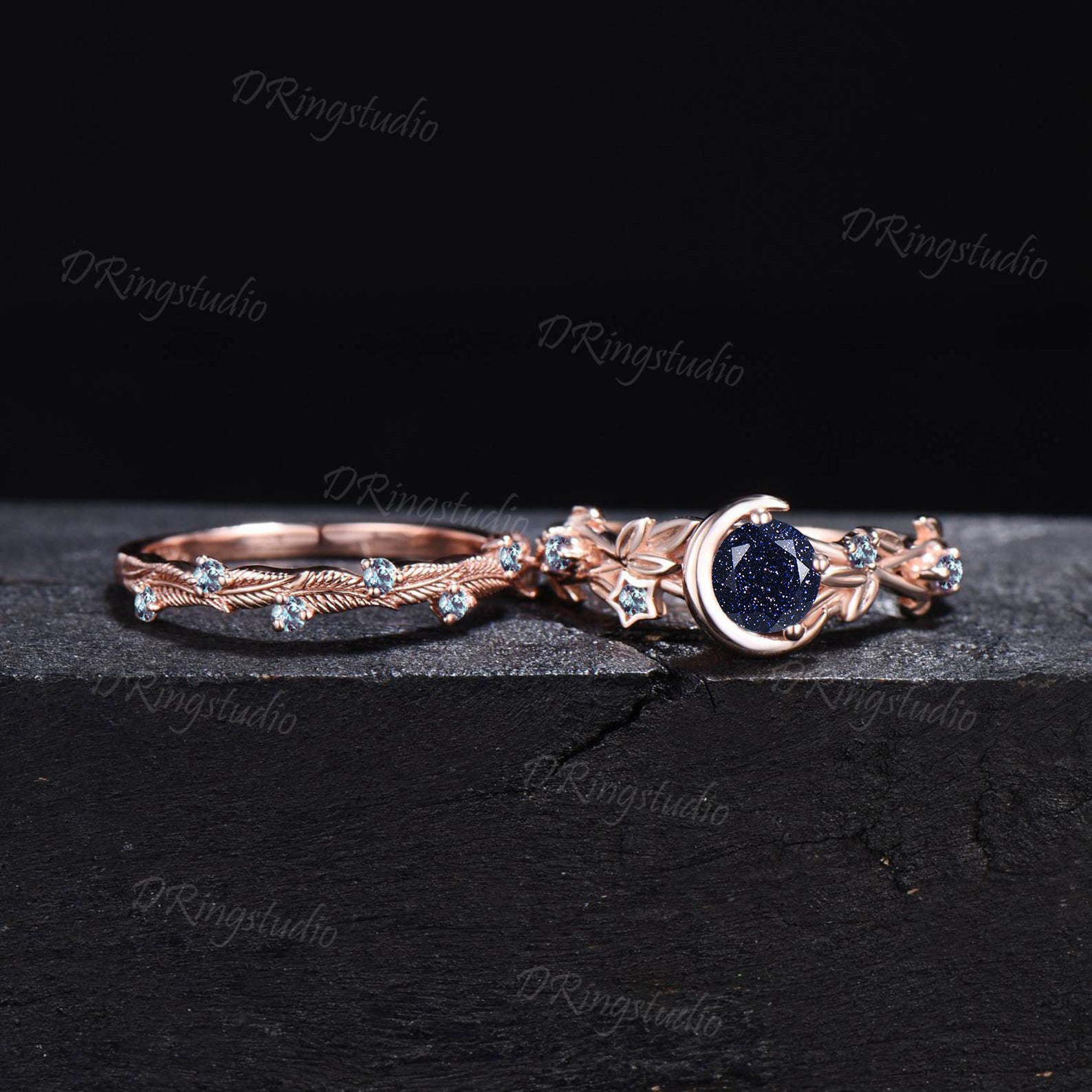 Moon Star Galaxy Blue Sandstone Ring Set Nature Inspired Alexandrite Leafy Ring Leaf Vine Sandstone Bridal Set Nebula Ring Proposal Gifts
