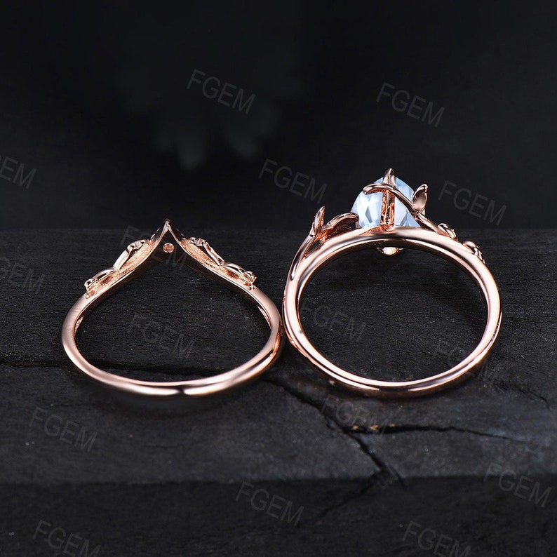 Natural Aquamarine Bridal Set Nature Inspired Engagement Rings Solid 14K Rose Gold Ring Unique Leaf Wedding Ring Set March Birthstone Gift