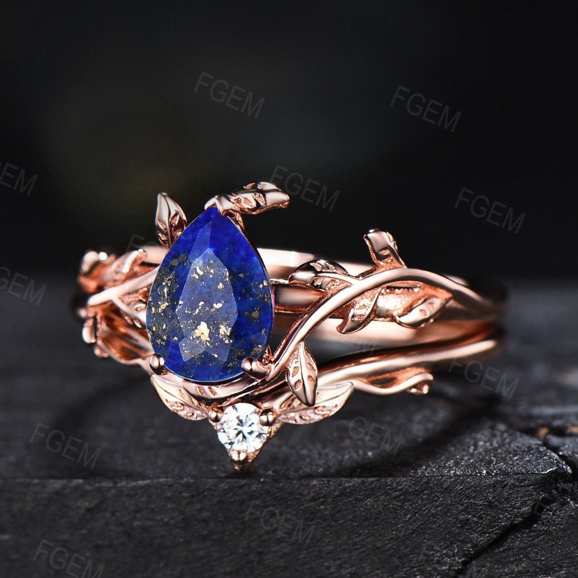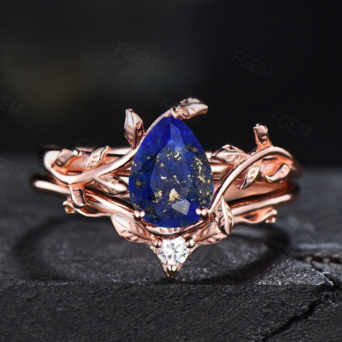 Natural Lapis Lazuli Engagement Ring Set Vintage Lapis Gold Ring Pear Shaped Promise Rings Blue Lapis Jewelry Antique Noble Gift for Women