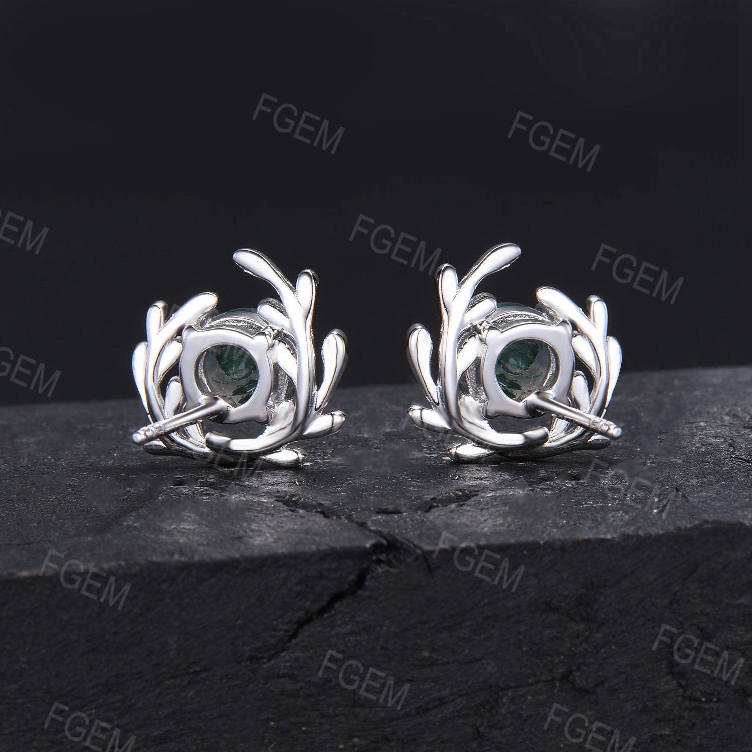 Natural Moss Agate Leaf Stud Earring White Gold Twig Vine Earrings Round Green Moss Solitaire Earrings Silver Boho Earrings Anniversary Gift