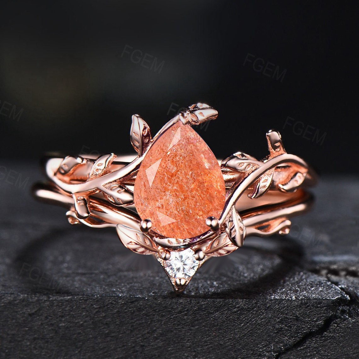 Natural Pear Shaped Sunstone Engagement Ring Leaf Branch Solitaire Sunstone Ring Set Alternative Wedding Ring Unique Orange Gemstone Ring