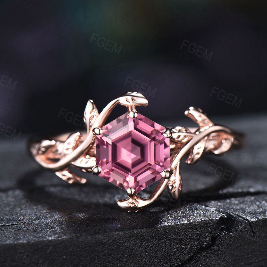 Natural Pink Tourmaline Engagement Ring Ring Vintage Nature Inspired Hexagon Tourmaline Ring Leaf Solitaire Ring Pink Gemstone Wedding Ring
