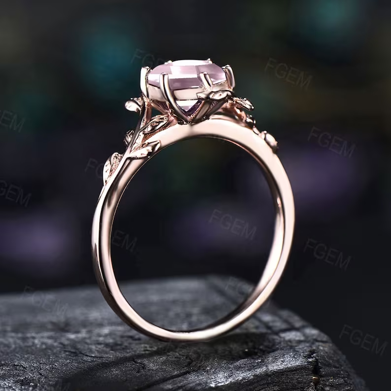 Natural Rose Quartz Ring Sterling Silver Hexagon Leaf Engagement Ring Solitaire Ring Crystal Ring Valentine's Day Jewelry Gift for Couple