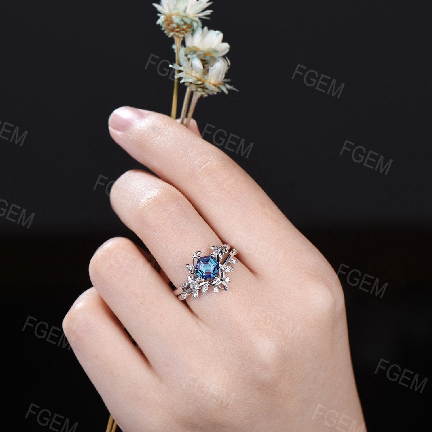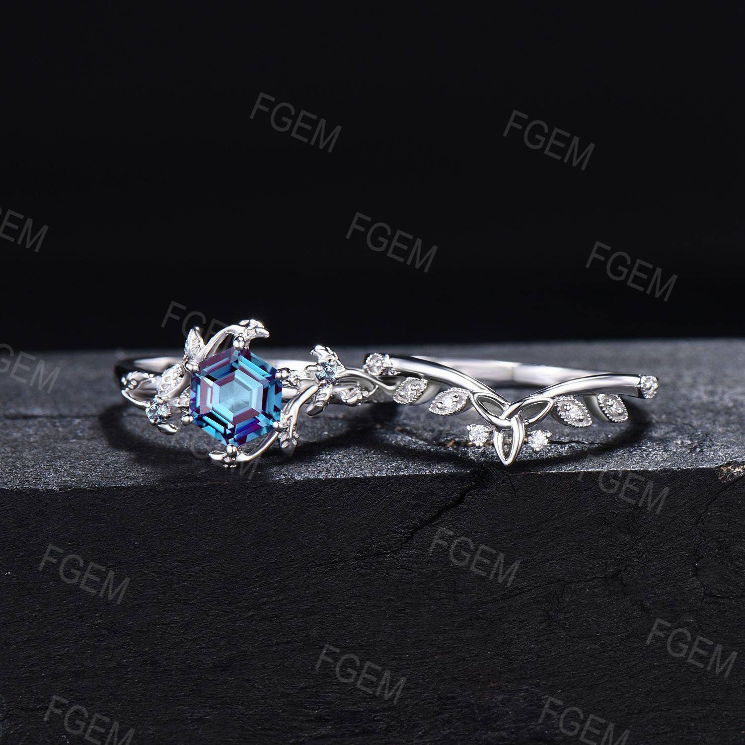 Nature Alexandrite Wedding Ring Set 10K/14K/18K Rose Gold Unique 1ct Hexagon Alexandrite Leaf Ring Set Celtic Knot Bridal Set Promise Ring