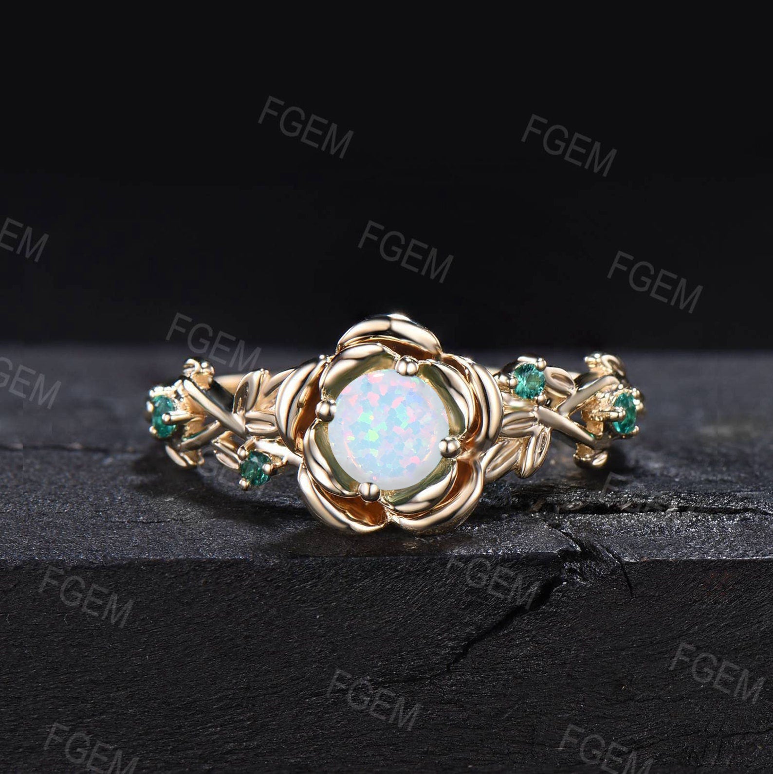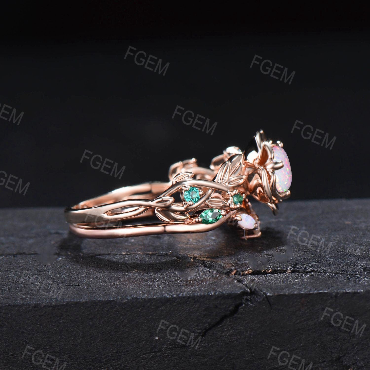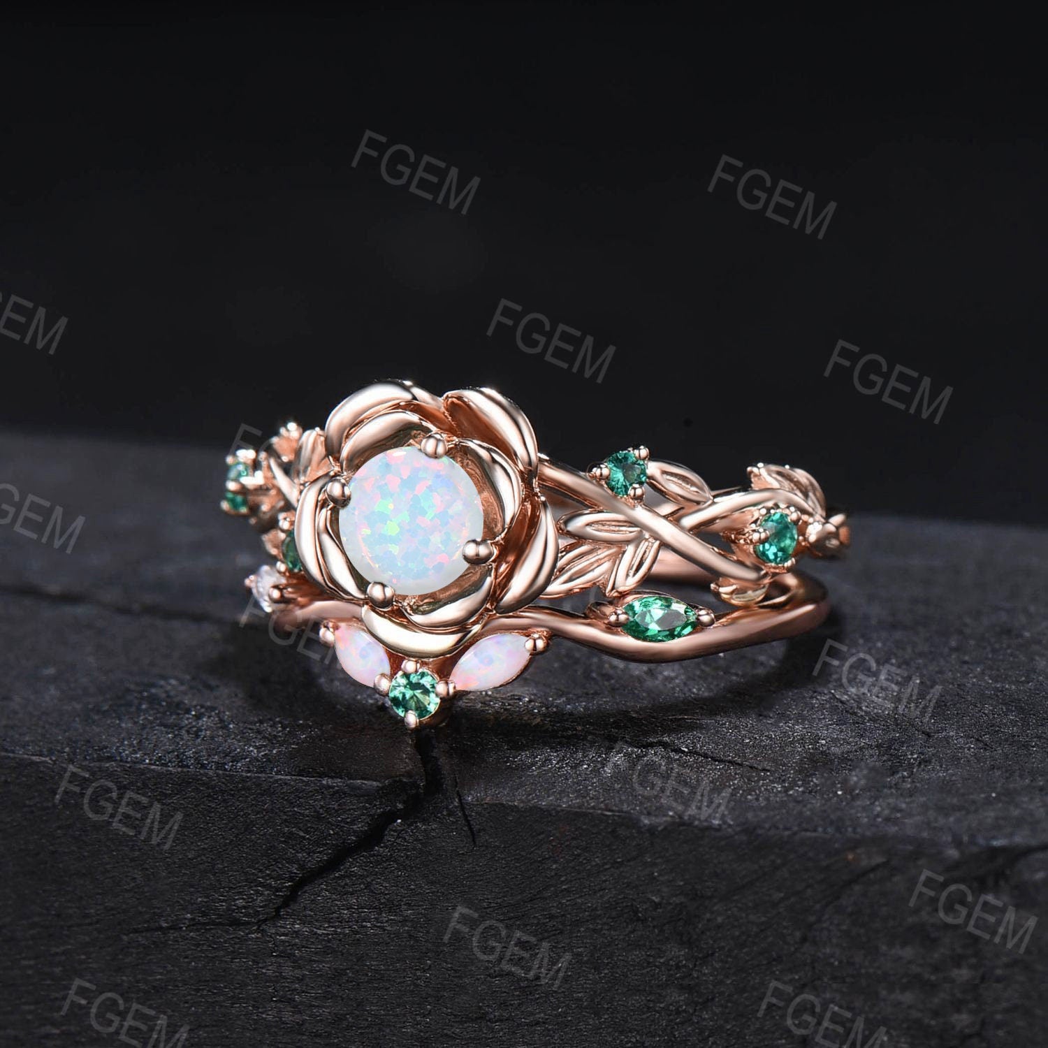 Nature Inspired 5mm Round Cut White Opal Emerald Engagement Ring Set 10K Rose Gold Twist Leaf Vine Rose Flower Floral Opal Wedding Ring Set