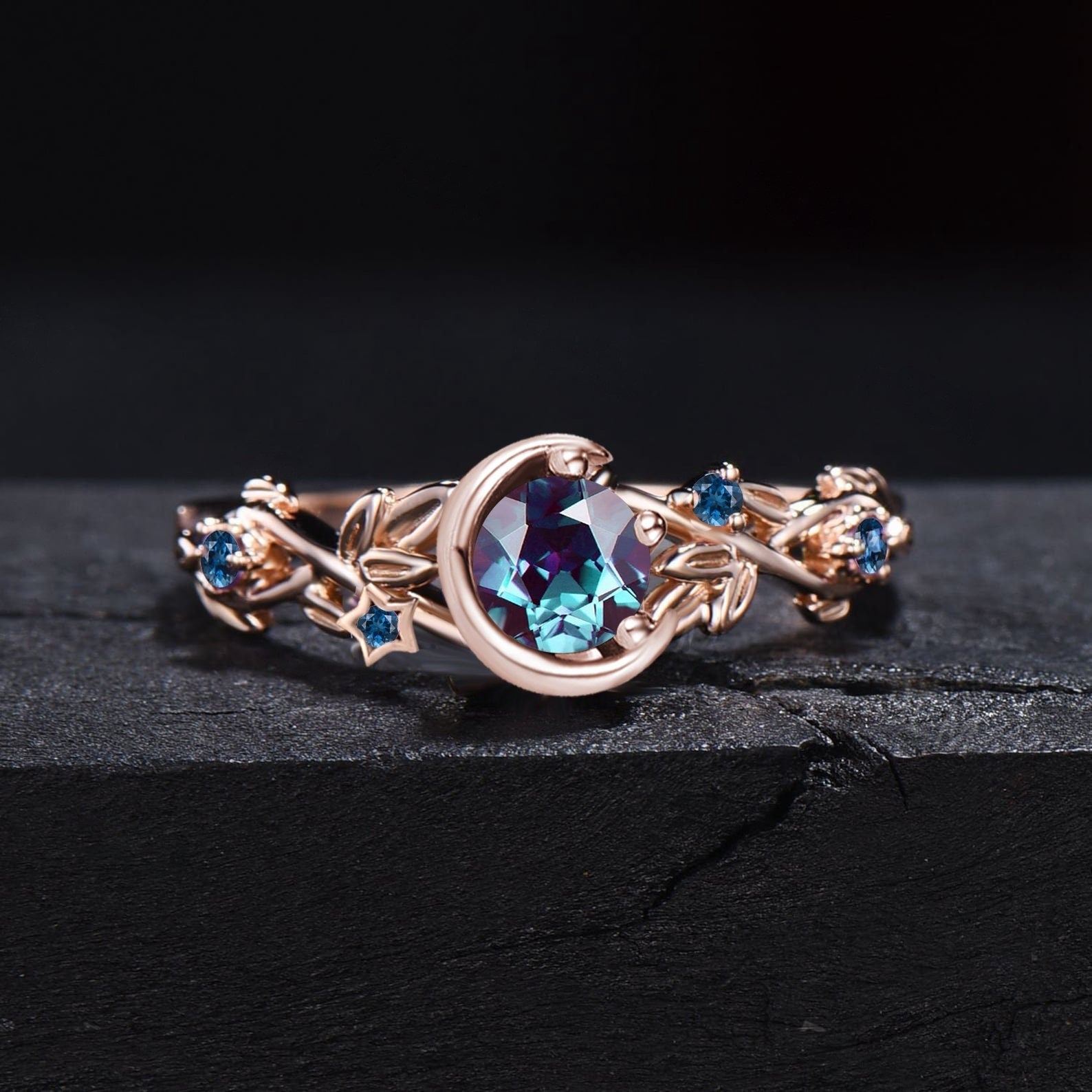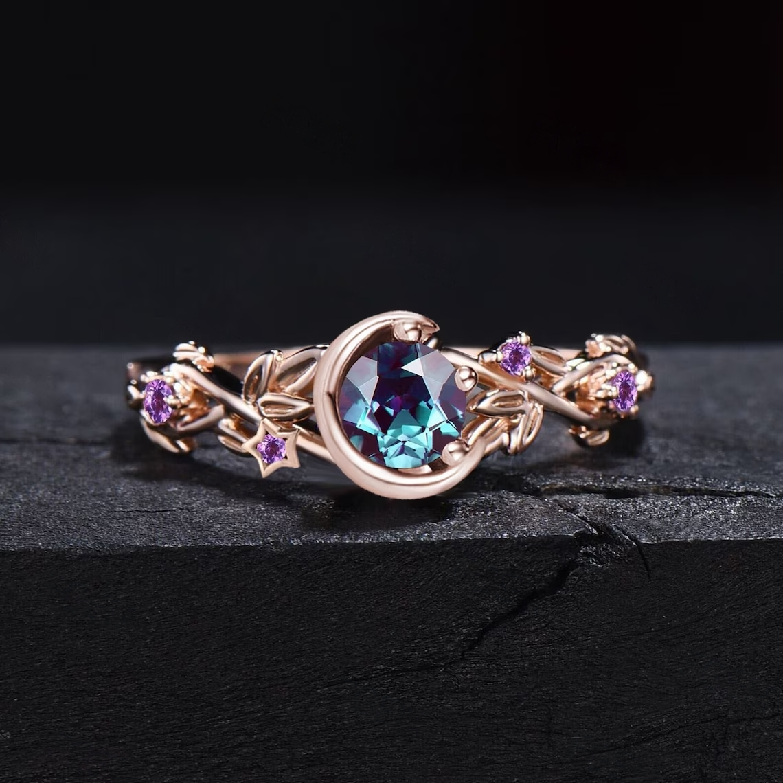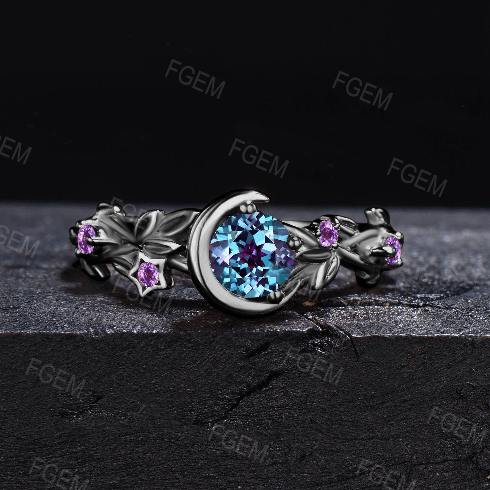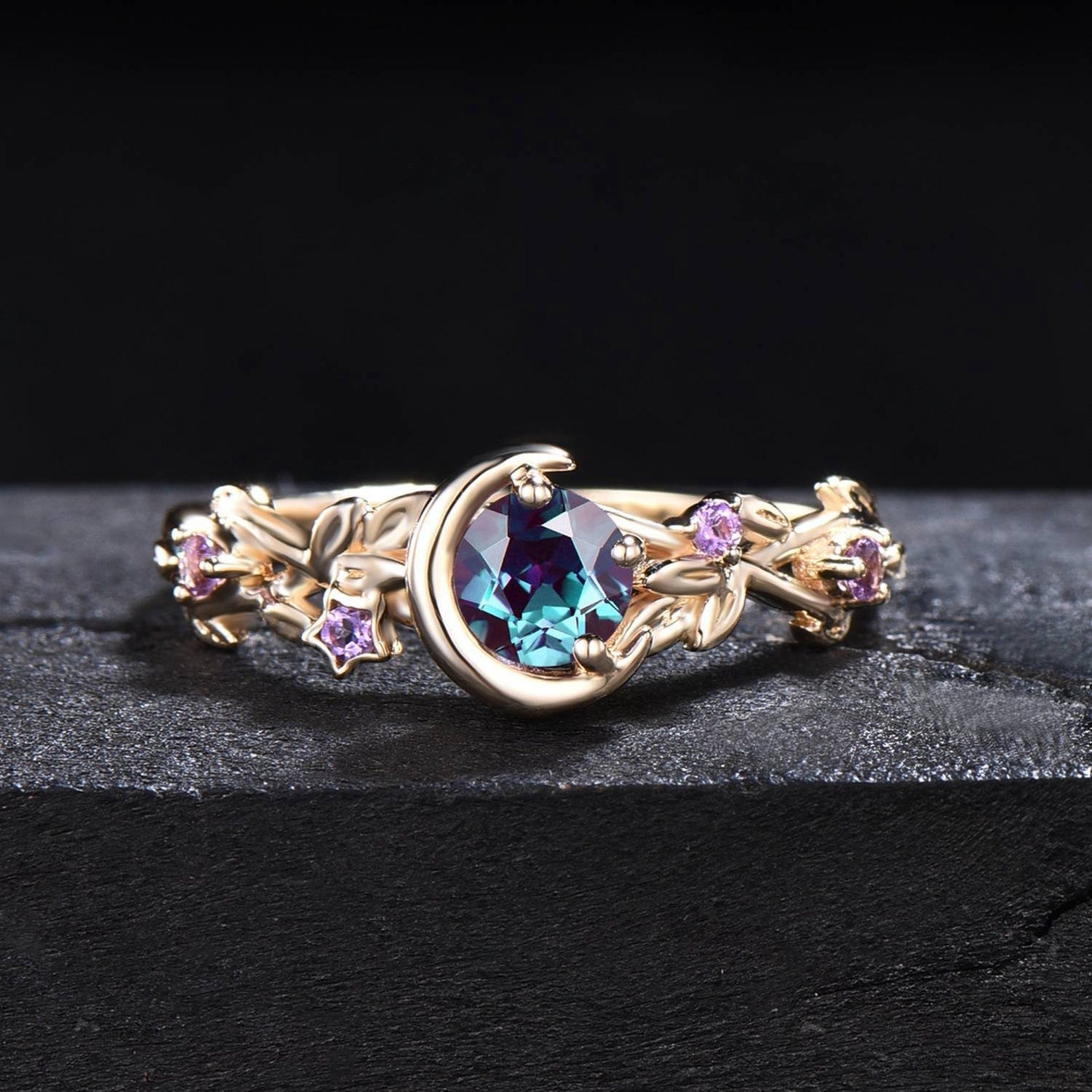Nature Inspired Color-Change Alexandrite Amethyst Engagement Ring Moon Star Design Round Alexandrite Ring Branch Leaf Amethyst Wedding Ring