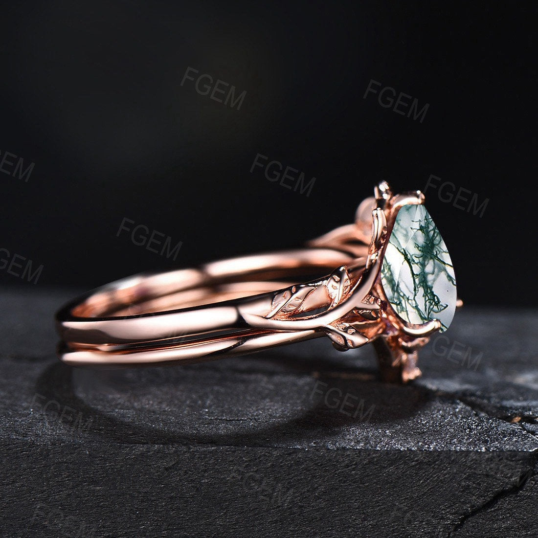 Nature Inspired Engagement Rings Sets 14K Rose Gold Pear Shaped Natural Moss Agate Leaf Wedding Ring Unique Solitaire Rings Anniversary Gift