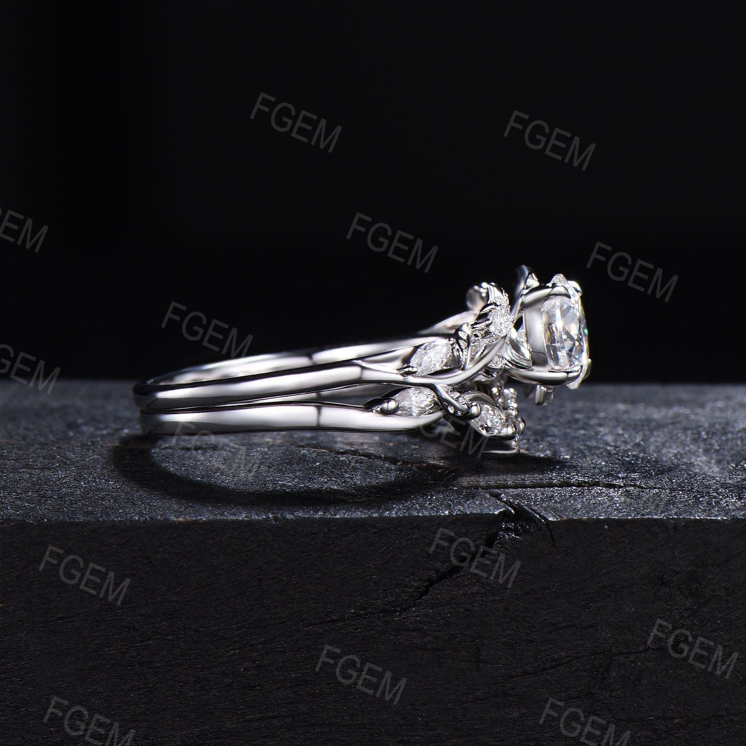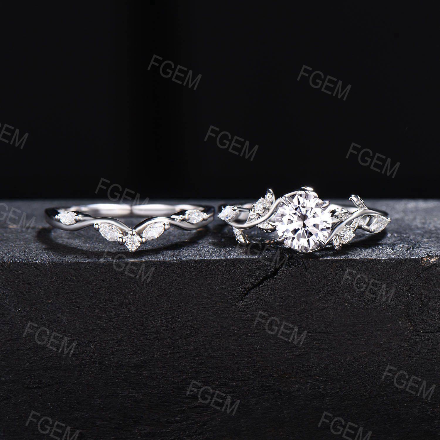 Nature Inspired Moissanite Engagement Ring Set 1ctw 6.5mm Round Cut Moissanite Diamond Cluster Wedding Ring Set Leaf Vine Branch Bridal Set