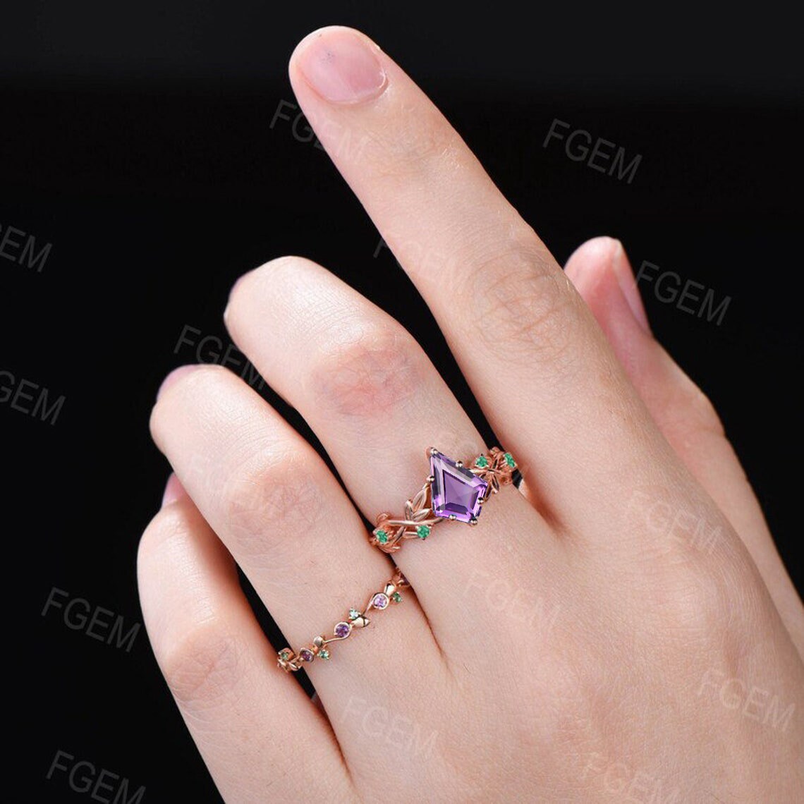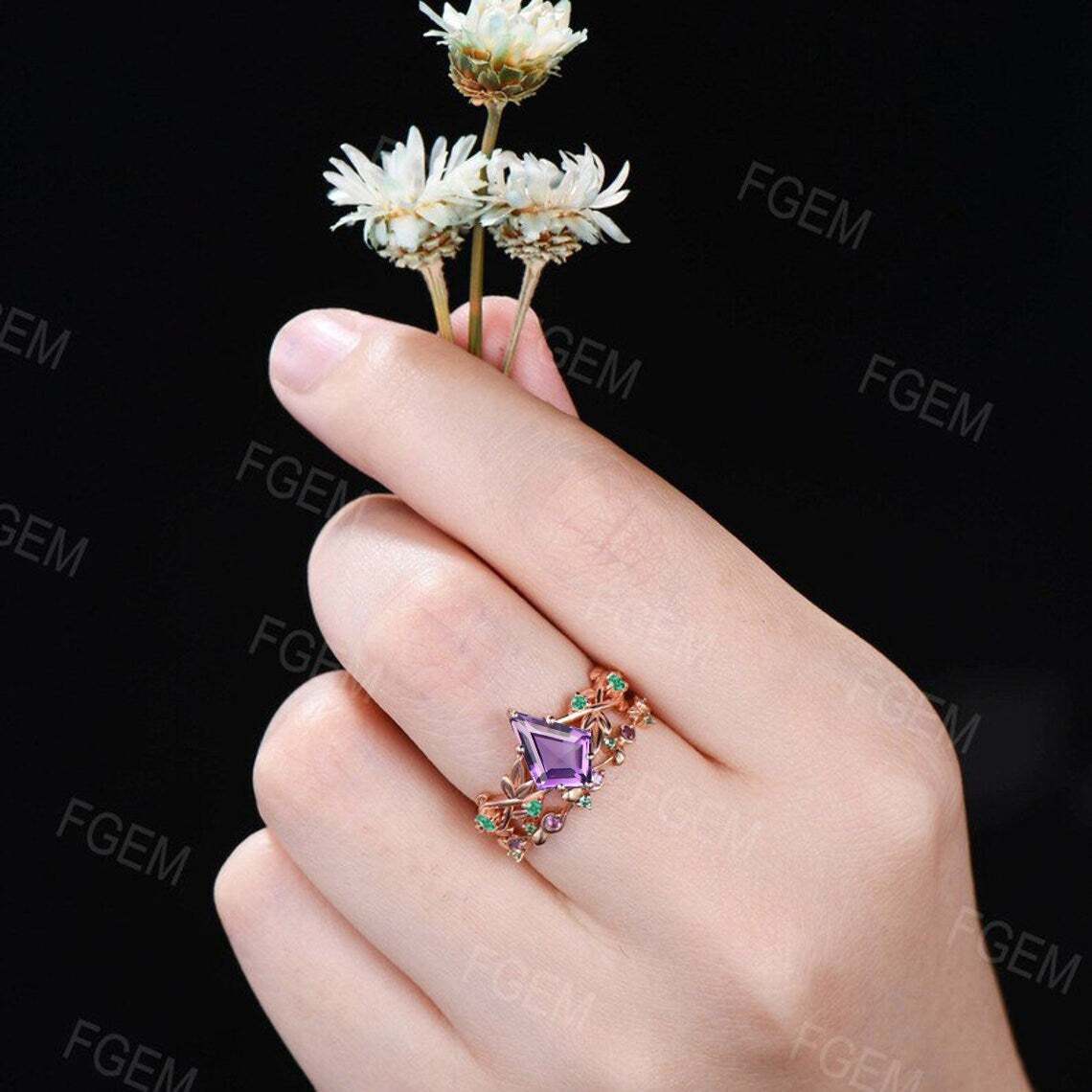 Nature Inspired Natural Amethyst Bridal Set Kite Cut Leaf Amethyst Engagement Ring Purple Crystal Wedding Ring Emerald Amethyst Wedding Band