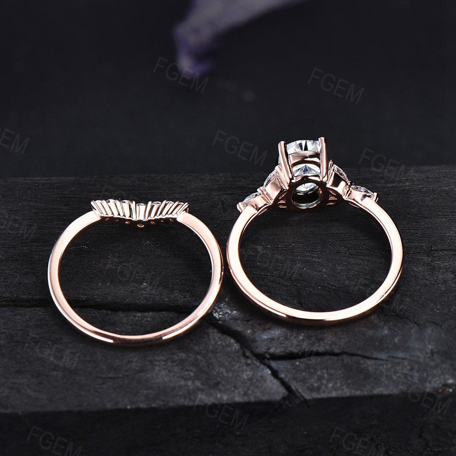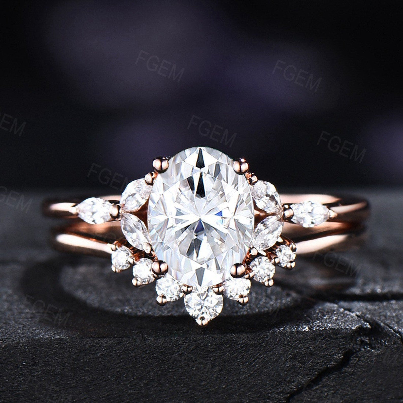Oval Diamond Ring Set Solid Gold Moissanite Engagement Ring Vintage 1.5ct Bridal Wedding Ring Set Curved Stacking Band Gift for Women