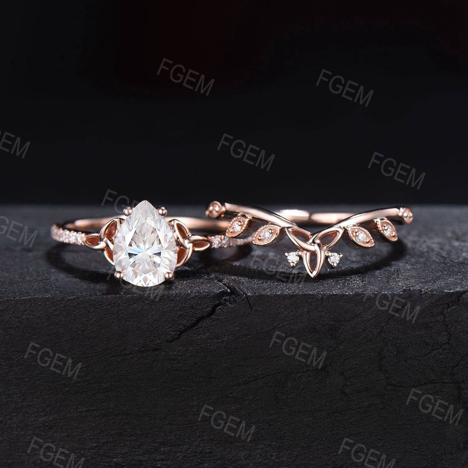 1.25ct Pear Cut Moissanite Celtic Engagement Ring Set Half Eternity Band Moissanite Diamond Trinity Knot Wedding Ring Leaf Moissanite Bridal Set
