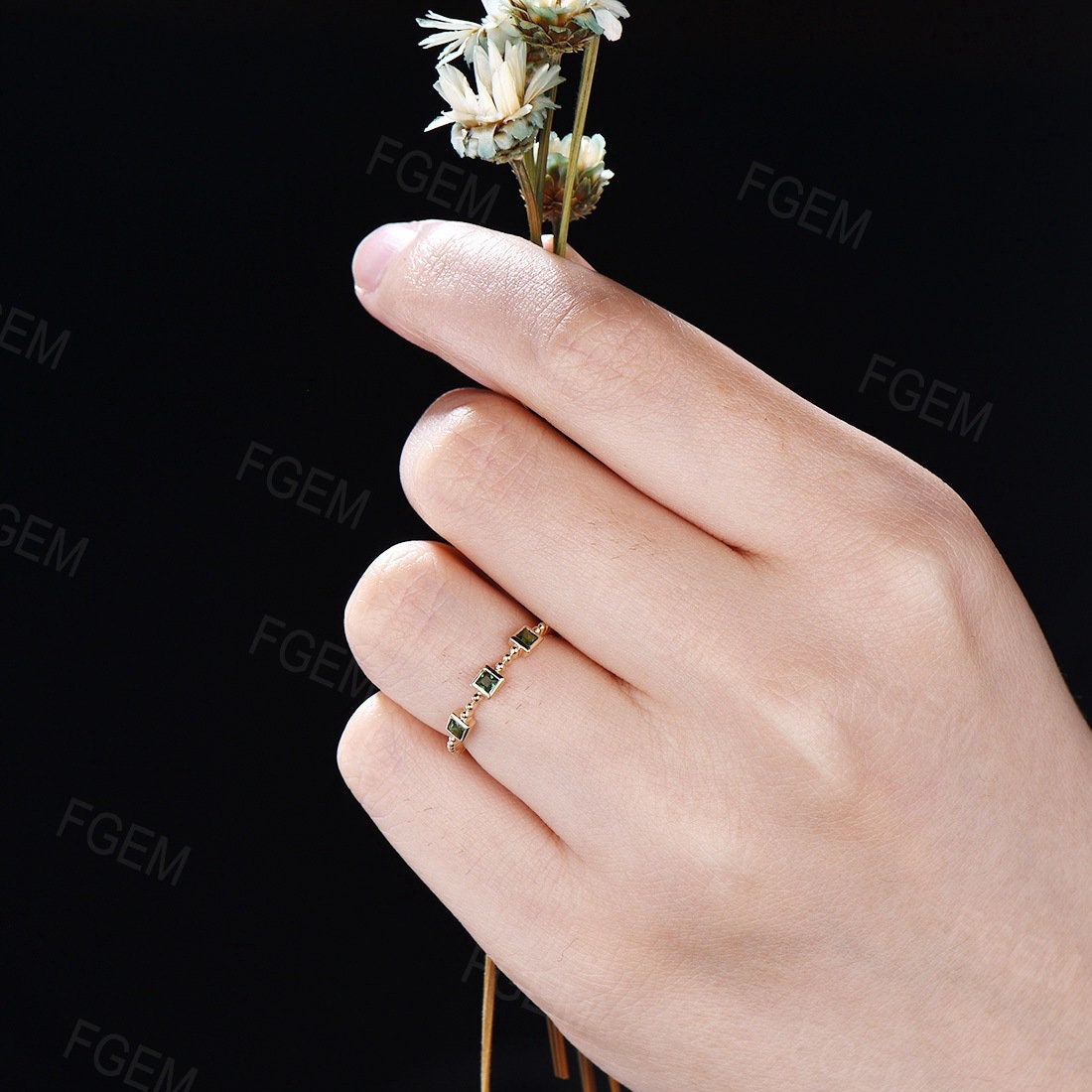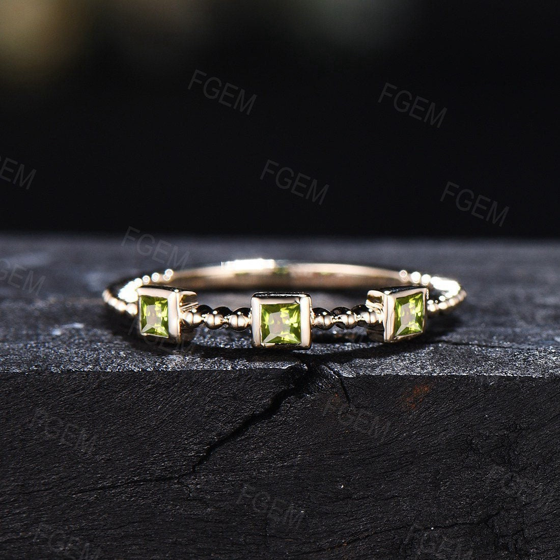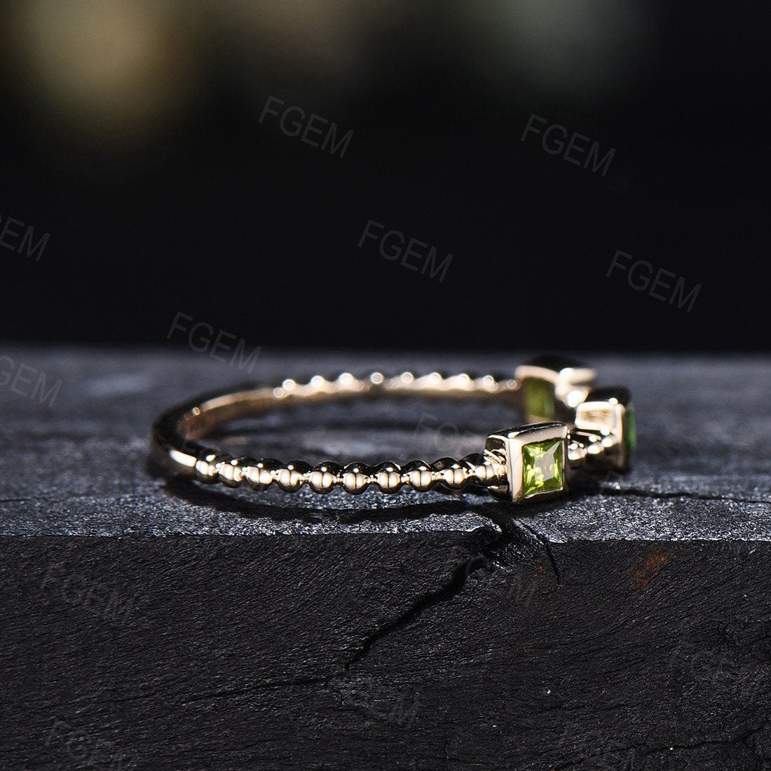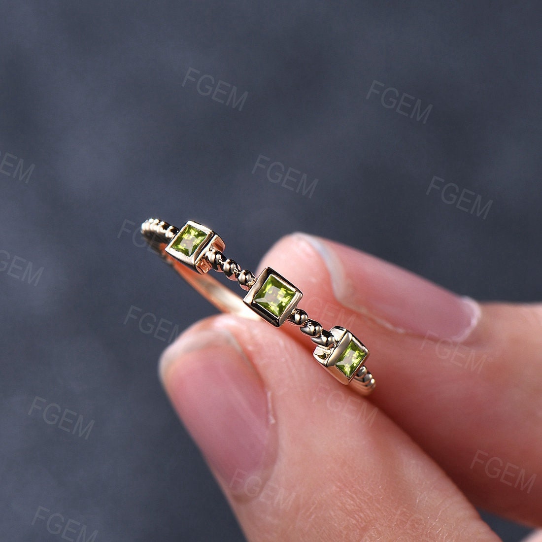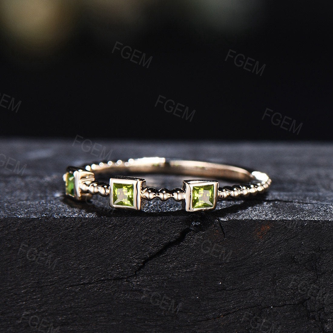 Princess Cut Natural Peridot Wedding Band August Birthstone Ring Dainty Beaded Band Engagement Ring Stacking Minimalist Jewelry For Women