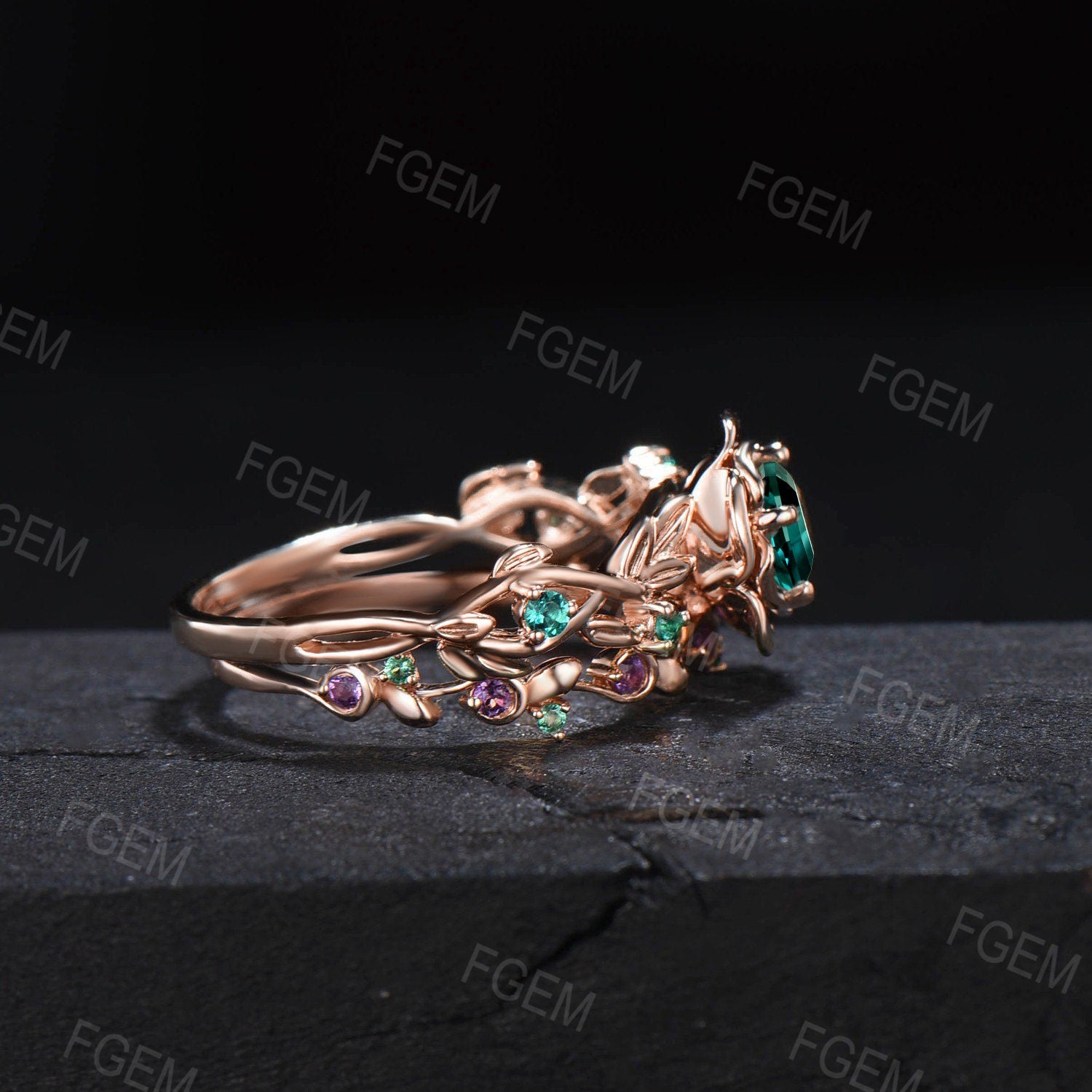 Rose Flower Green Emerald Engagement Ring Set Round Emerald Amethyst Wedding Ring Nature Inspired Floral Ring Leaf Emerald Ring Promise Gift