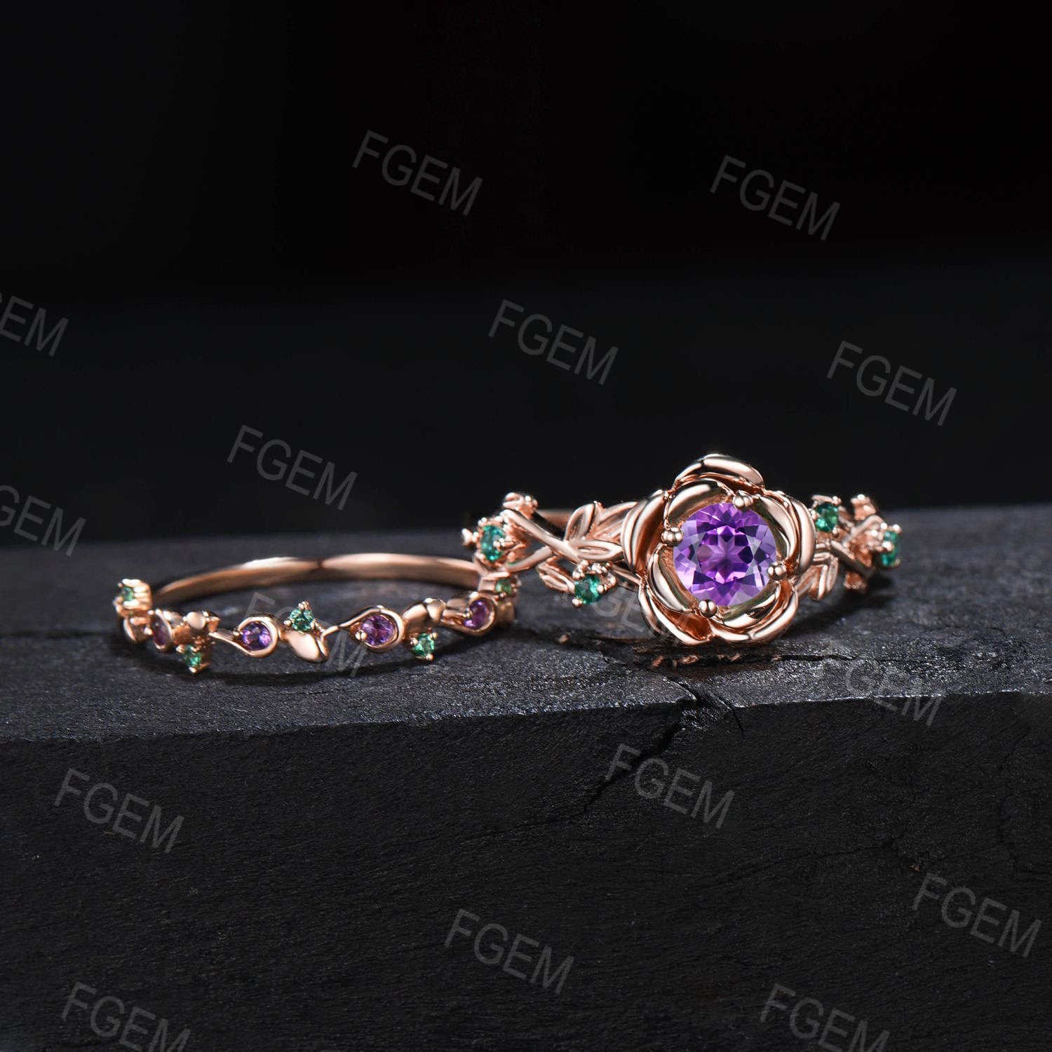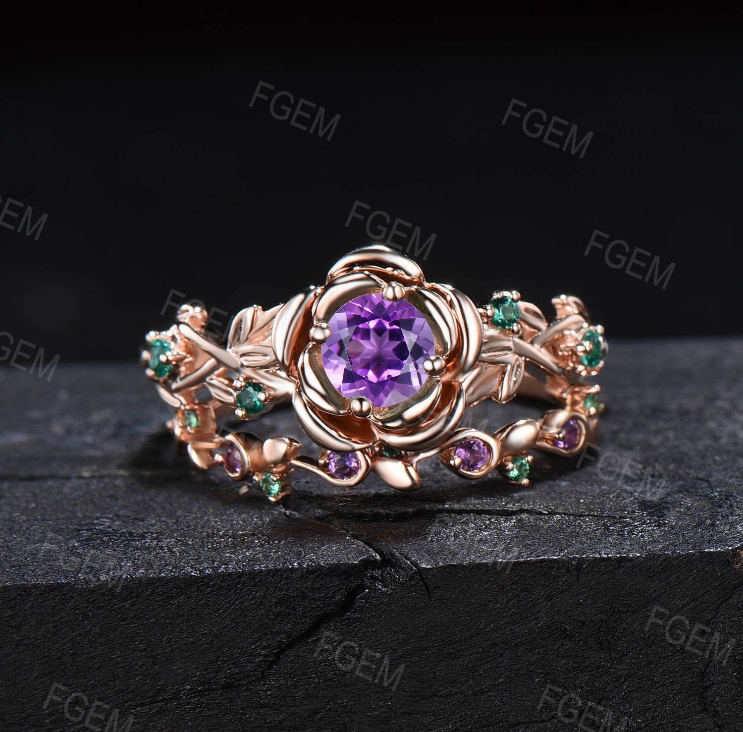 Rose Flower Natural Amethyst Bridal Set Leaf Nature Inspired Round Emerald Amethyst Engagement Ring Set Real Crystal Twig Vine Wedding Ring