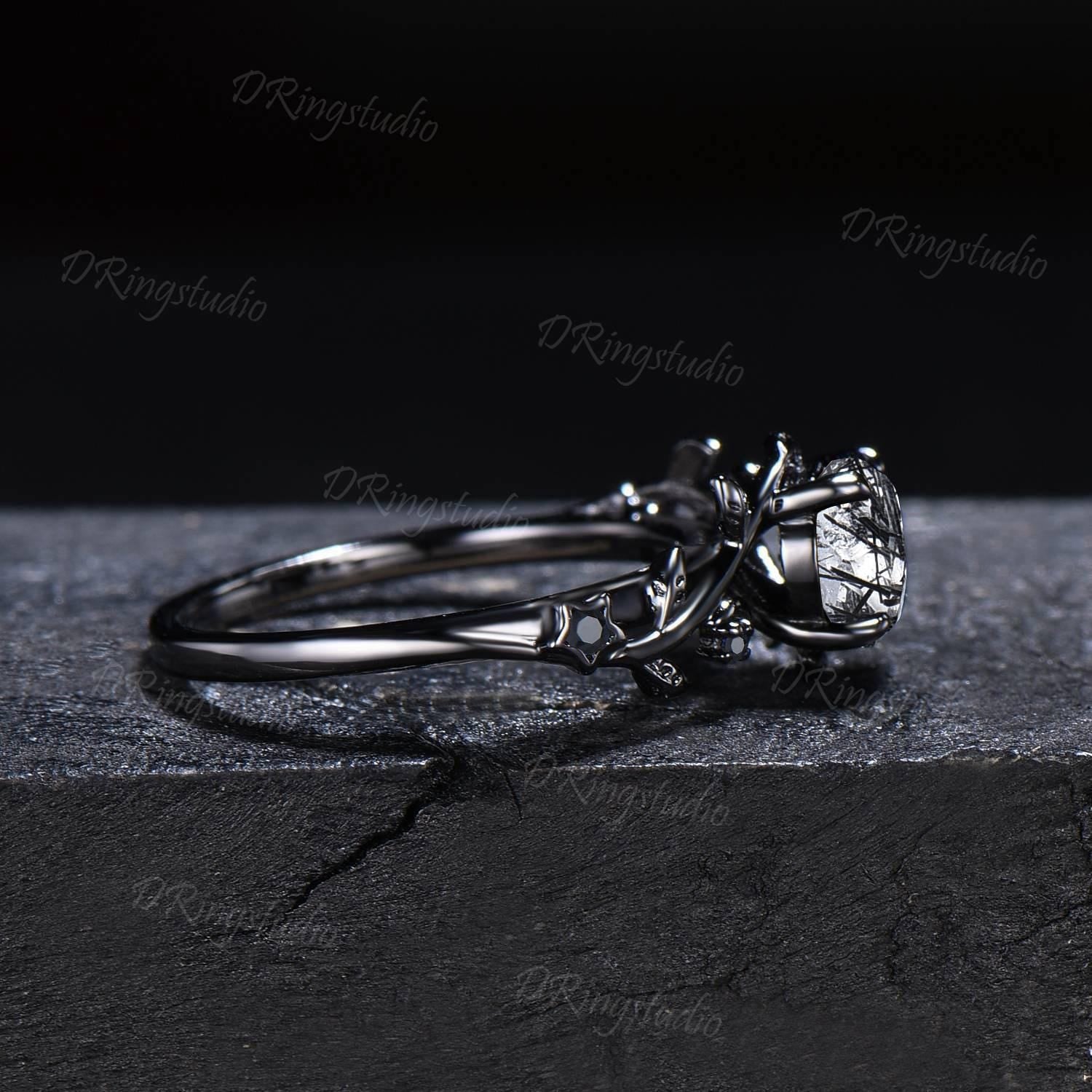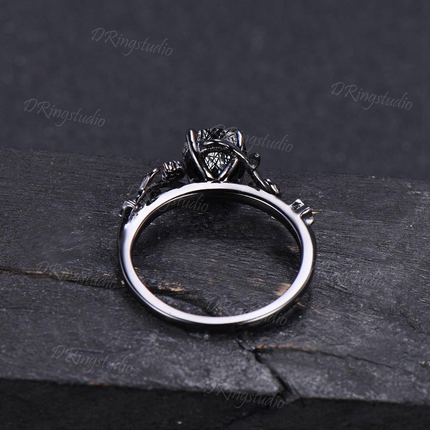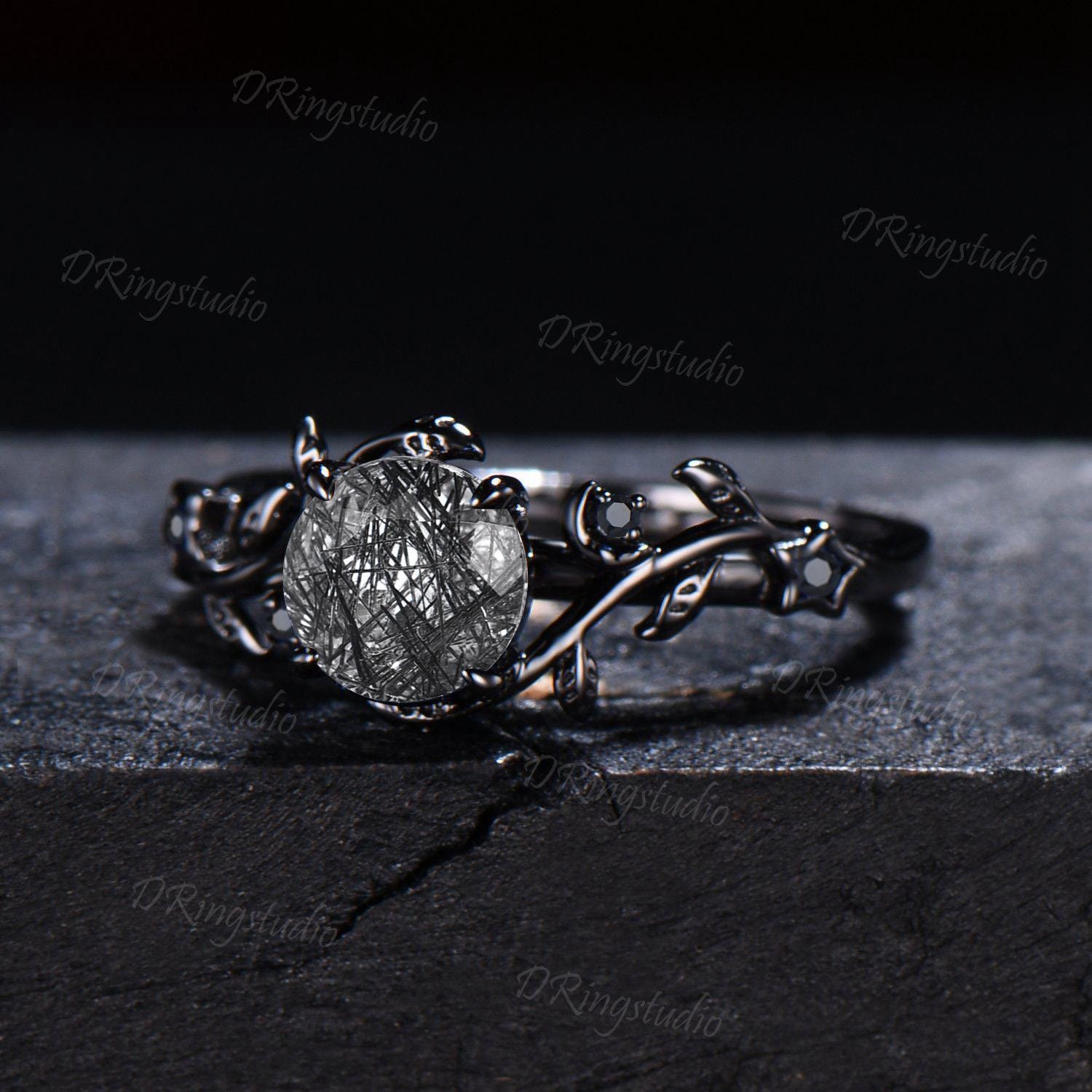 Round Black Rutilated Quartz Engagement Ring Nature Inspired Black Gold Leaf Vine Wedding Ring Celestial Black Gemstone Ring Proposal Gift