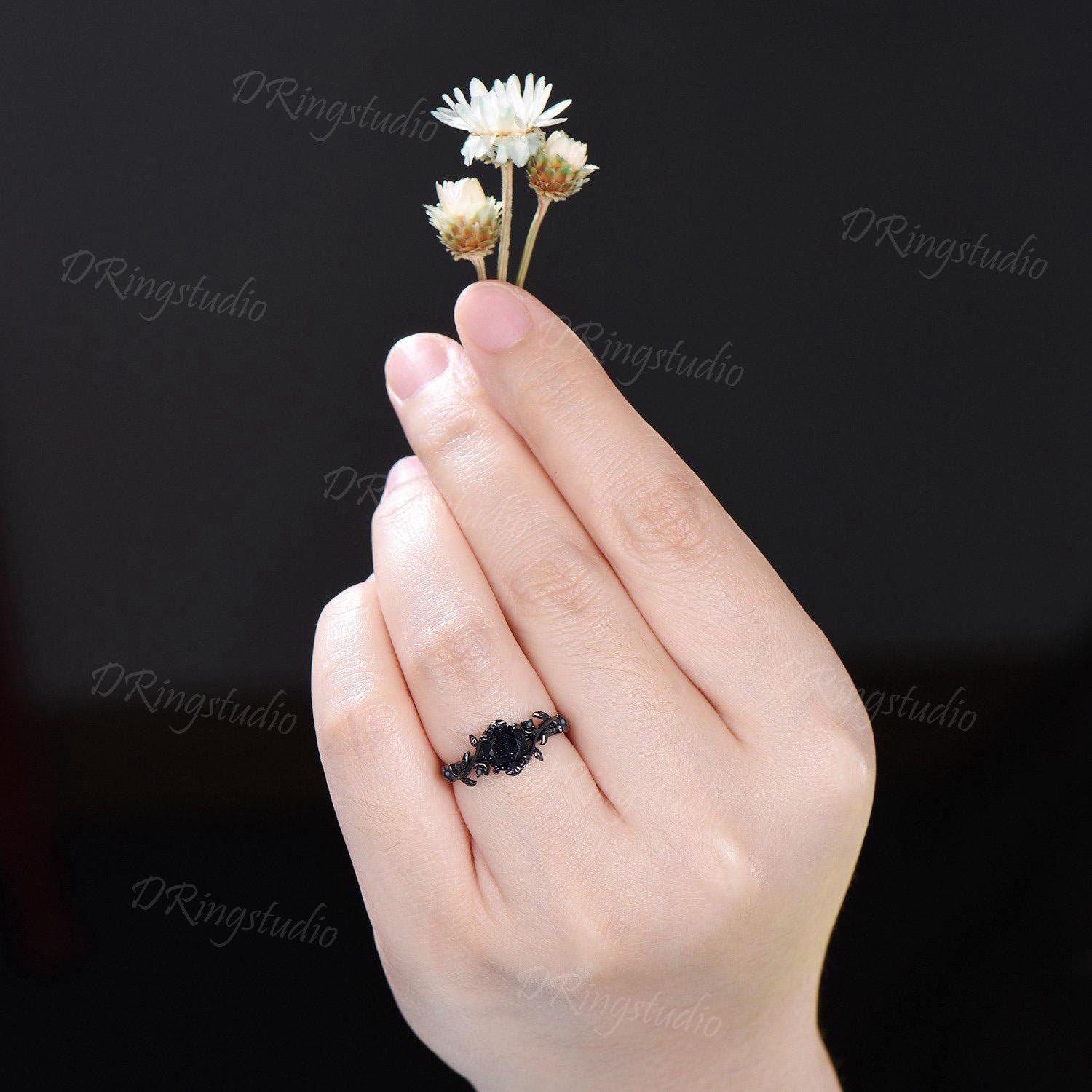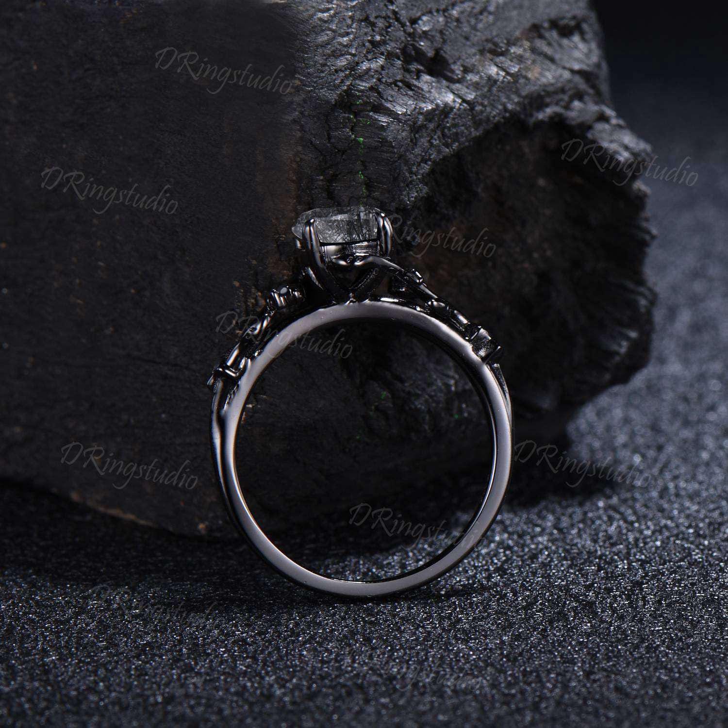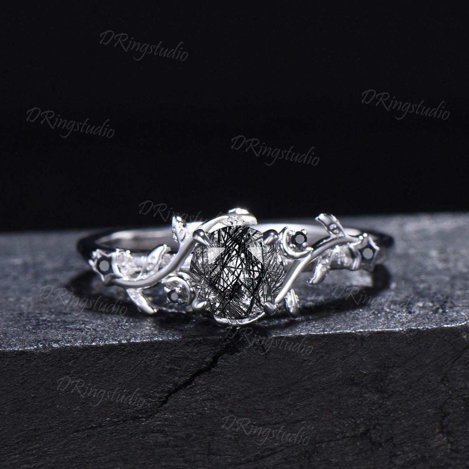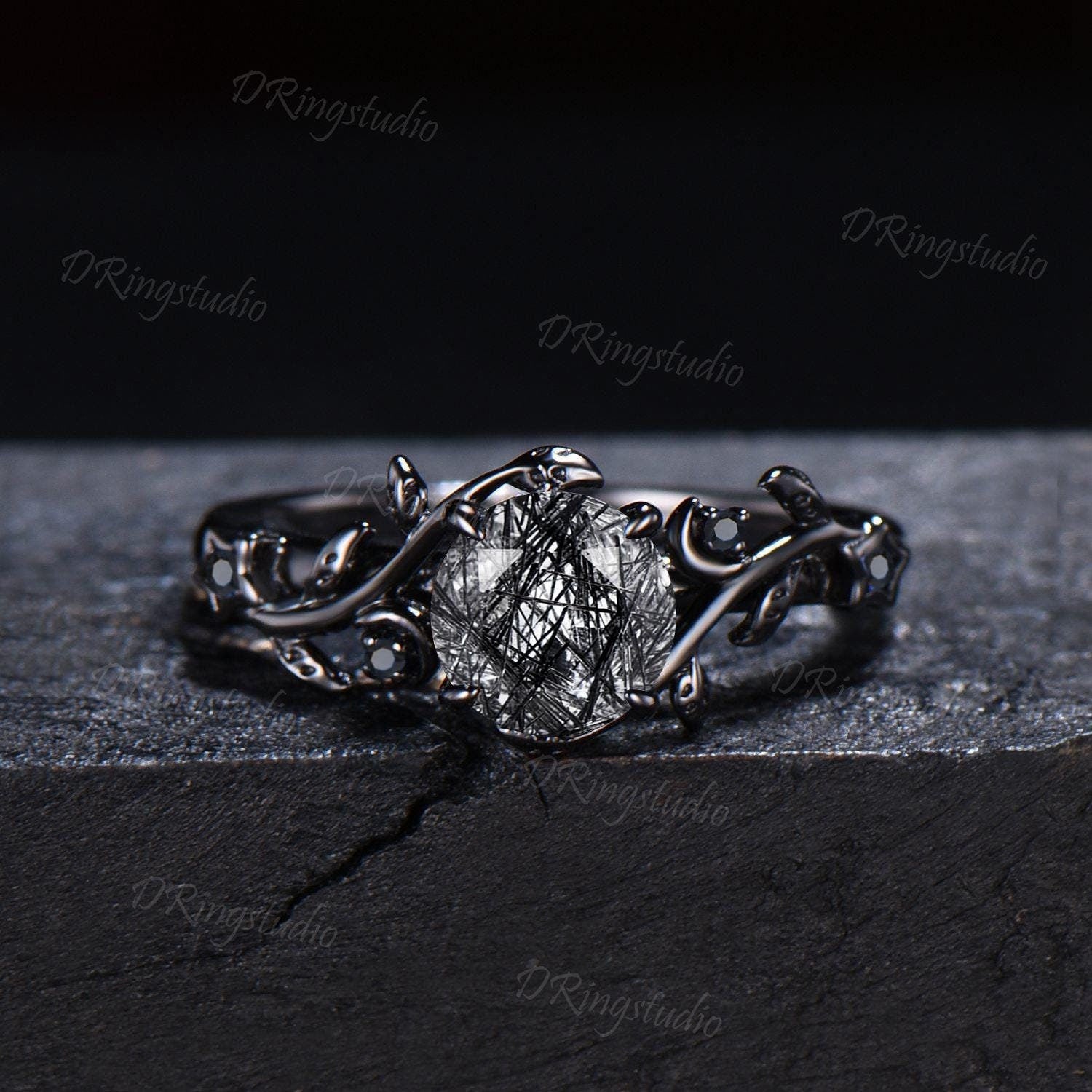 Round Black Rutilated Quartz Engagement Ring Nature Inspired Black Gold Leaf Vine Wedding Ring Celestial Black Gemstone Ring Proposal Gift