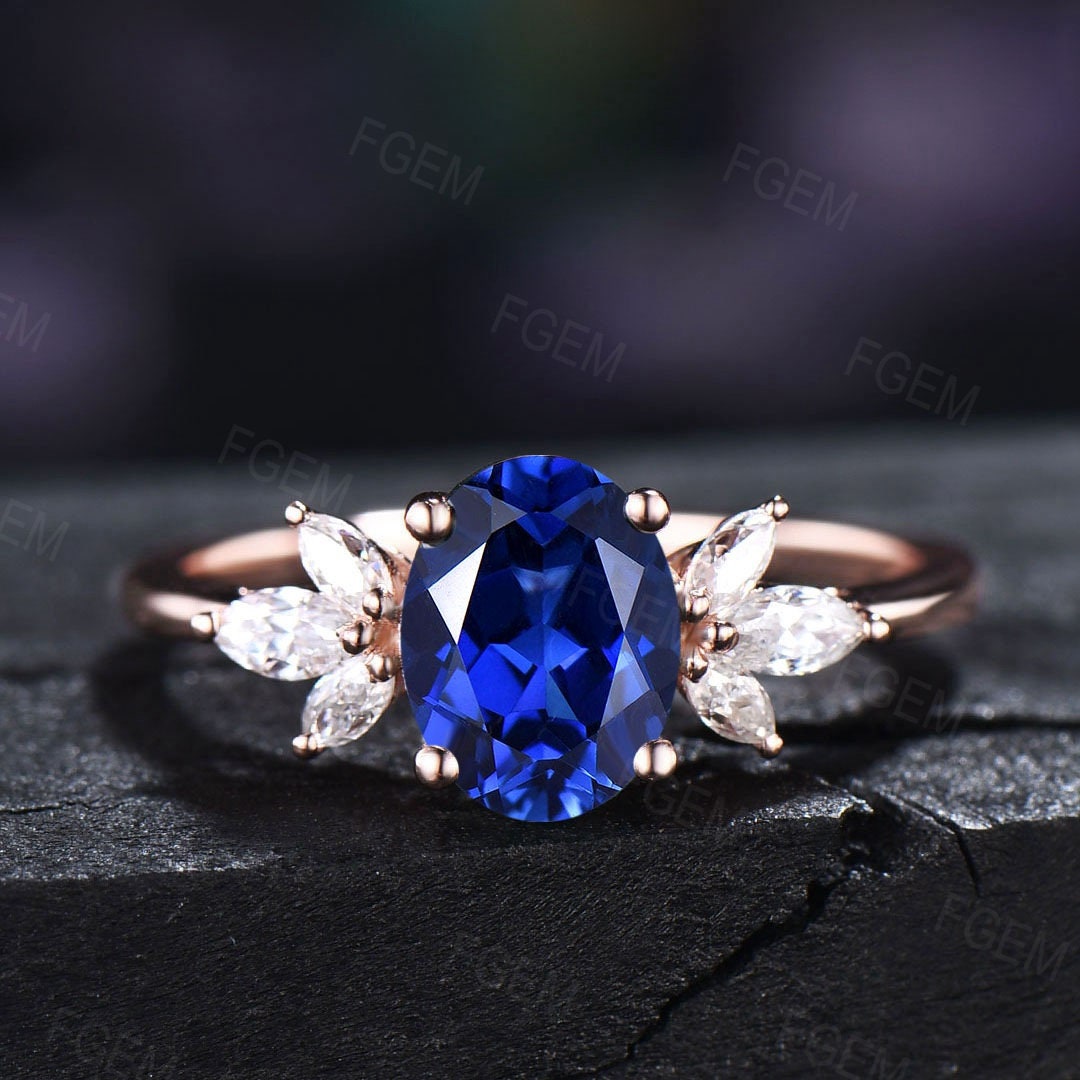 Main stone : 6x8mm oval cut Lab created blue Sapphire ring