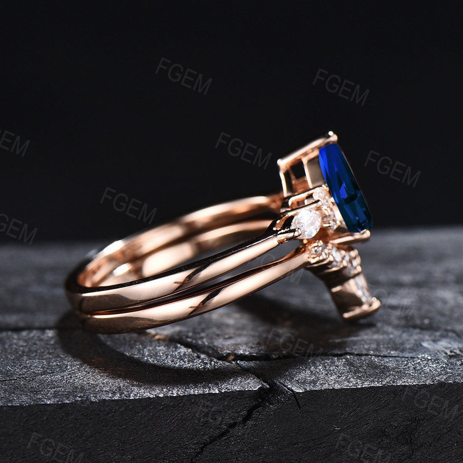 Sterling Silver Blue Sapphire Engagement Ring Set Vintage 1.25ct Pear Shaped Blue Sapphire Bridal Set September Birthstone Gift Promise Ring