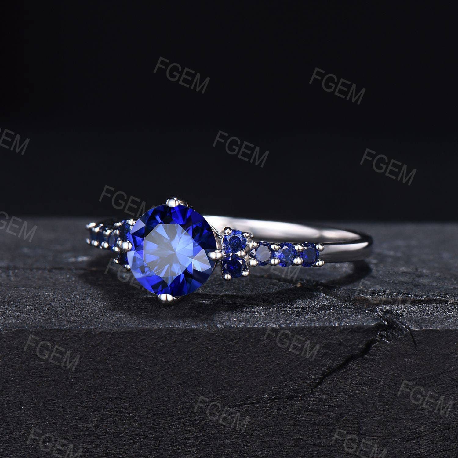 Sterling Silver Blue Sapphire Engagement Ring Vintage 7mm Round Cut Sapphire Wedding Ring September Birthstone Platinum Promise Ring Women